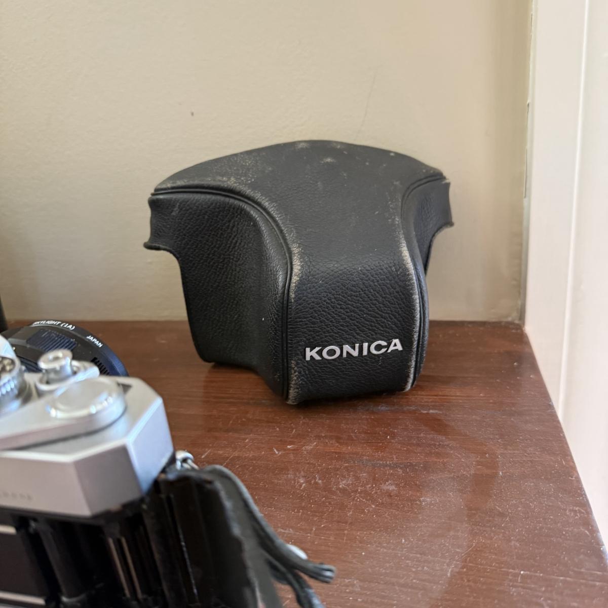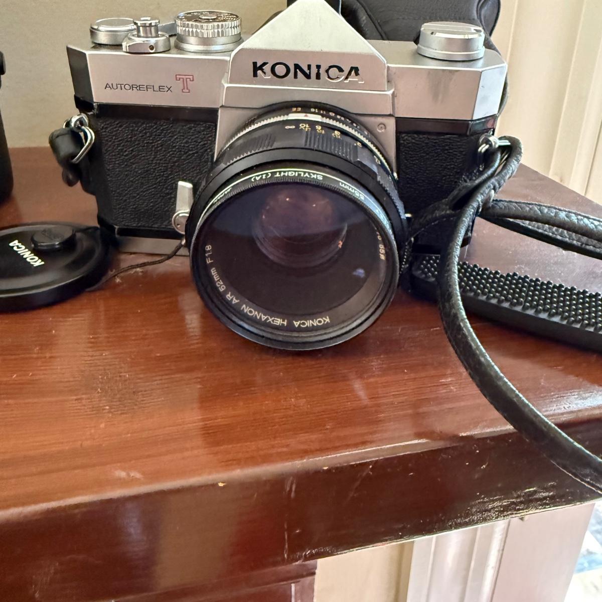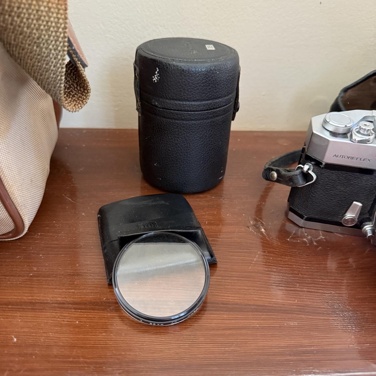 Comes With Konica Auto reflex T. Spare lens carrying case spare HCE 55 mm UV lens comes with auto flex T leather cover case . Comes with manual and costar camera shoulder bang