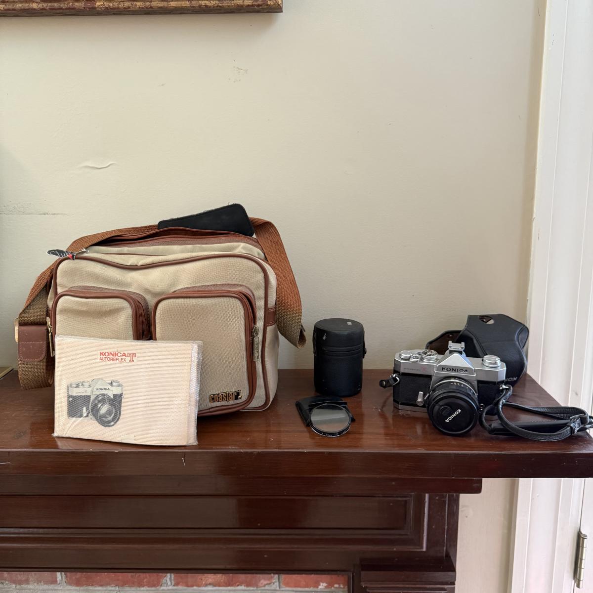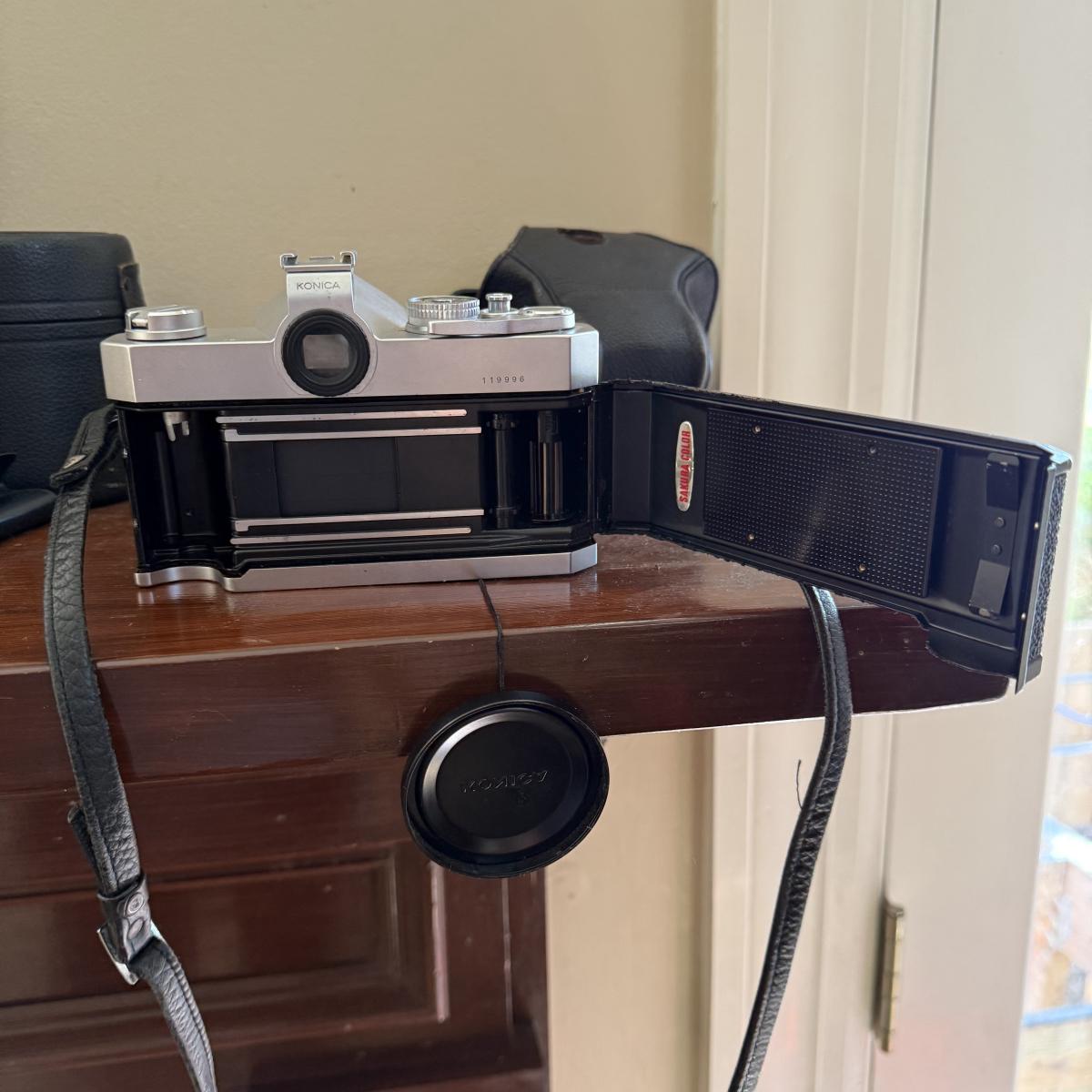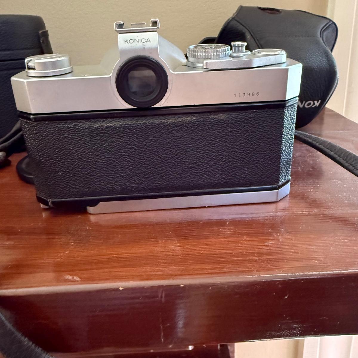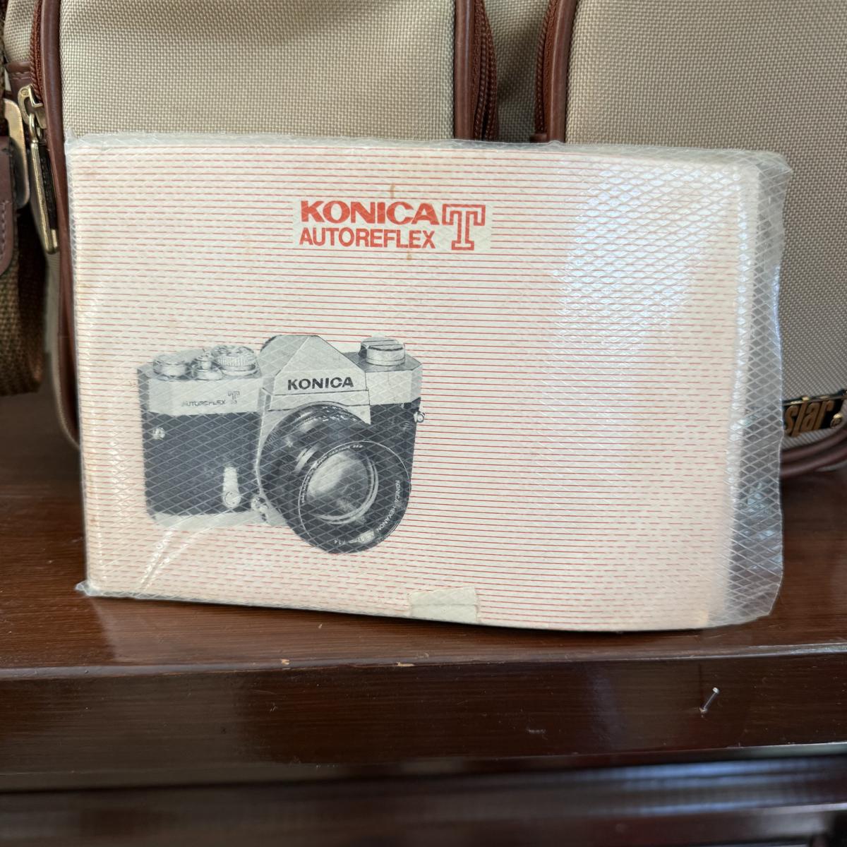 Comes With Konica Auto reflex T. Spare lens carrying case spare HCE 55 mm UV lens comes with auto flex T leather cover case . Comes with manual and costar camera shoulder bang