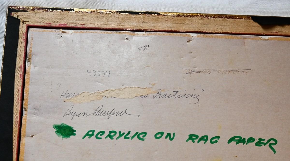"- Practicing" by artist Byron Burford (American, 1920-2011). Acrylic on rag paper. Approx. 15" x 16.5". Please note, listed dimensions includes frame.