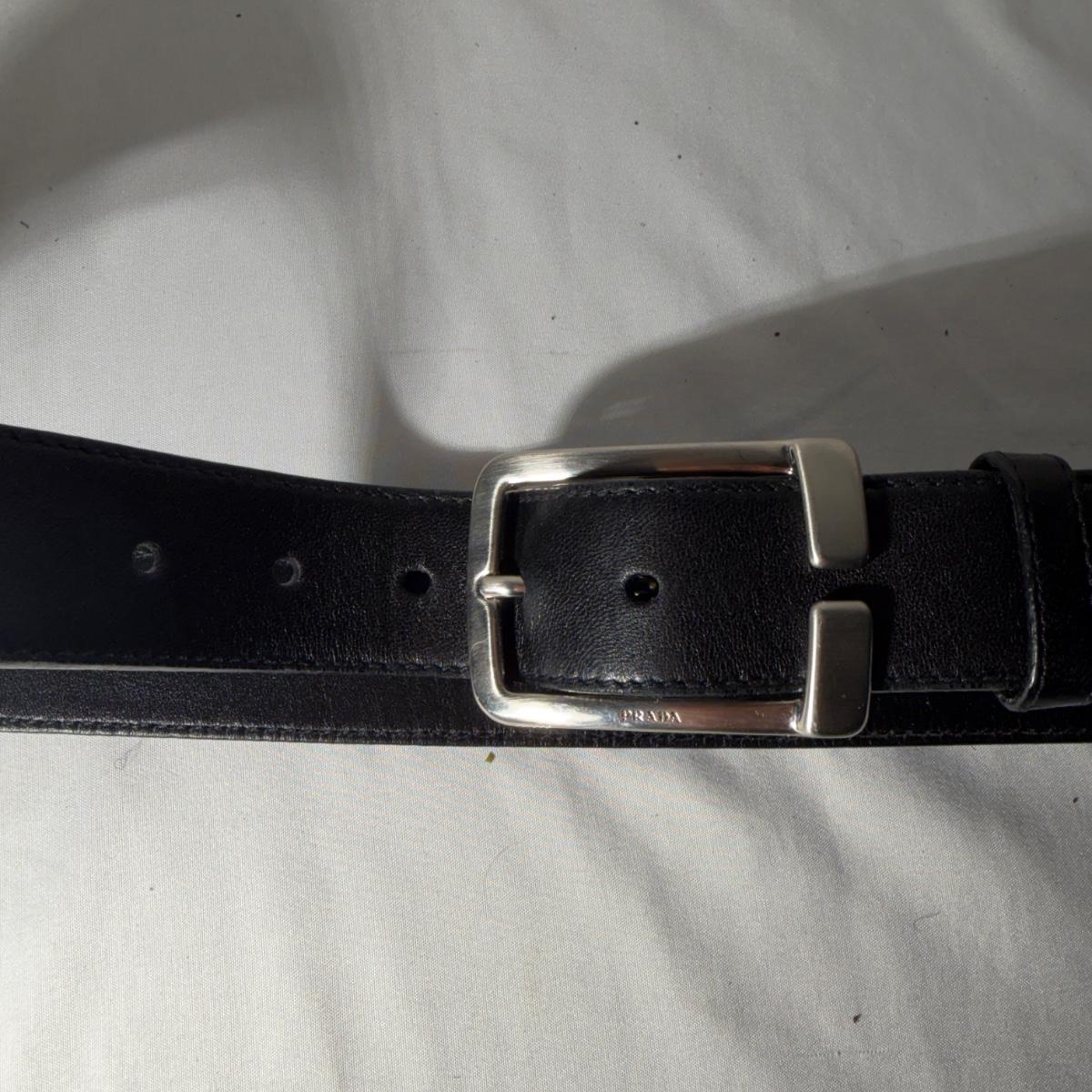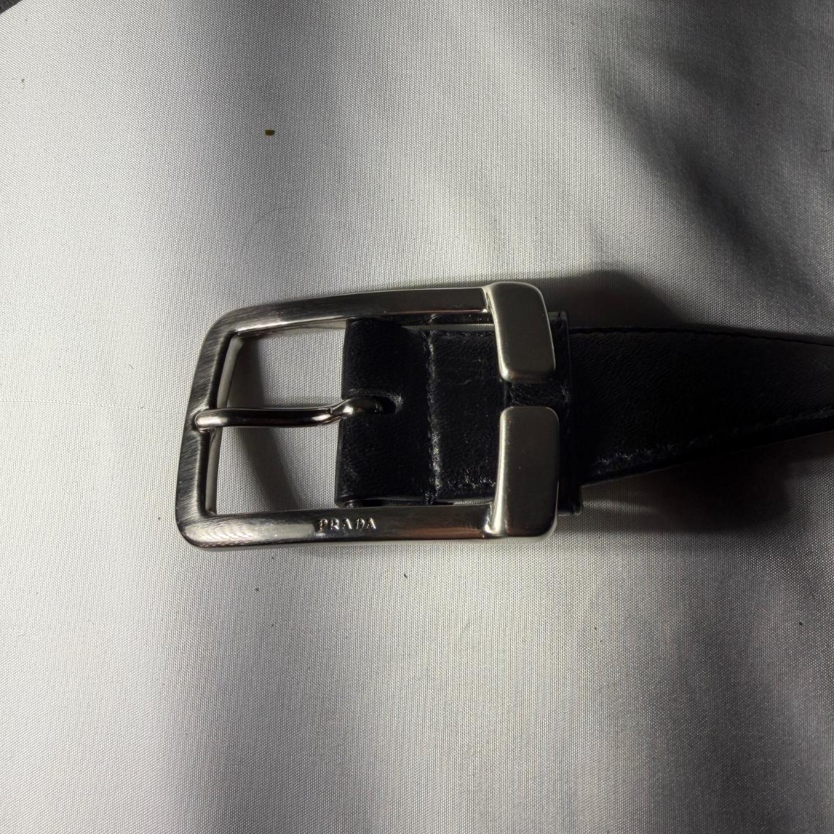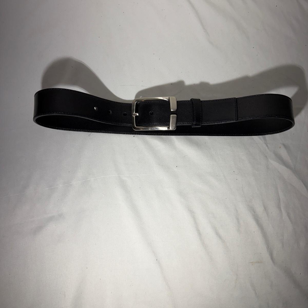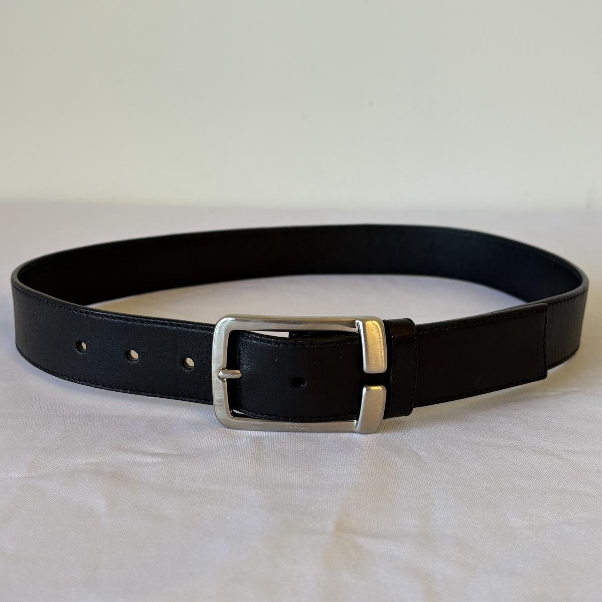 Lot includes a Prada black leather belt. Belt measures 38” long and comes with Prada bag.