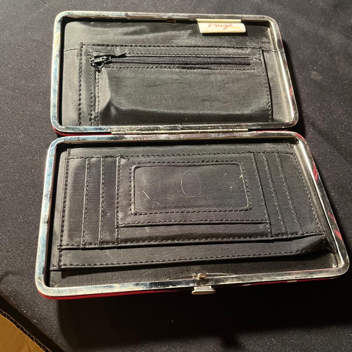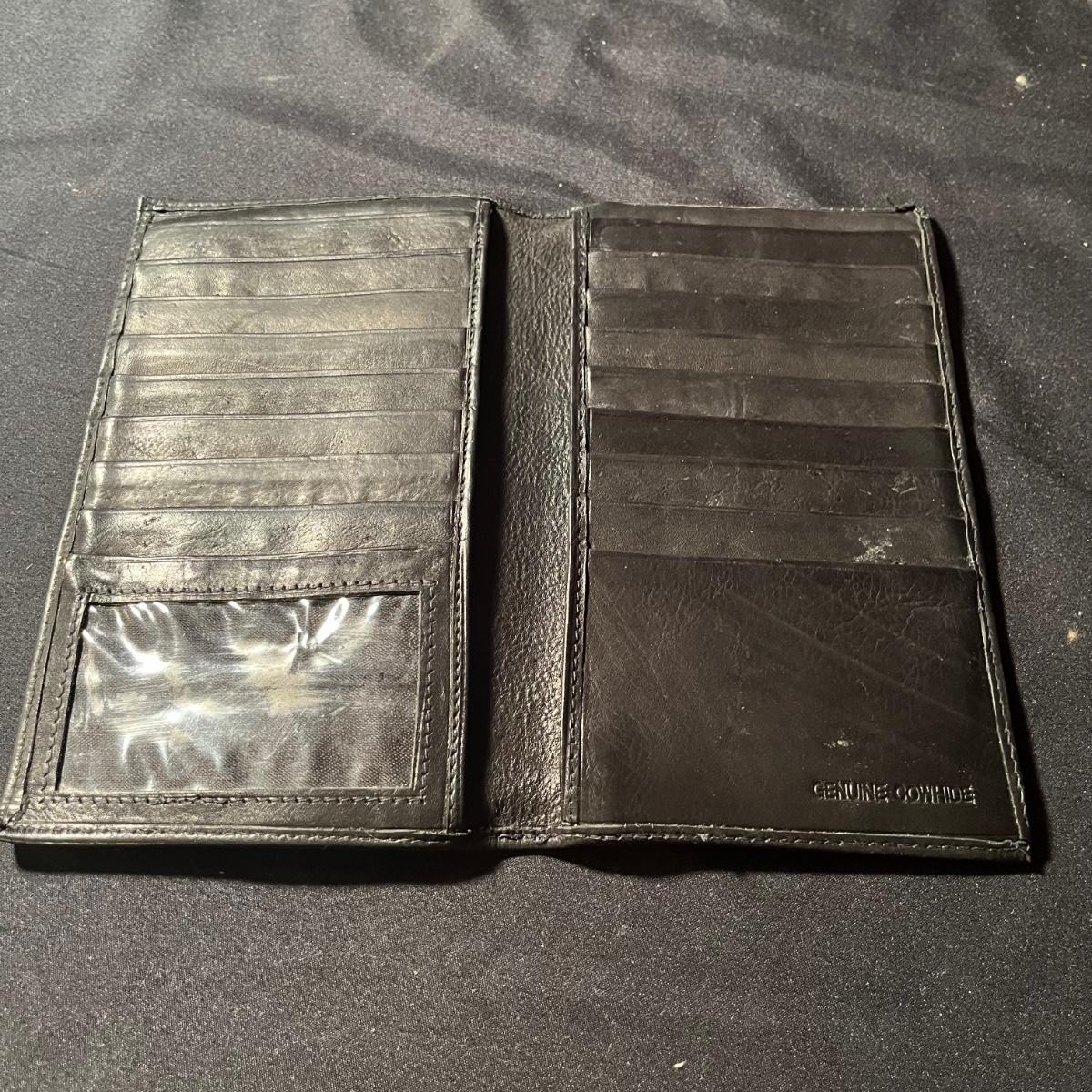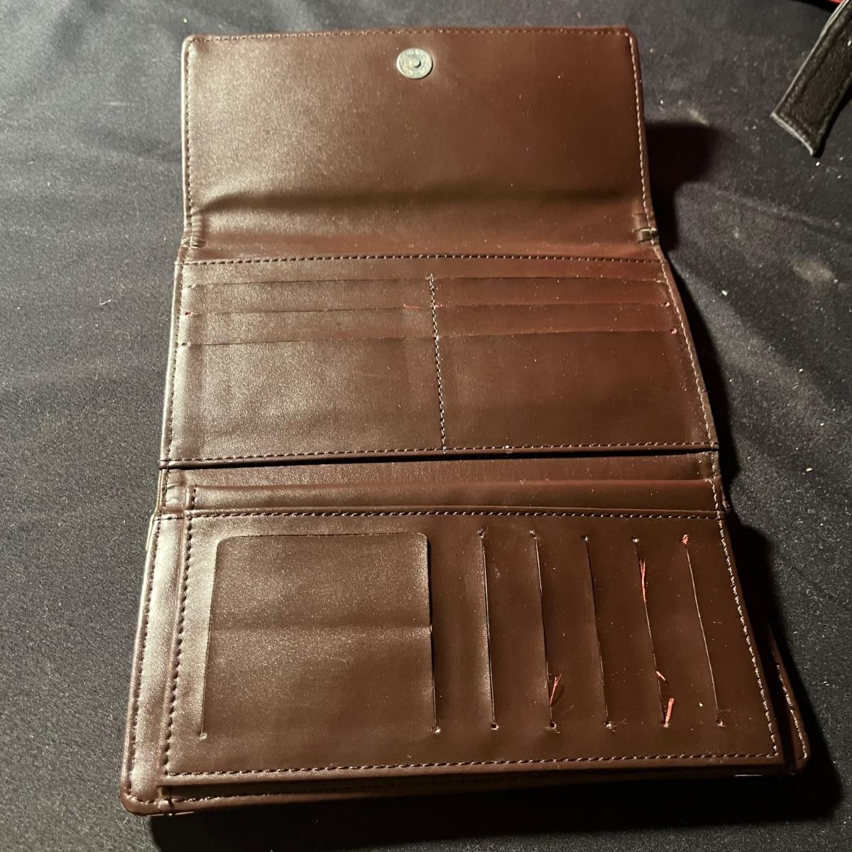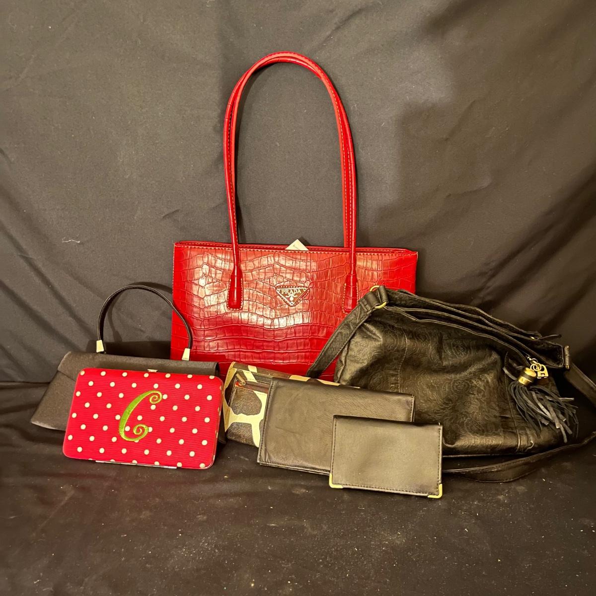 Lot includes Prada purse, two black unmarked purses with the material unknown, polka dot wallet, cow pattern wallet, black cowhide wallet and a small plastic wallet. We can not guarantee that the Prada purse is authentic. Prada purse measures 3” x 14” x 19” including handles.