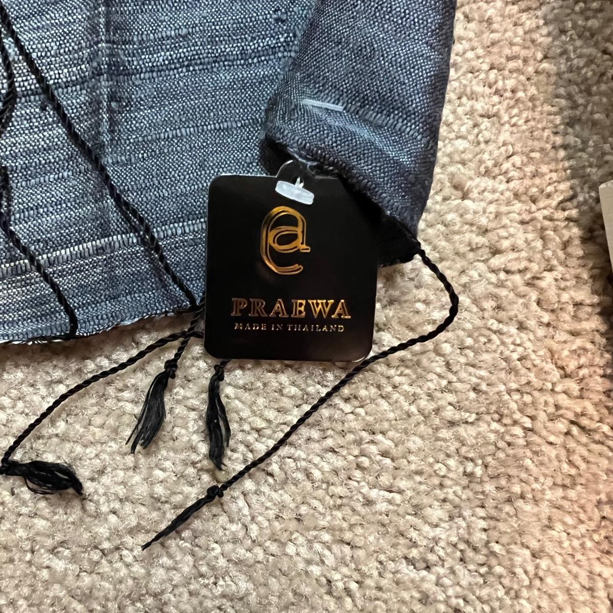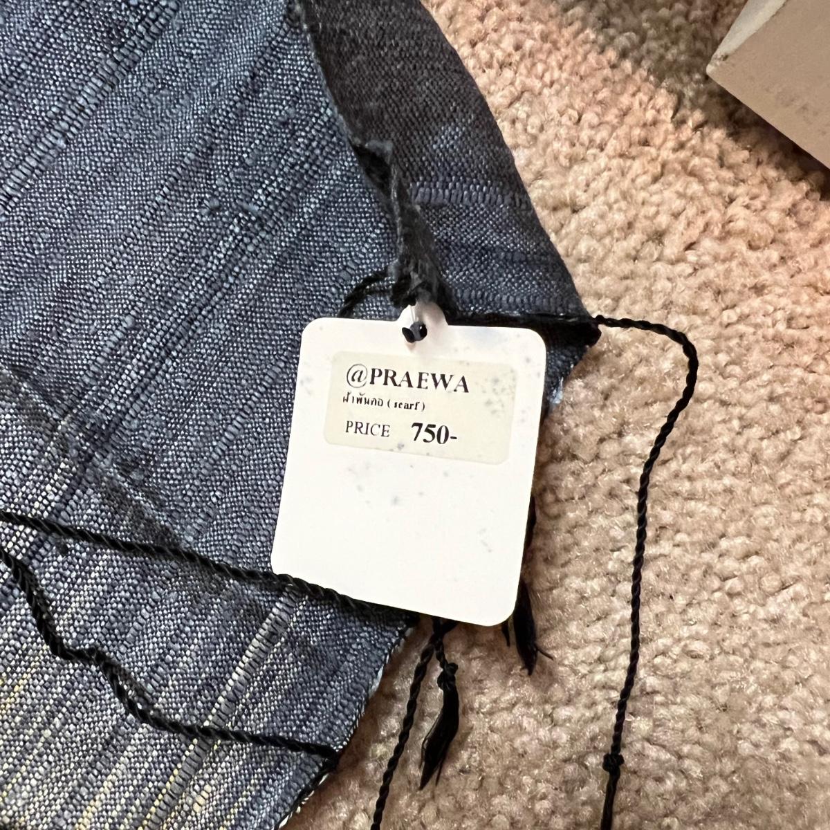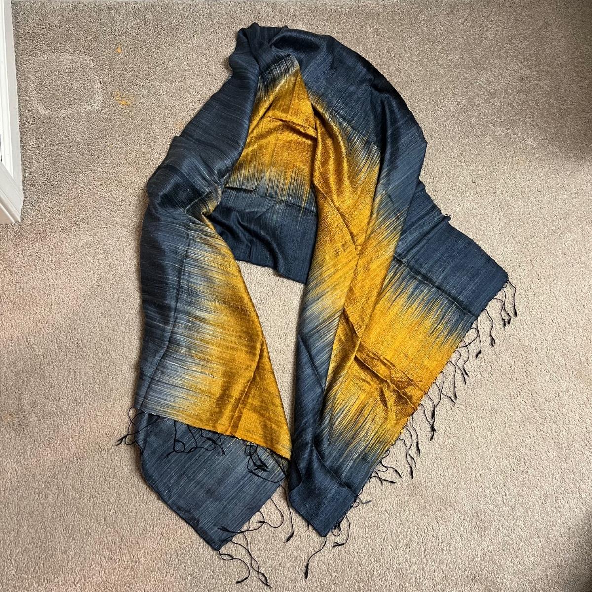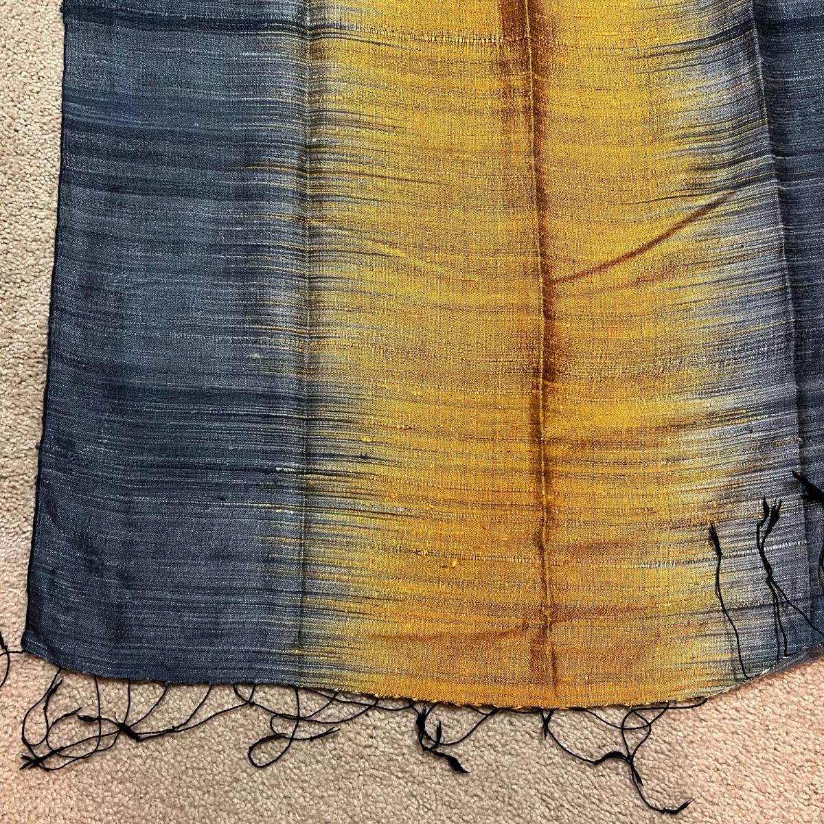 This stunning silk blue and gold scarf is large, measuring 24” x 74”. It still has its hefty price tag attached.