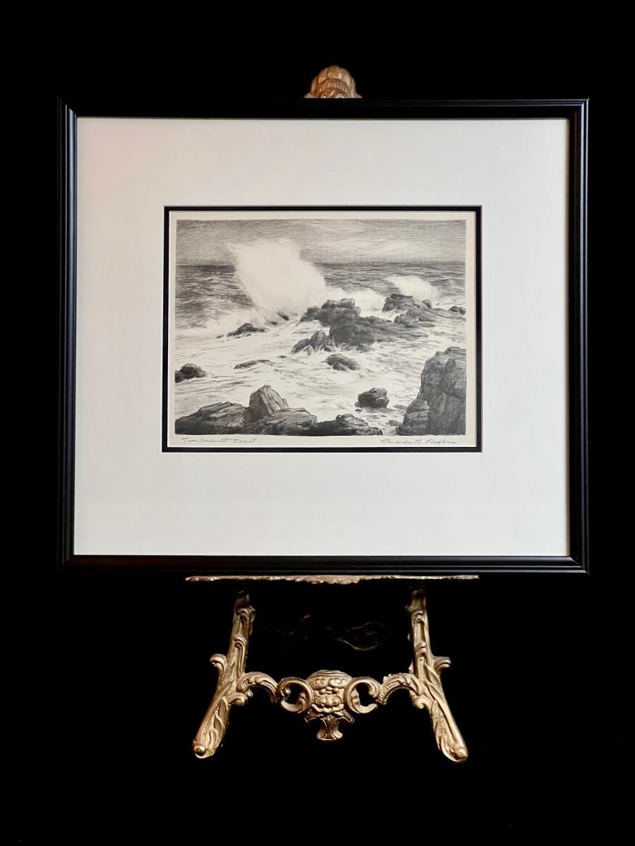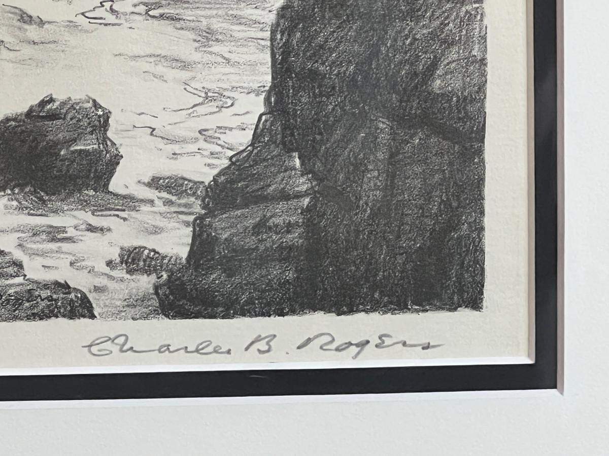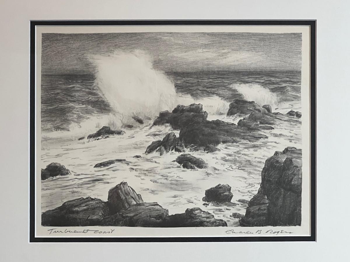 DESCRIPTION: The subject item is an original, signed fine art print by noted and listed American artist, Charles Rogers, an associate Prairie Printmaker. The artist has rendered a turbulent sea with waves crashing into the rocky shoreline.