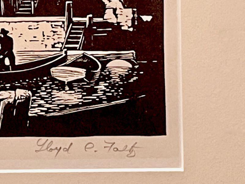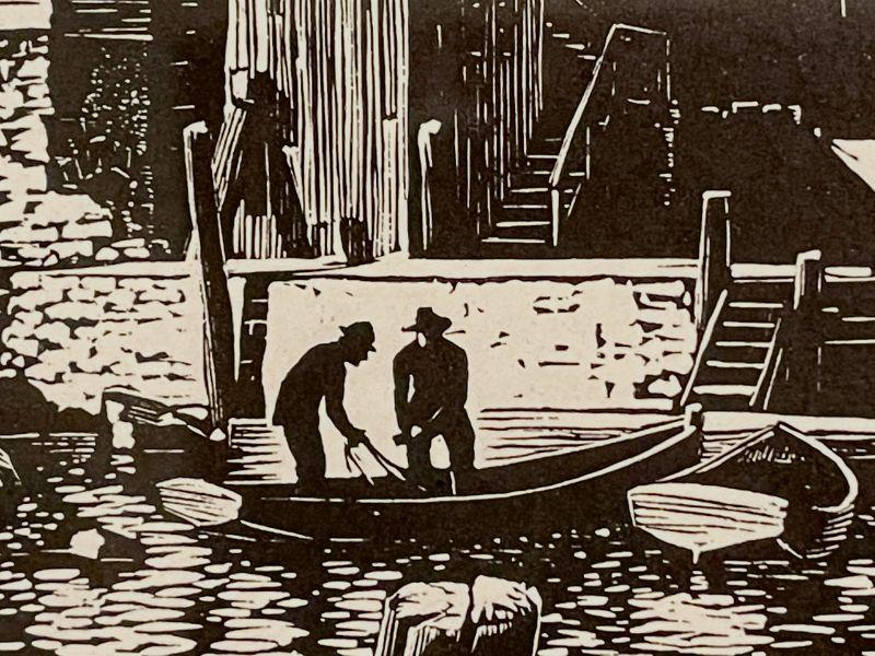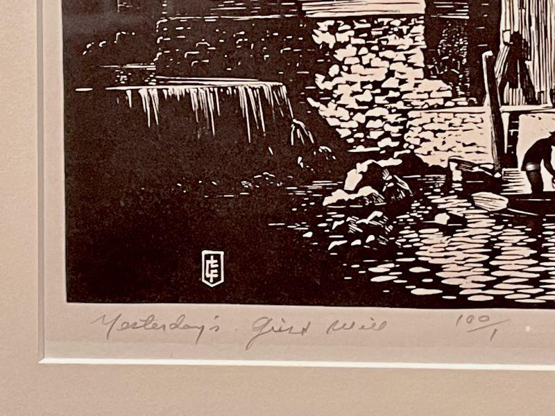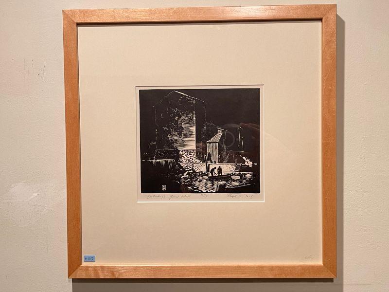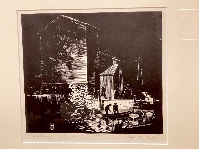 This is an original signed block print by founding Prairie Printmaker, Lloyd Foltz, featuring an enormous, dramatically lit, stream-side grist mill with with figures loading a row boat.