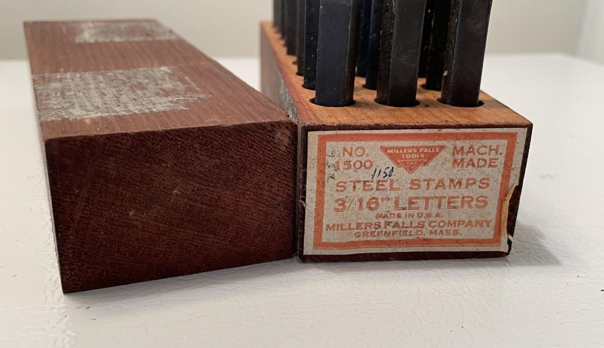 These are steel stamps, machine made, 3/16 inches letters in the original wood box. These could be used on leather or to make jewelry and each is about 2.25 inches long. These came from the consignor's father-in-law and he had given them to the consignor circa 1960s. There is tape residue on the boxes from years of being stored.
