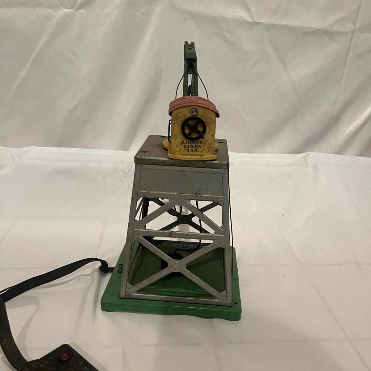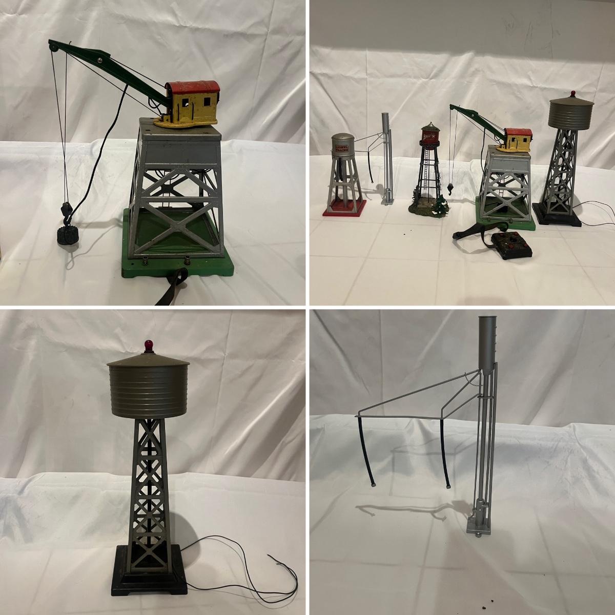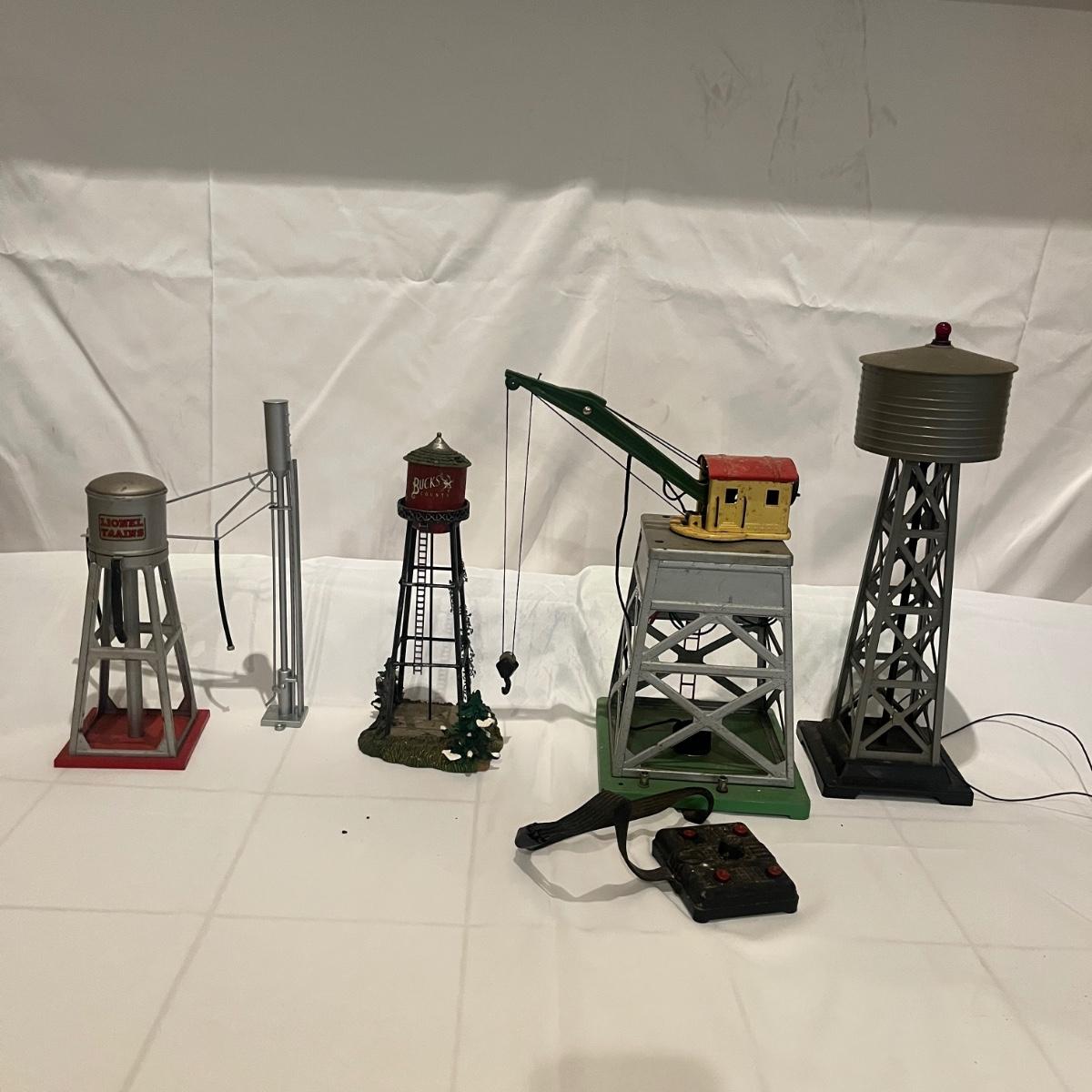 Lot includes a metal Lionel pre war crane, metal Lionel water tower, Rail King sanding tower, plastic water tower and metal Bucks County water tower. Crane measures 6” x 9” x 12”H.