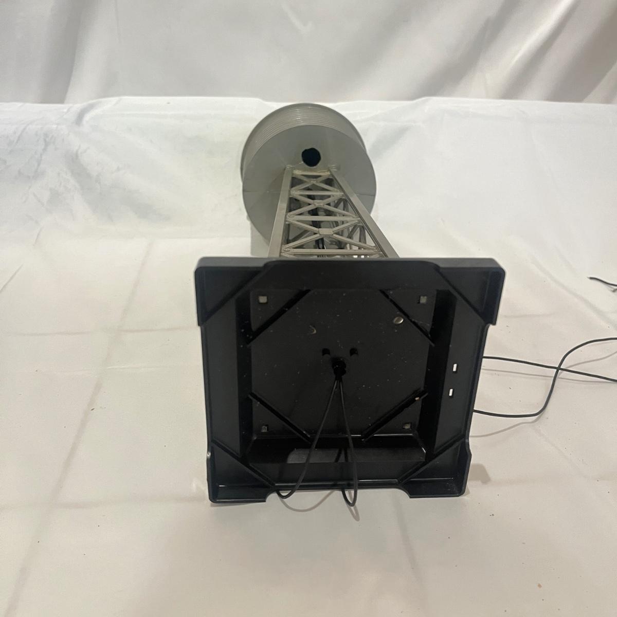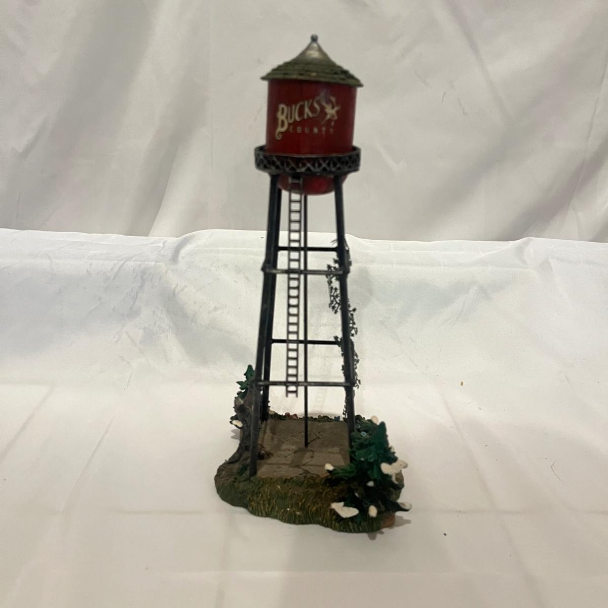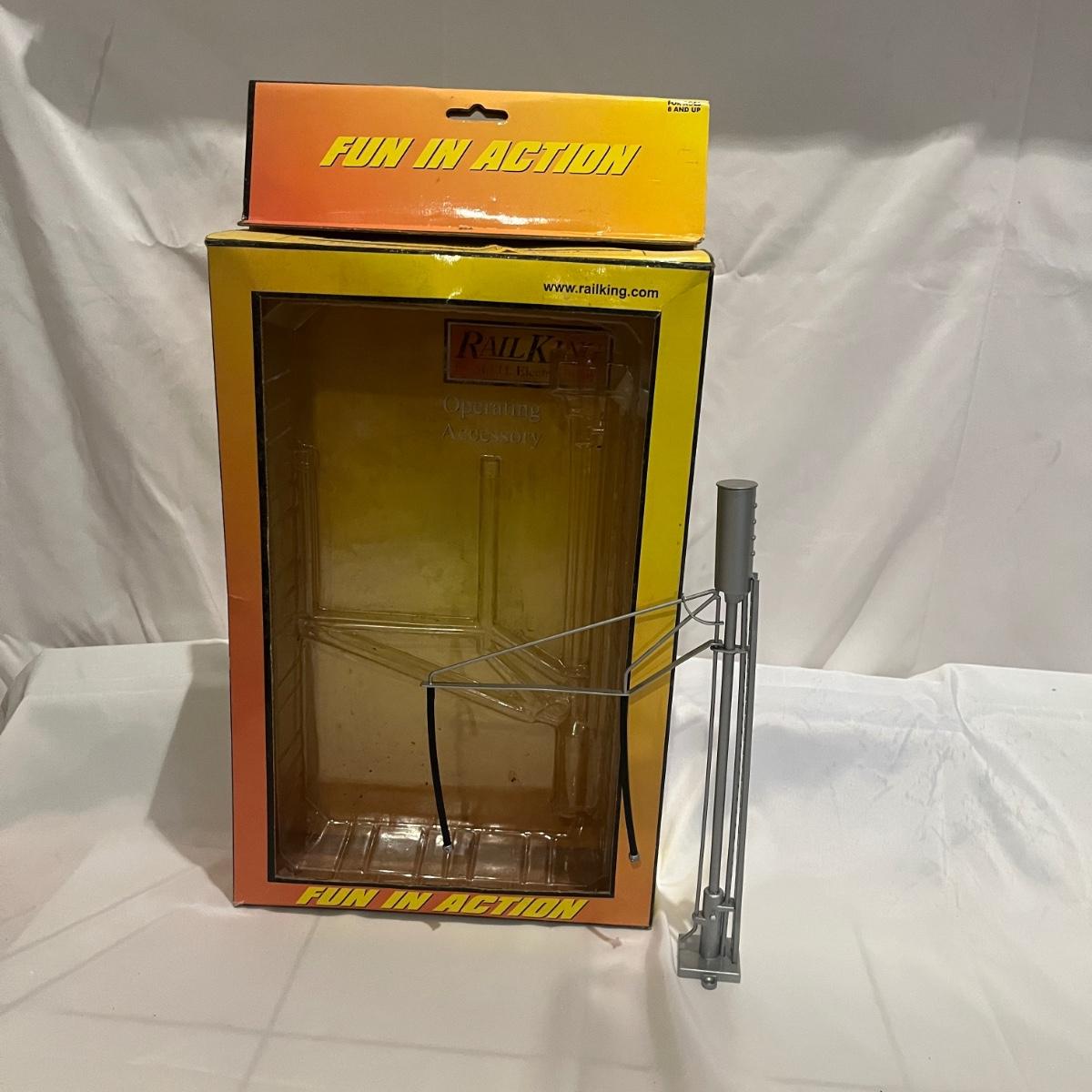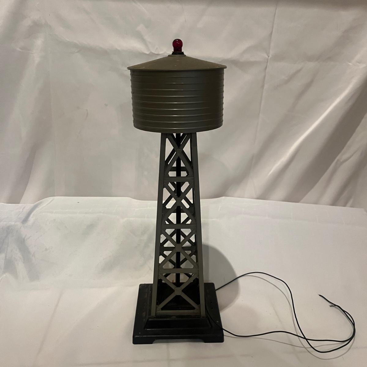 Lot includes a metal Lionel pre war crane, metal Lionel water tower, Rail King sanding tower, plastic water tower and metal Bucks County water tower. Crane measures 6” x 9” x 12”H.