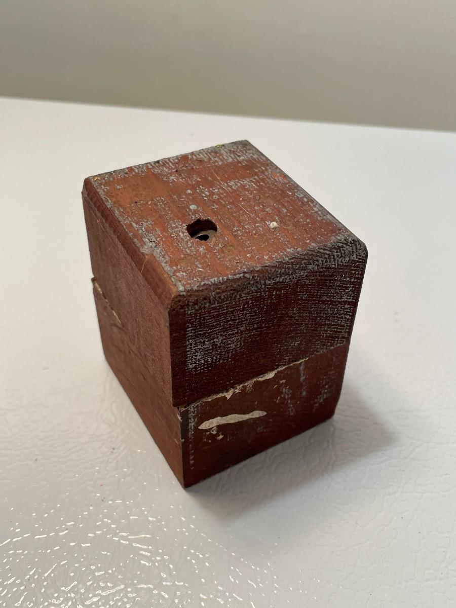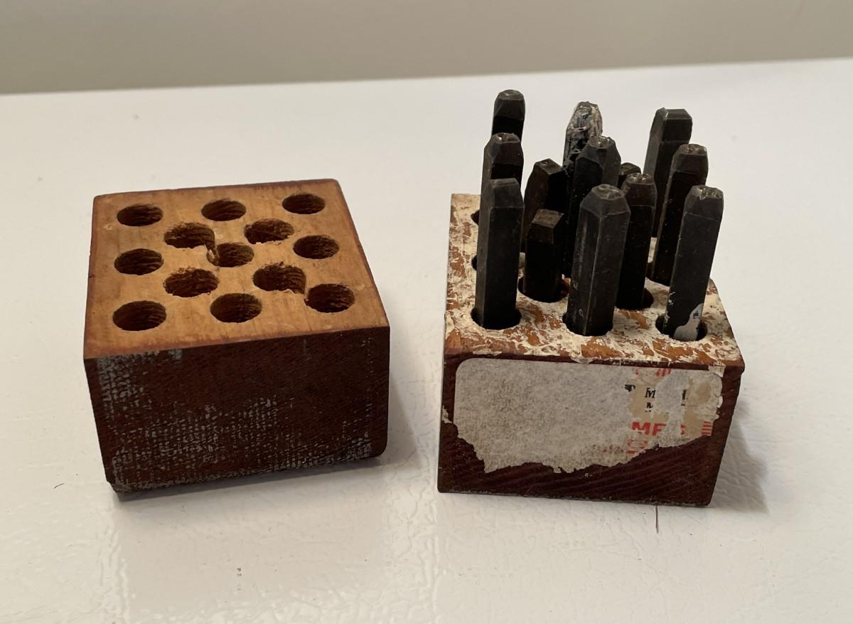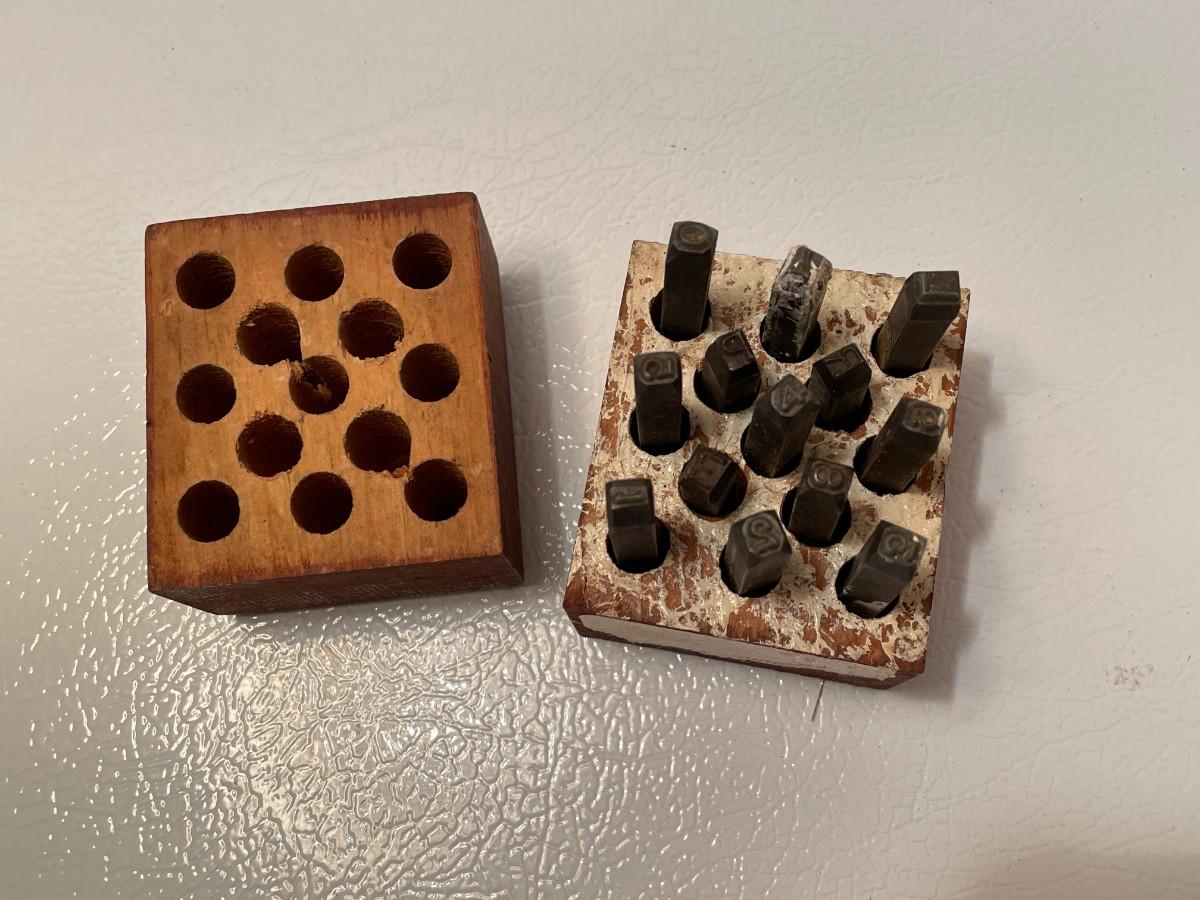 These are smaller than Lot 161 and there are numbers 0-9 (six and nine are the same stamp) and four letters. These came from the consignor's father-in-law and he had given them to the consignor circa 1960s. It looks like someone drilled extra holes into the wood boxes for the four letter stamps and there is tape residue on the outside of the box due to years of storage with tape on the box.