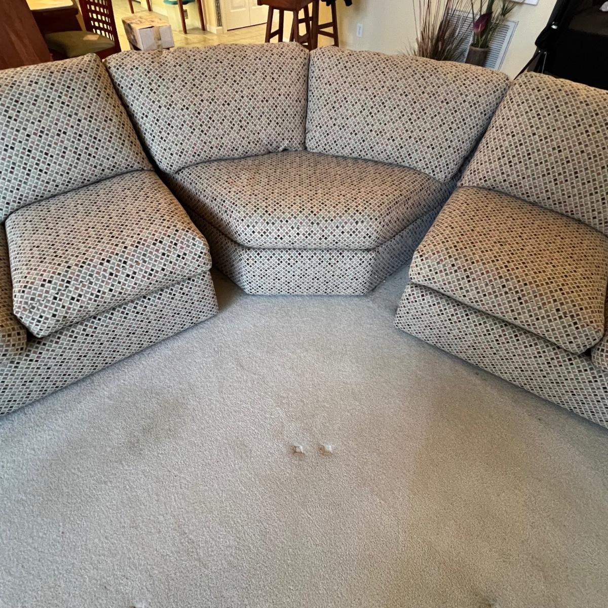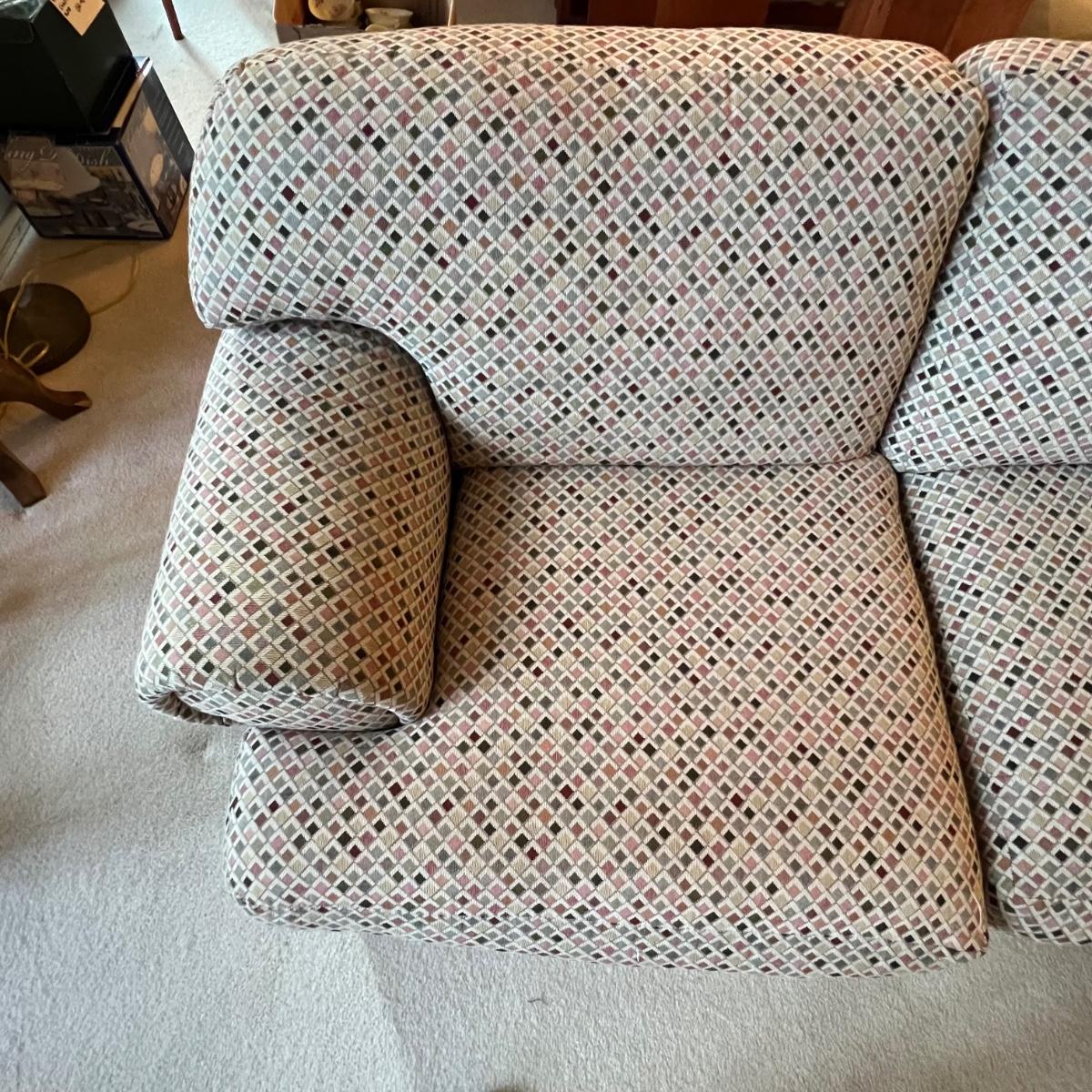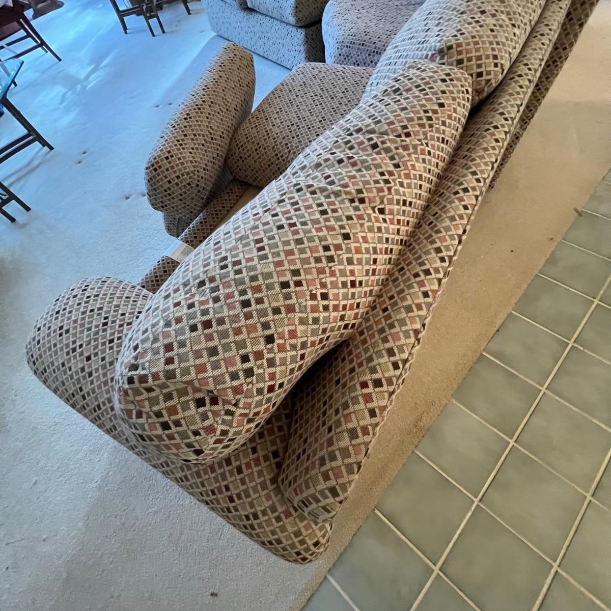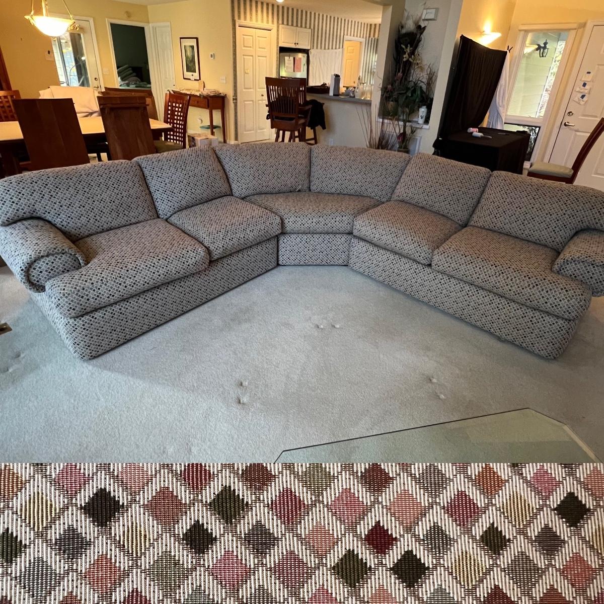 This made in Hickory, N.C three piece sectional has an attractive modern upholstery with multi colored diamond shapes that includes pinks greens yellows and shades of blue. Note one of the backrest cushions in the center section has a small area of fraying at a seam.