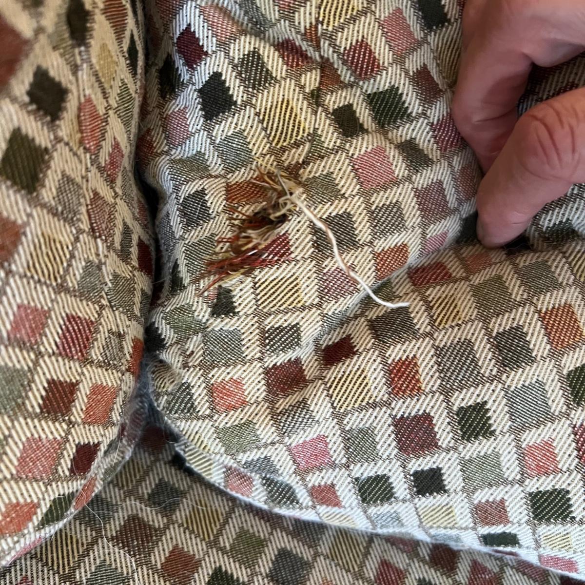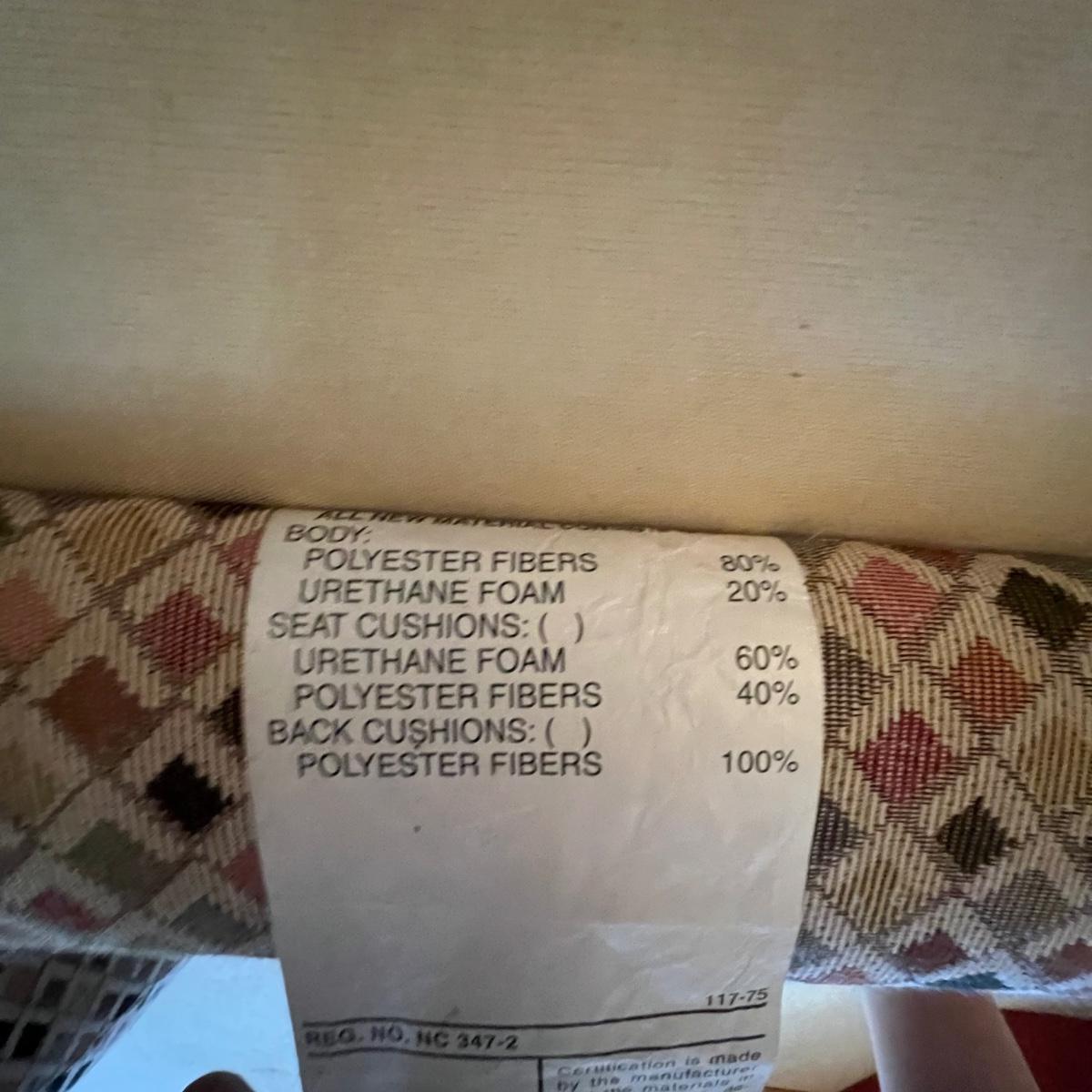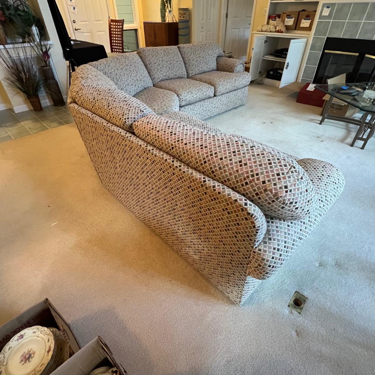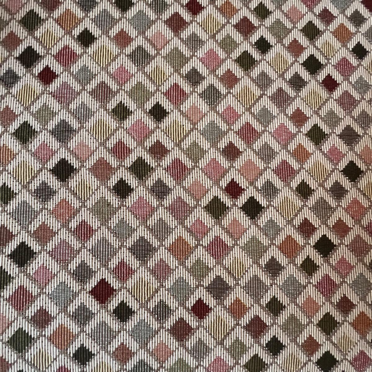 This made in Hickory, N.C three piece sectional has an attractive modern upholstery with multi colored diamond shapes that includes pinks greens yellows and shades of blue. Note one of the backrest cushions in the center section has a small area of fraying at a seam.