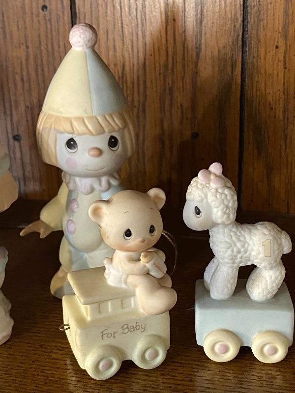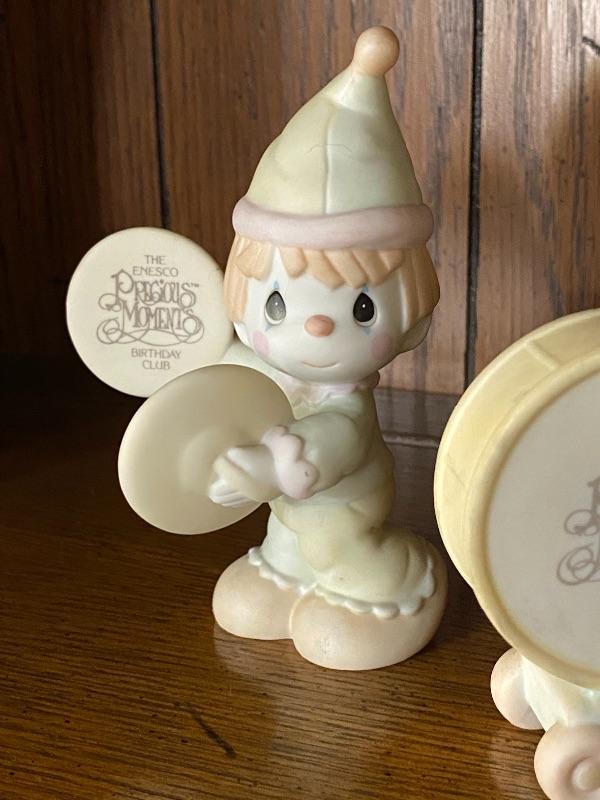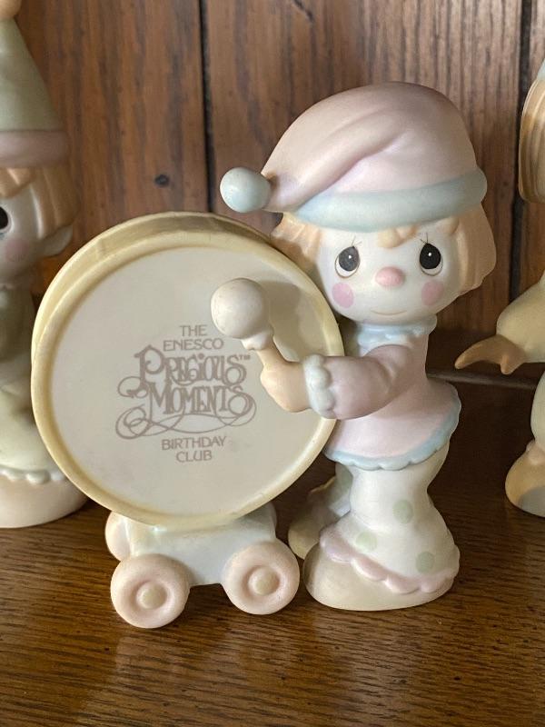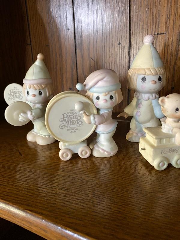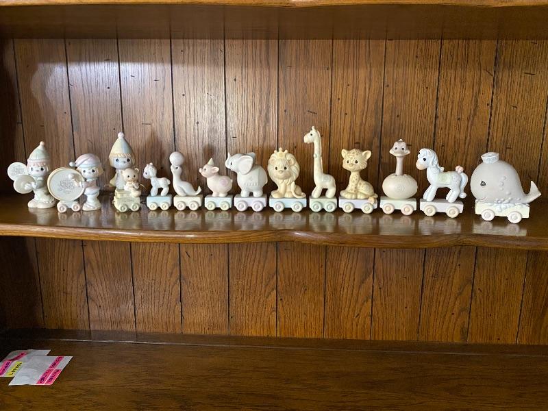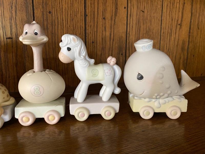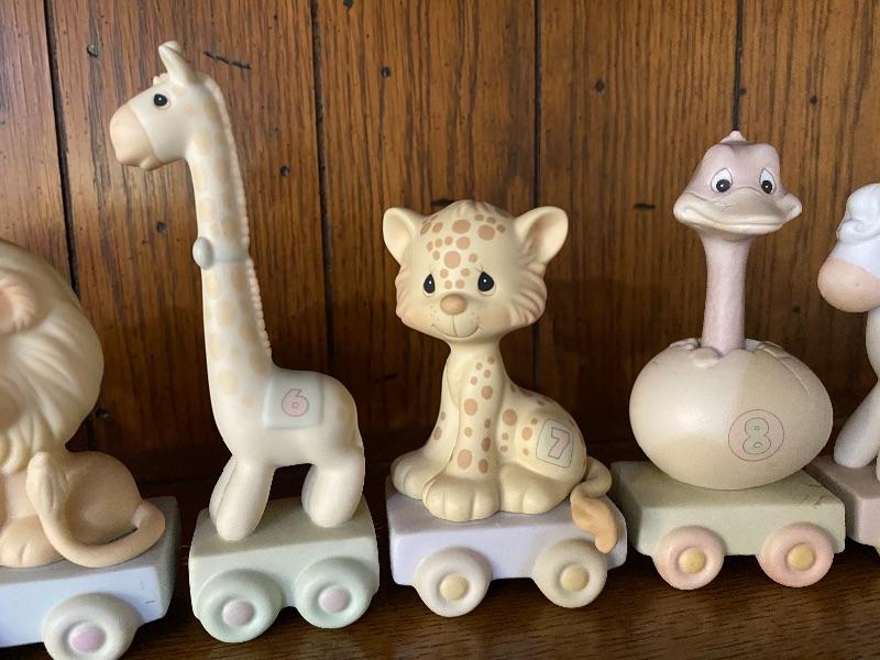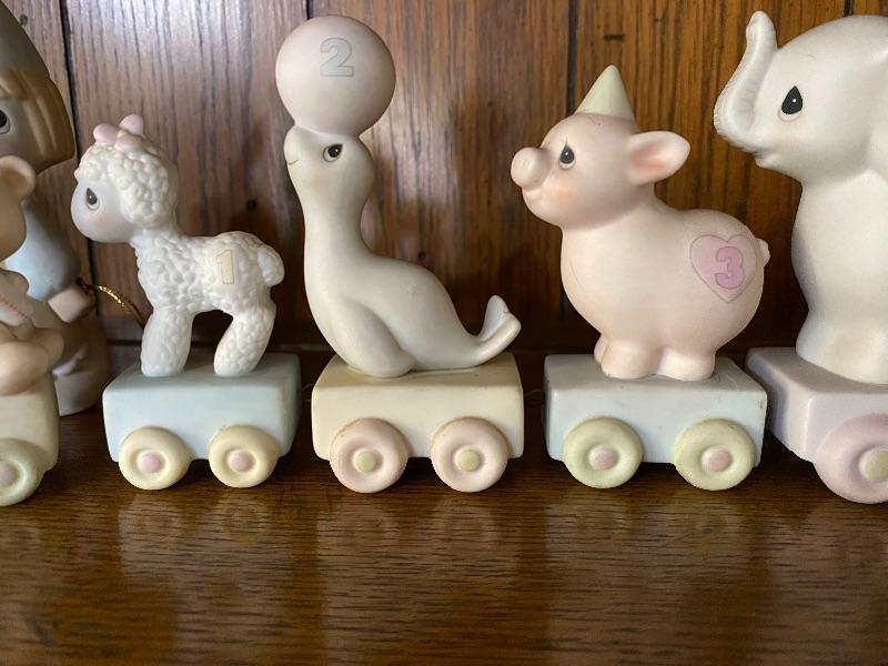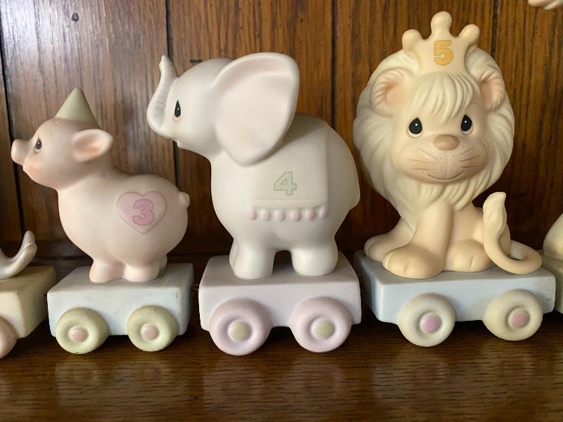 Precious Moments Birthday Club Animal Circus Train. 14 pieces total. Animals are numbered from birth to 10. 3 clowns go along with set. Good condition. A little dusty. Animal pieces have loops so they could be connected.