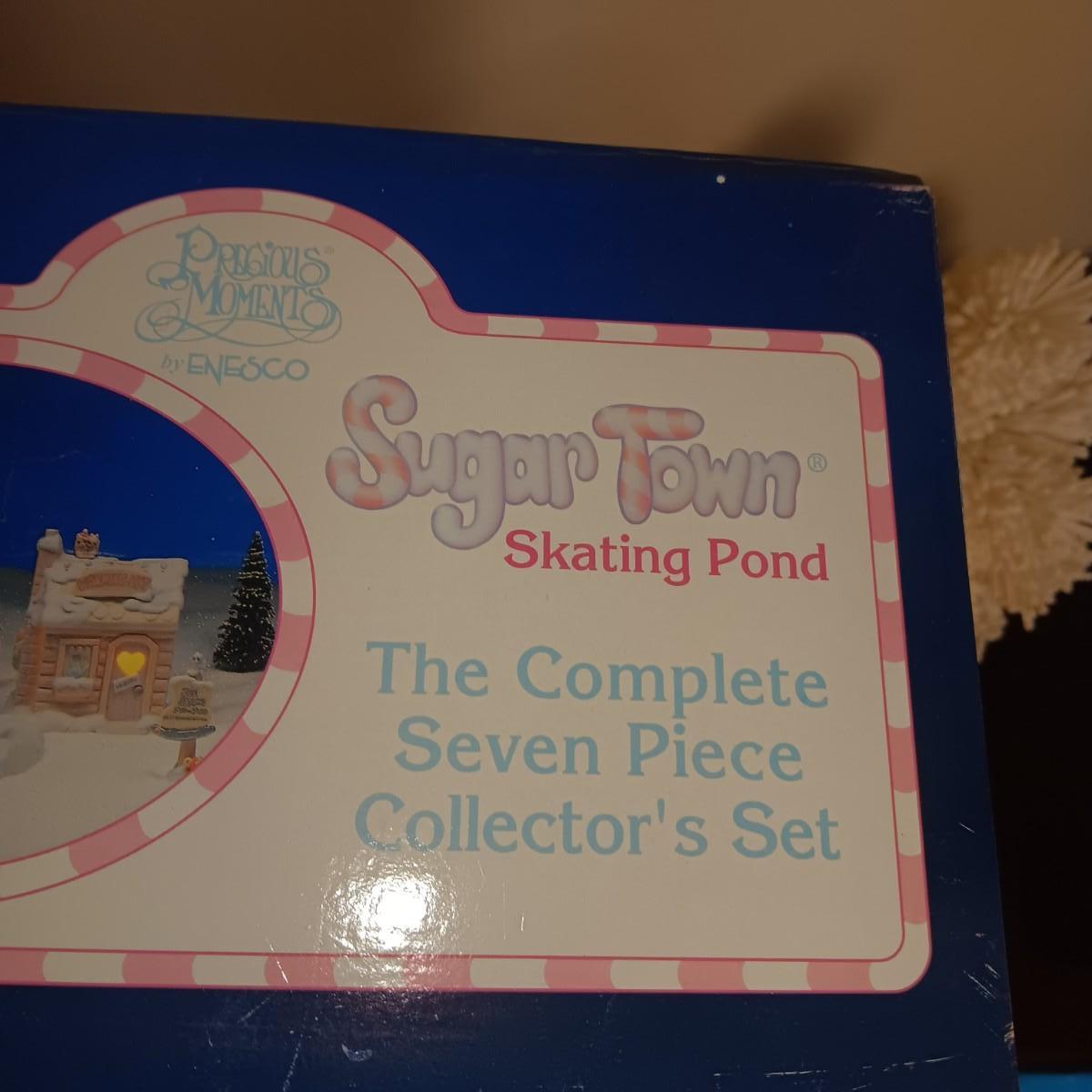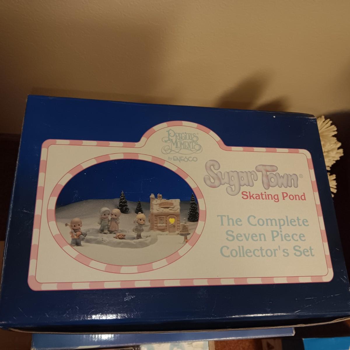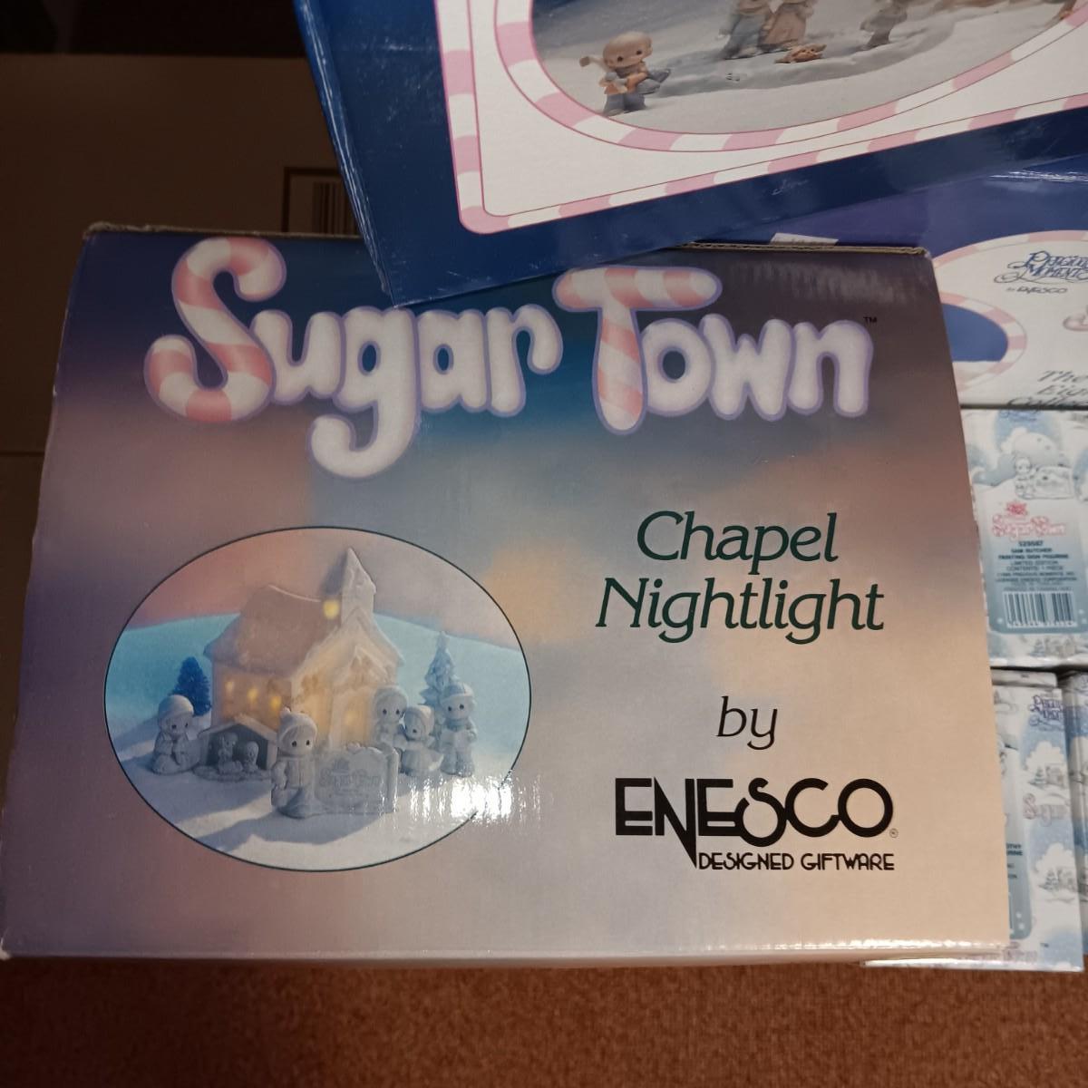 PRECIOUS MOMENTS 'SUGAR TOWN" FIGURINES, CHAPEL NIGHT LIGHT, SKATING POND & POST OFFICE