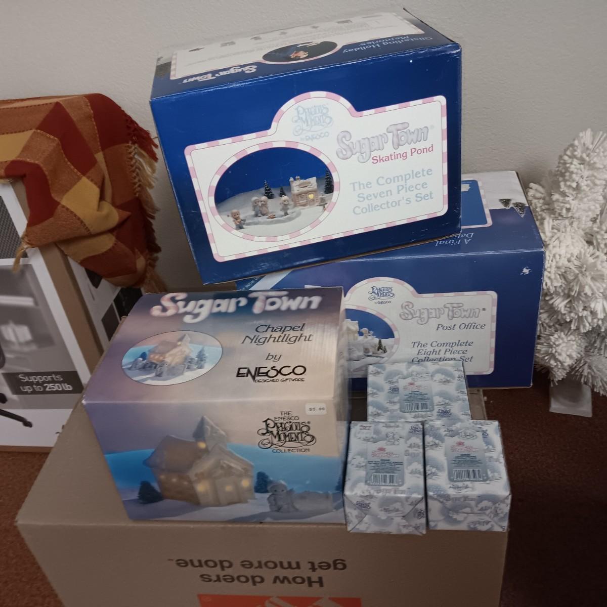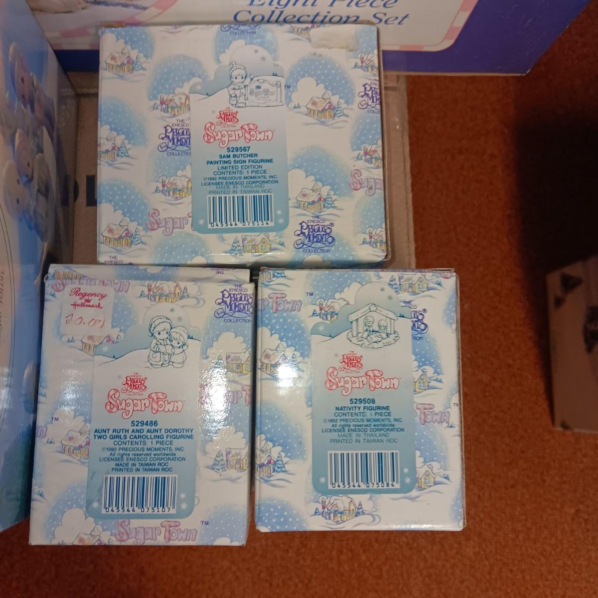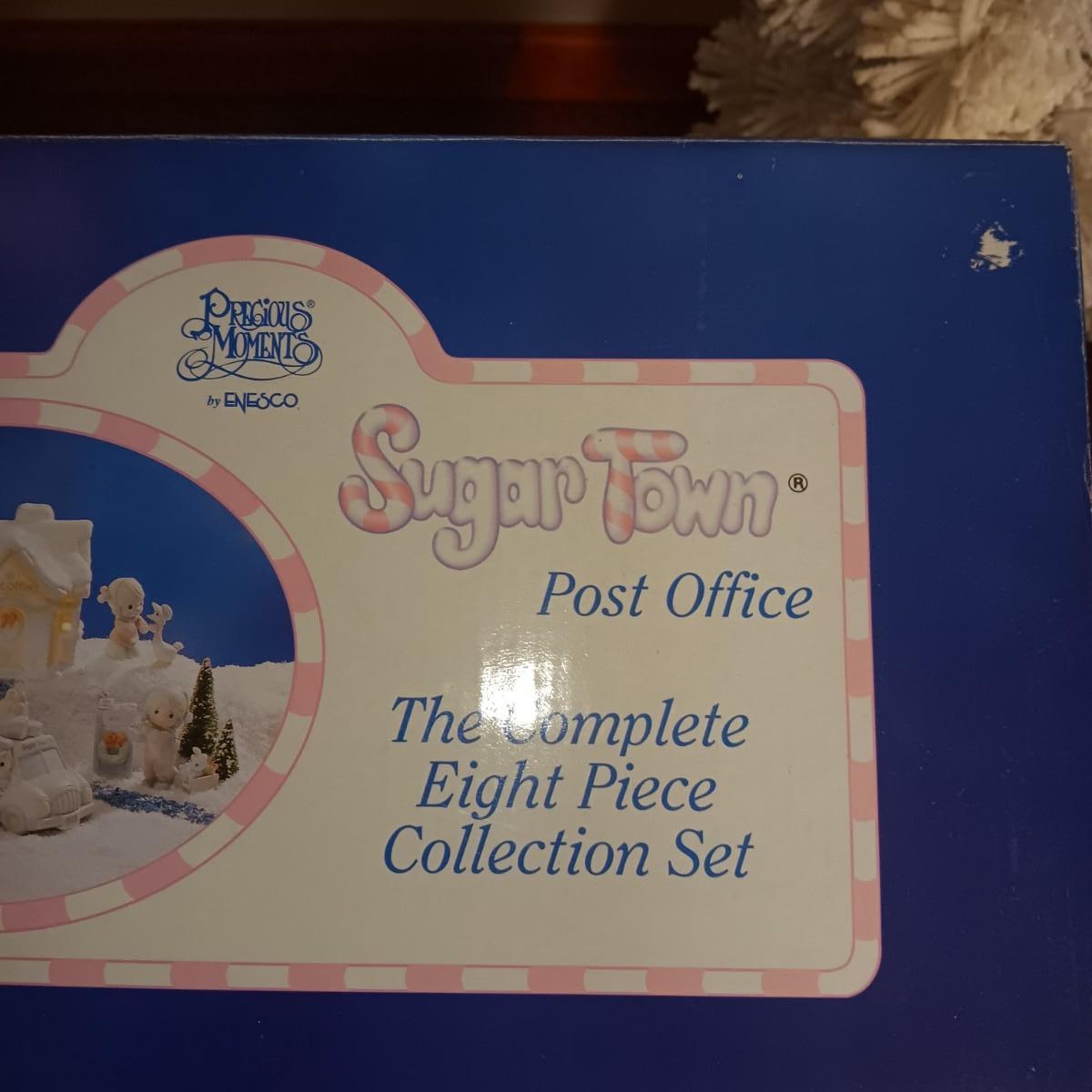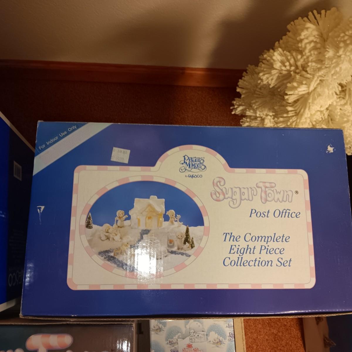 PRECIOUS MOMENTS 'SUGAR TOWN" FIGURINES, CHAPEL NIGHT LIGHT, SKATING POND & POST OFFICE