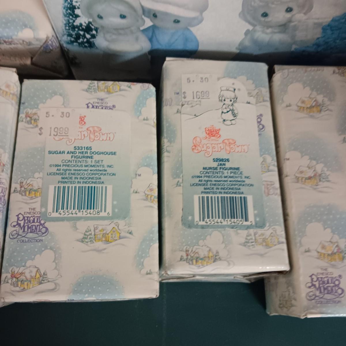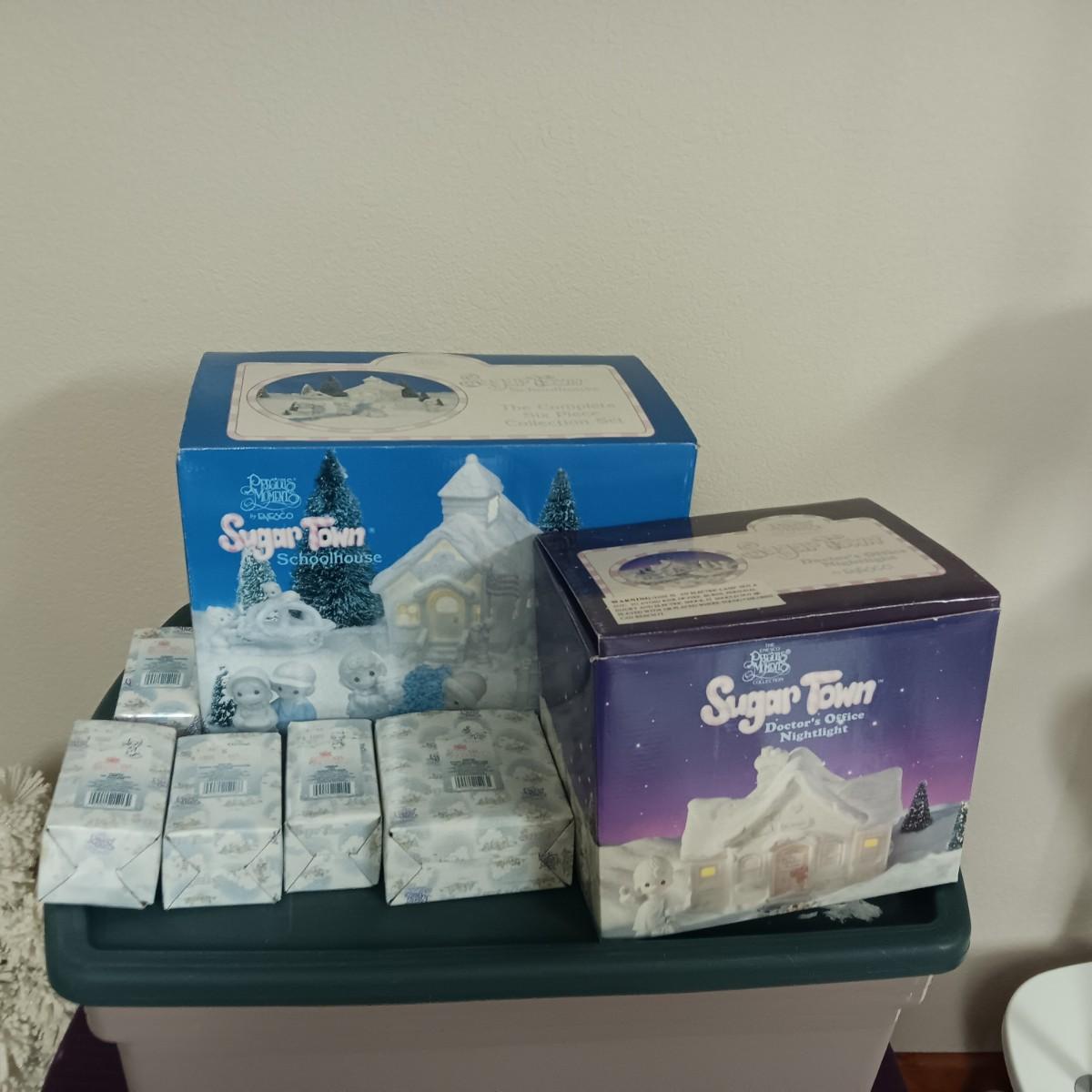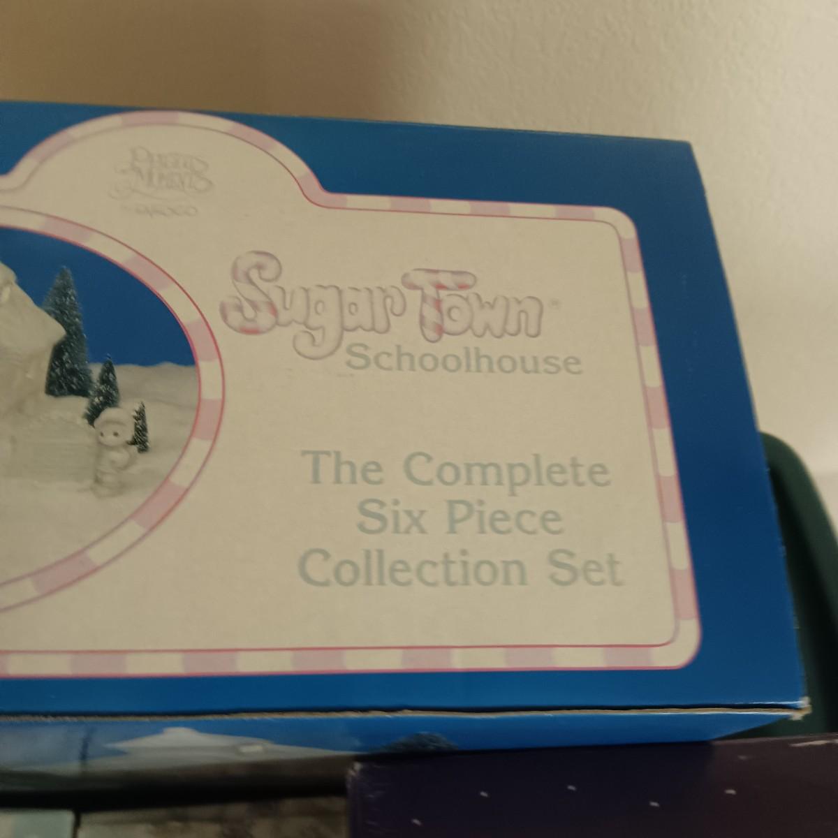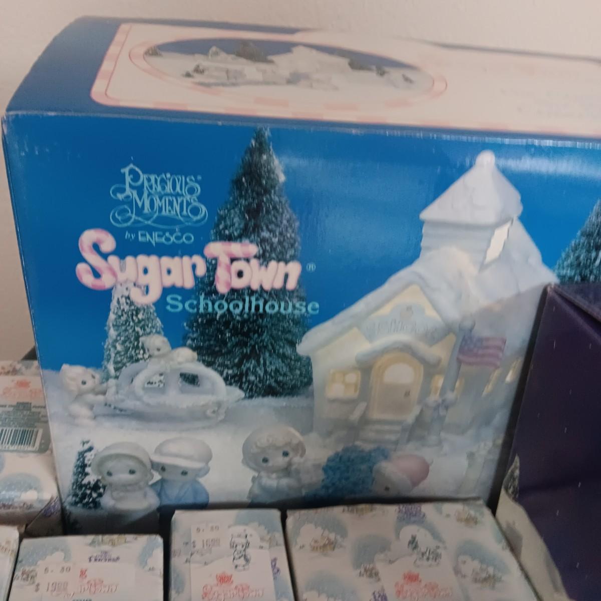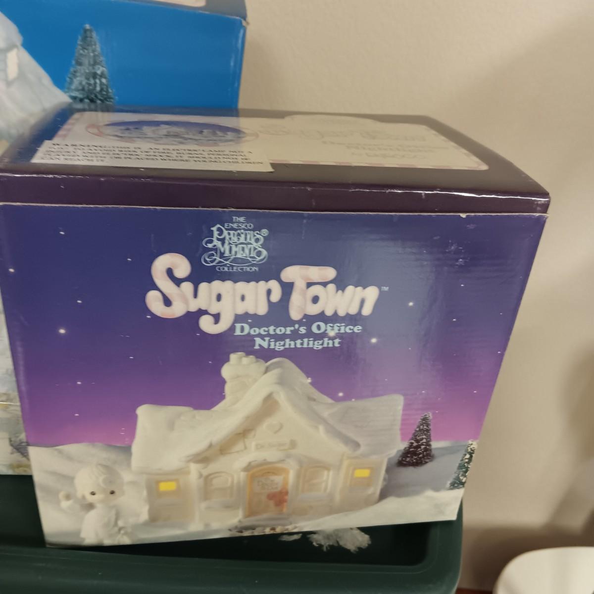 PRECIOUS MOMENTS "SUGAR TOWN" FIGURINES, DOCTOR'S OFFICE NIGHT LIGHT & SCHOOLHOUSE