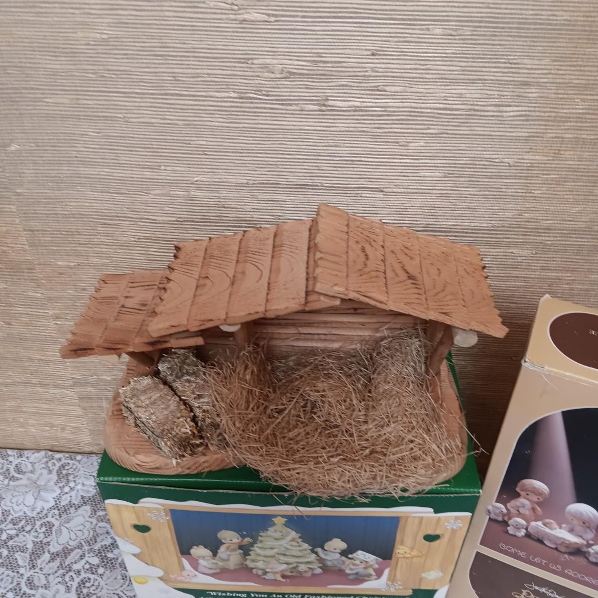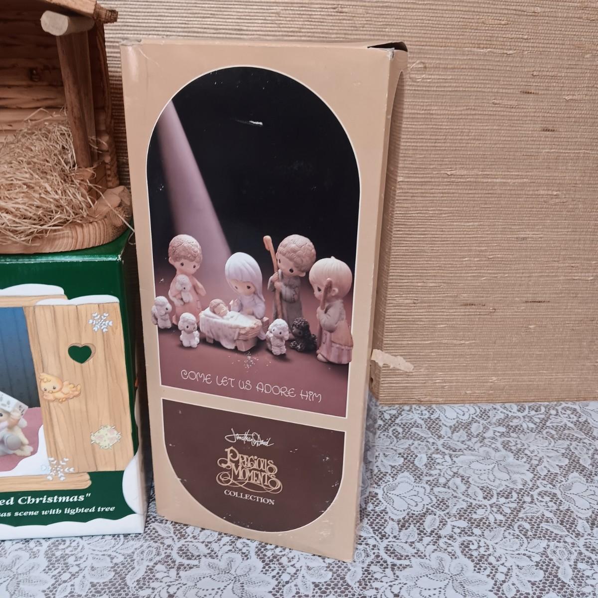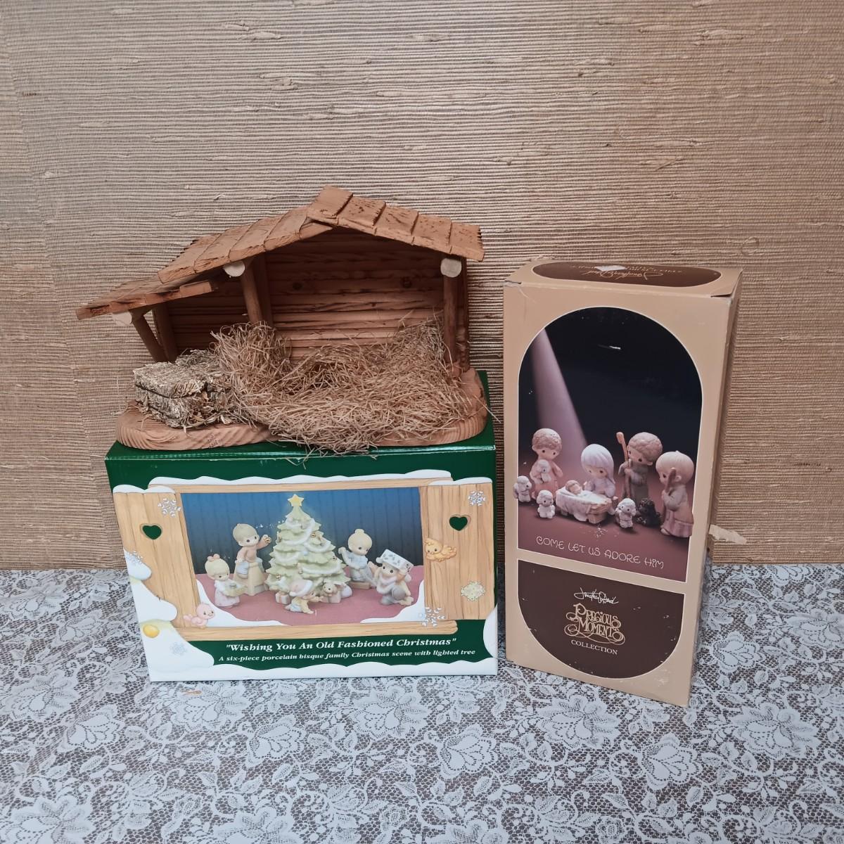 PRECIOUS MOMENTS WOODEN MANGER AND FIGURES PLUS A 6 PC FAMILY CHRISTMAS SCENE