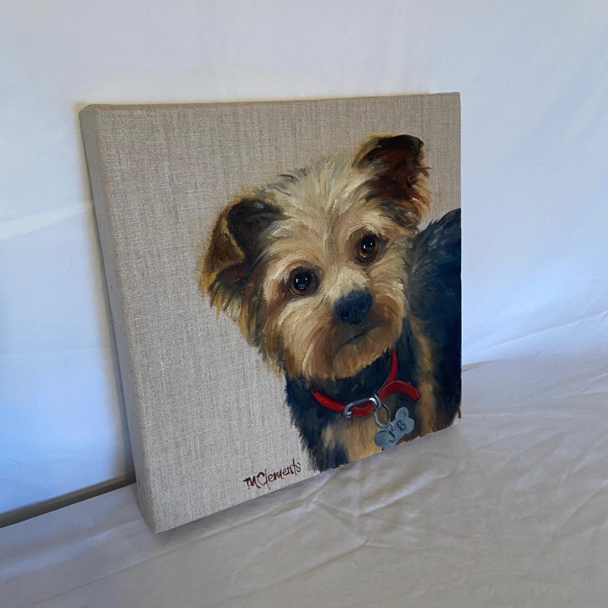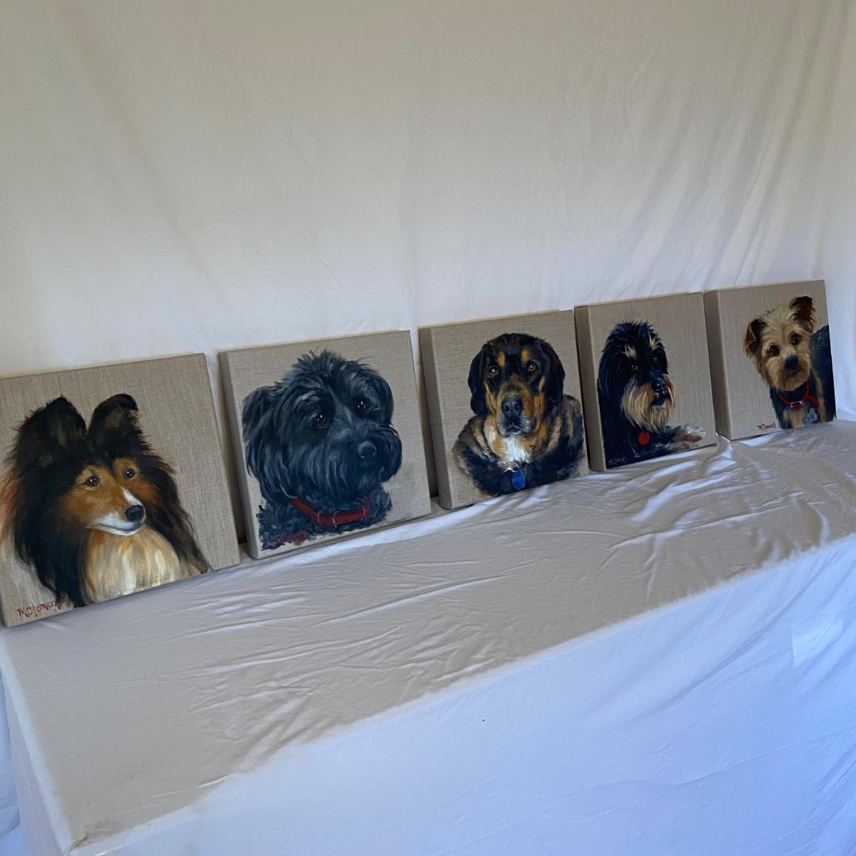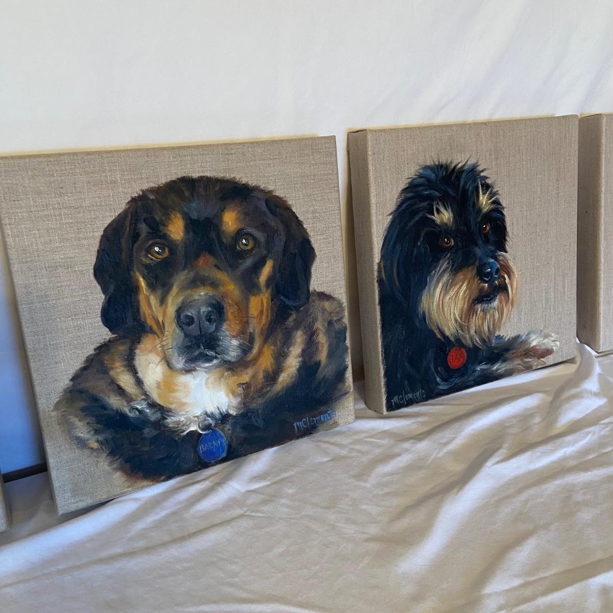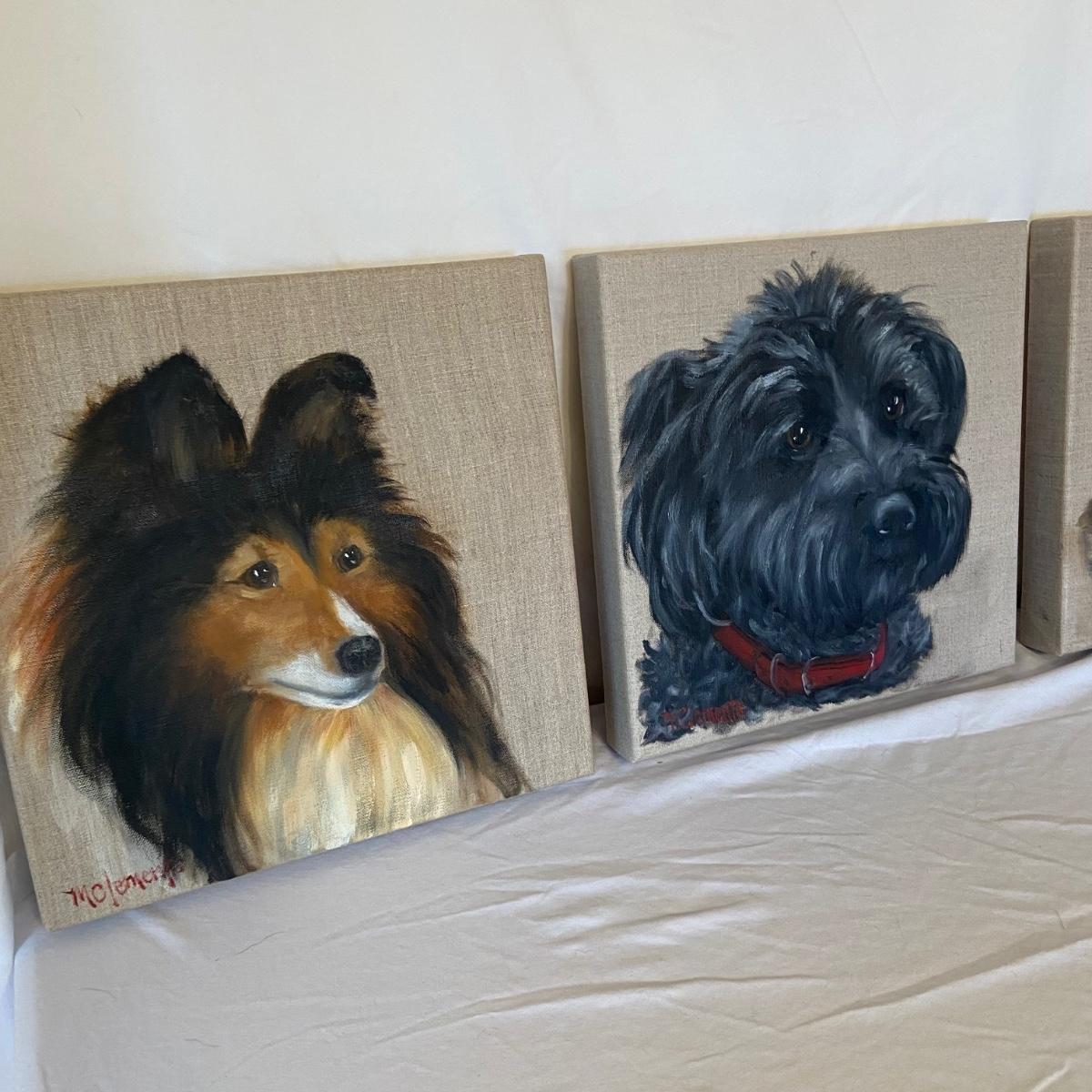 Lot includes five original dog portraits on what appears to be unbleached canvas by artist with the last name ‘MClements’. This series has a variety of different breeds. Each painting is the same size measuring 12” x 12”. Shipping available.