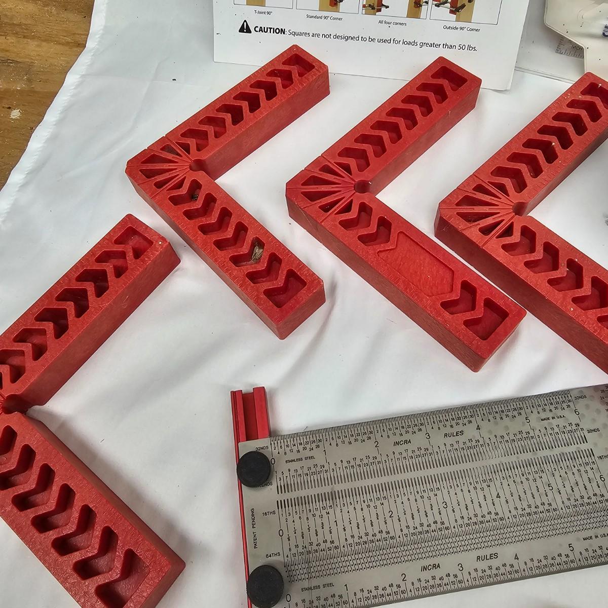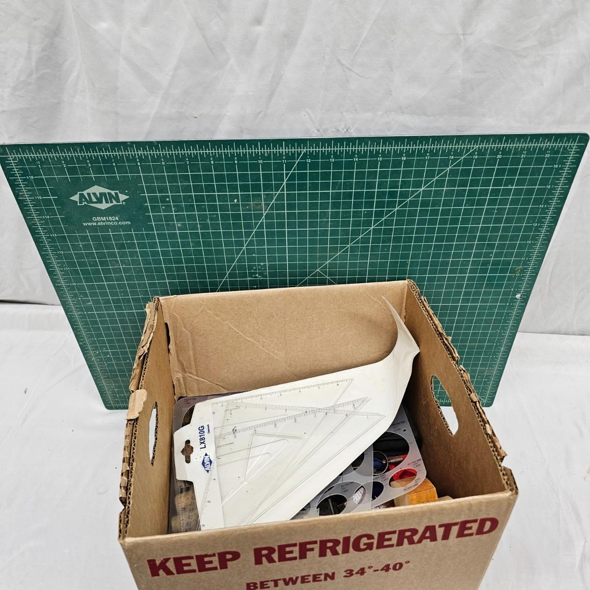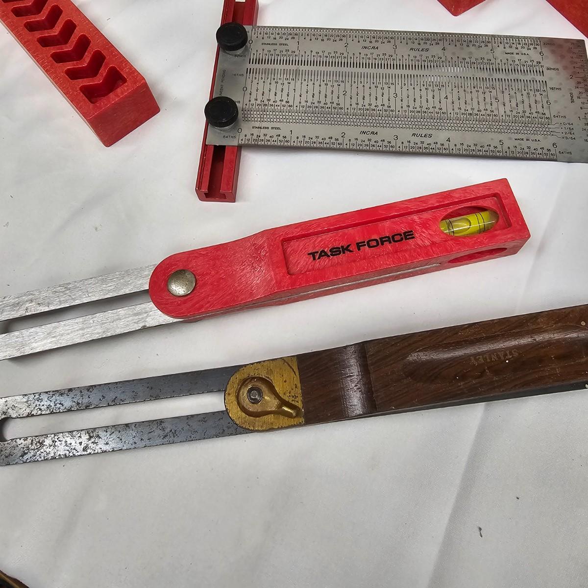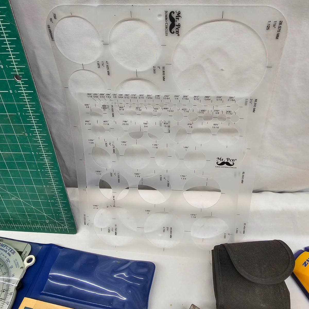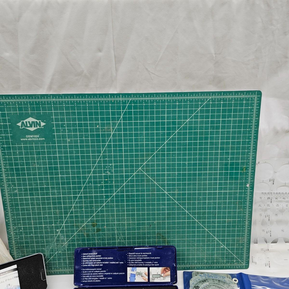 Calipers, angles, templates, scribes and more. Electronic items include stud finders and digital calipers, not tested. Several plastic angles, fixed 90° squares for accurate alignment. Angles are 6" x 6". Cutting mat is 18" x 24". See photos for details. Local pickup only.
