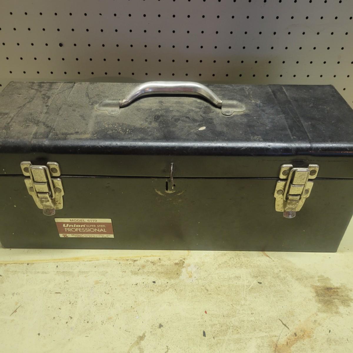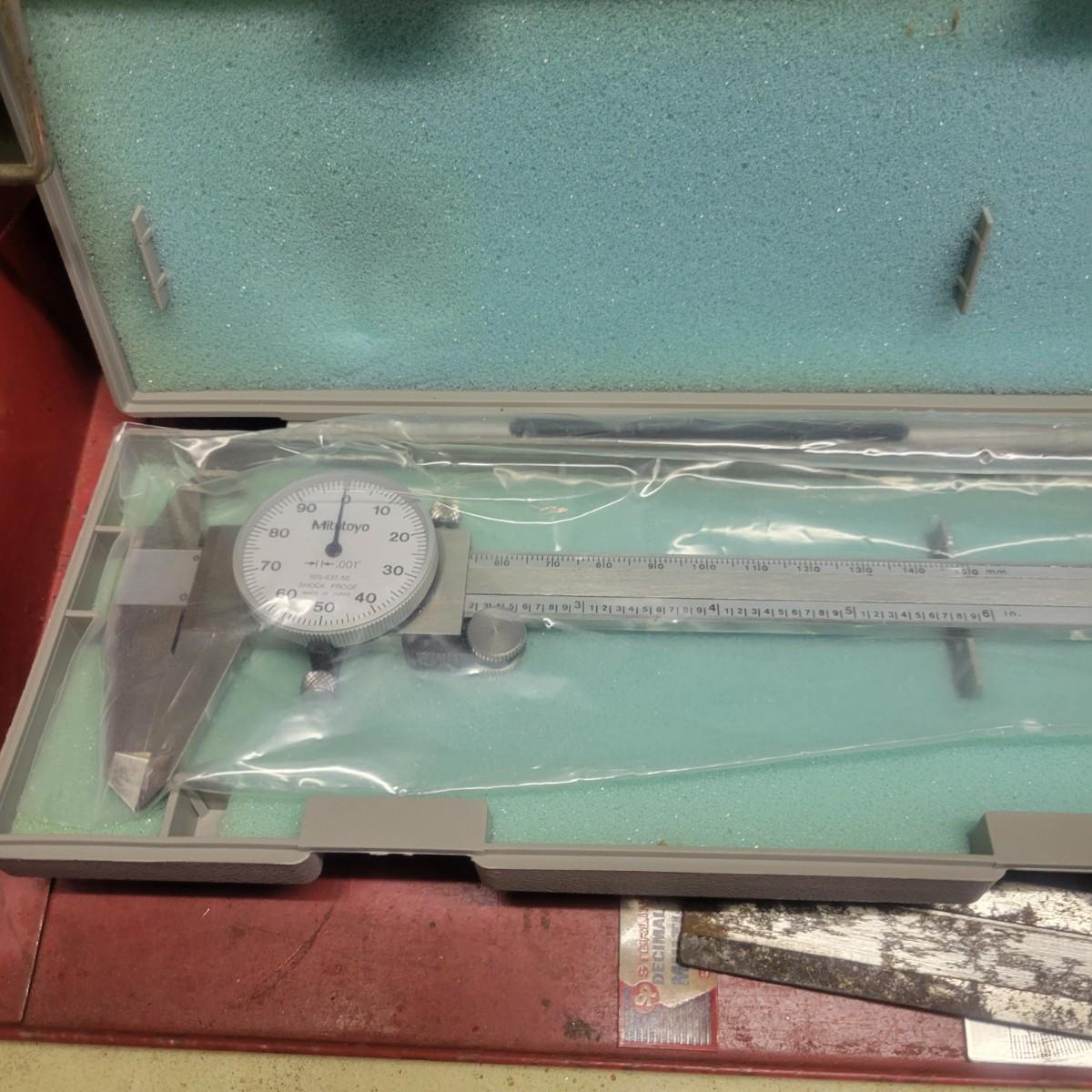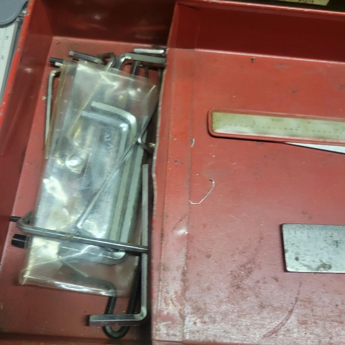 A toolbox and included precision tools in good condition. Tools include multiple calipers manufactured by Mituloyo, a slide rule and more. Digital caliper could not be tested as it likely needs a battery replacement. Toolbox is a Union steel toolbox and measures approximately 19" x 7" x 7.5". Shipping available.