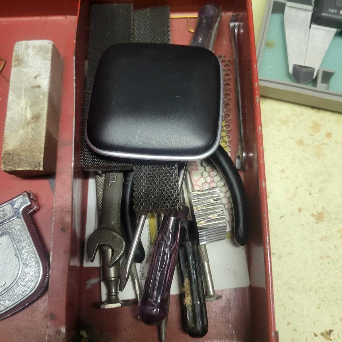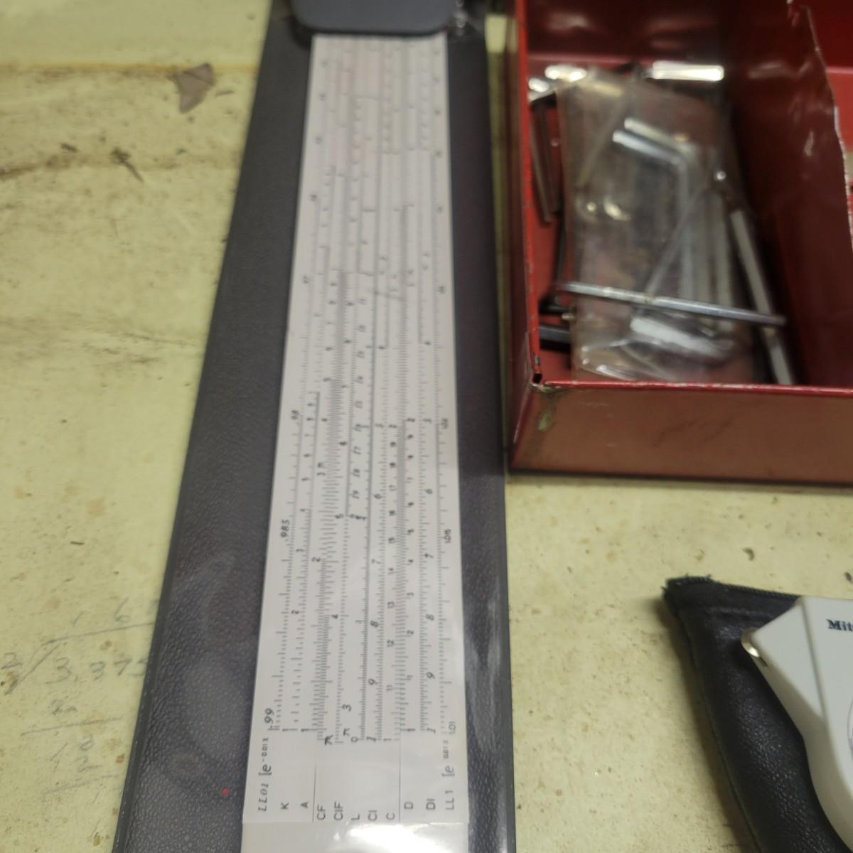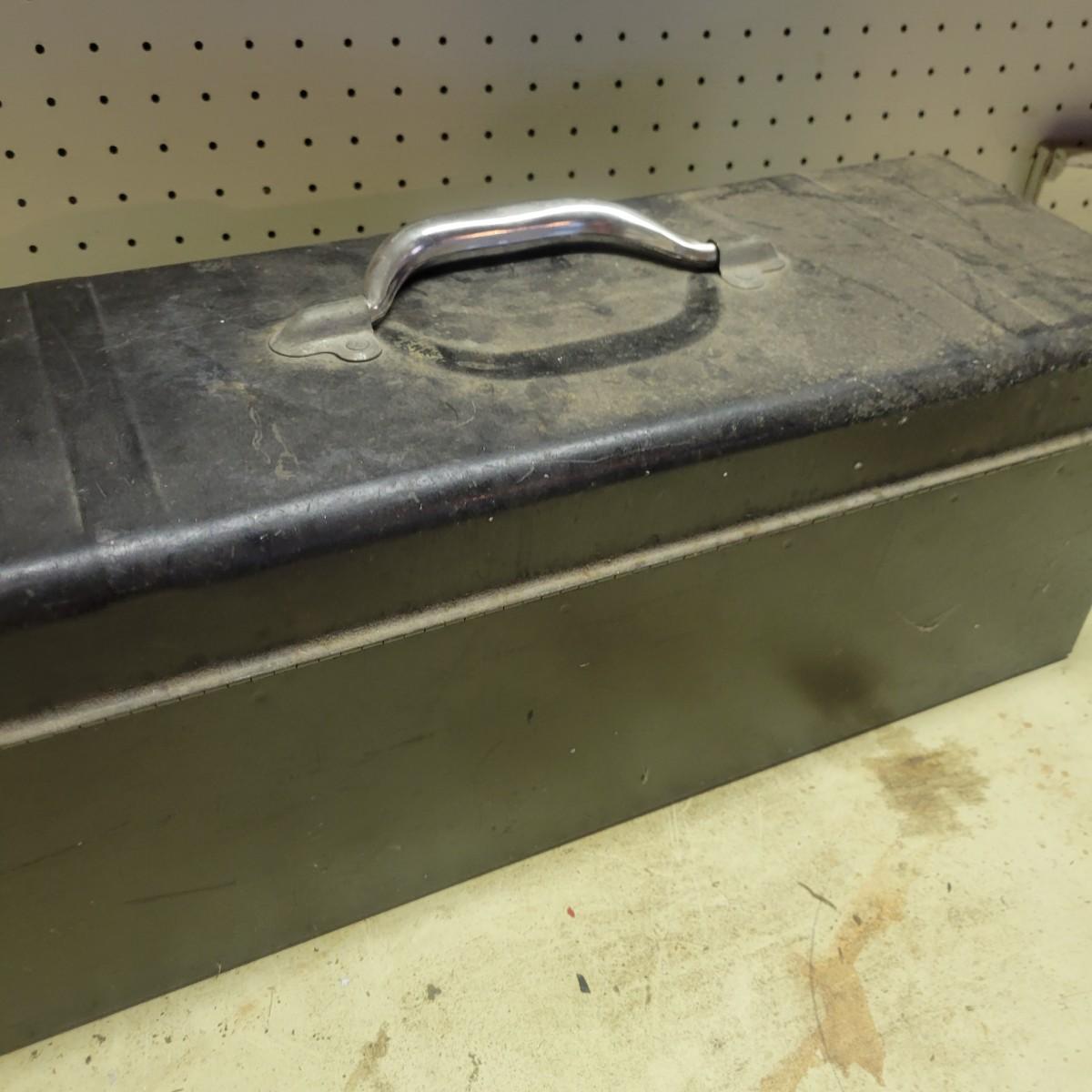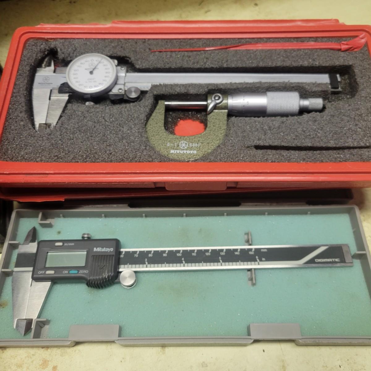 A toolbox and included precision tools in good condition. Tools include multiple calipers manufactured by Mituloyo, a slide rule and more. Digital caliper could not be tested as it likely needs a battery replacement. Toolbox is a Union steel toolbox and measures approximately 19" x 7" x 7.5". Shipping available.