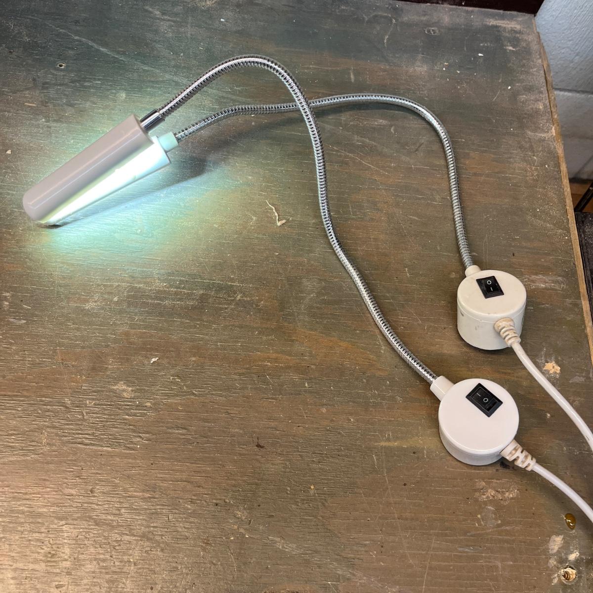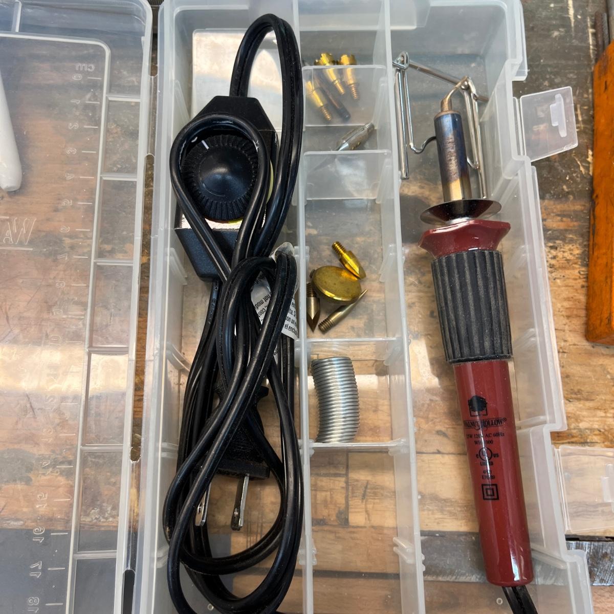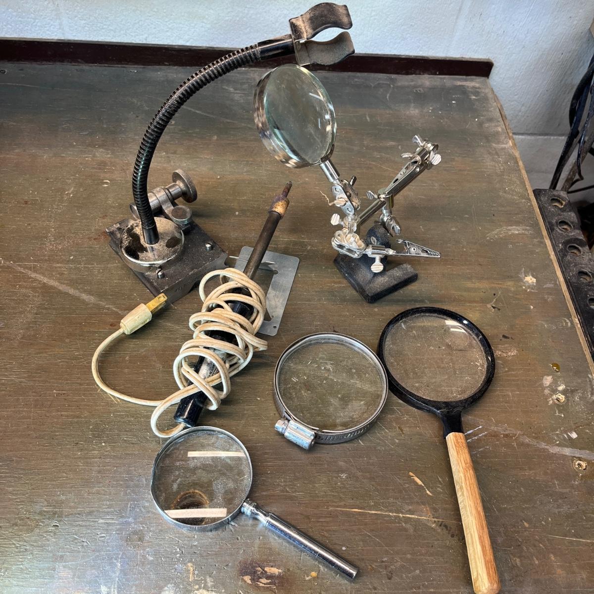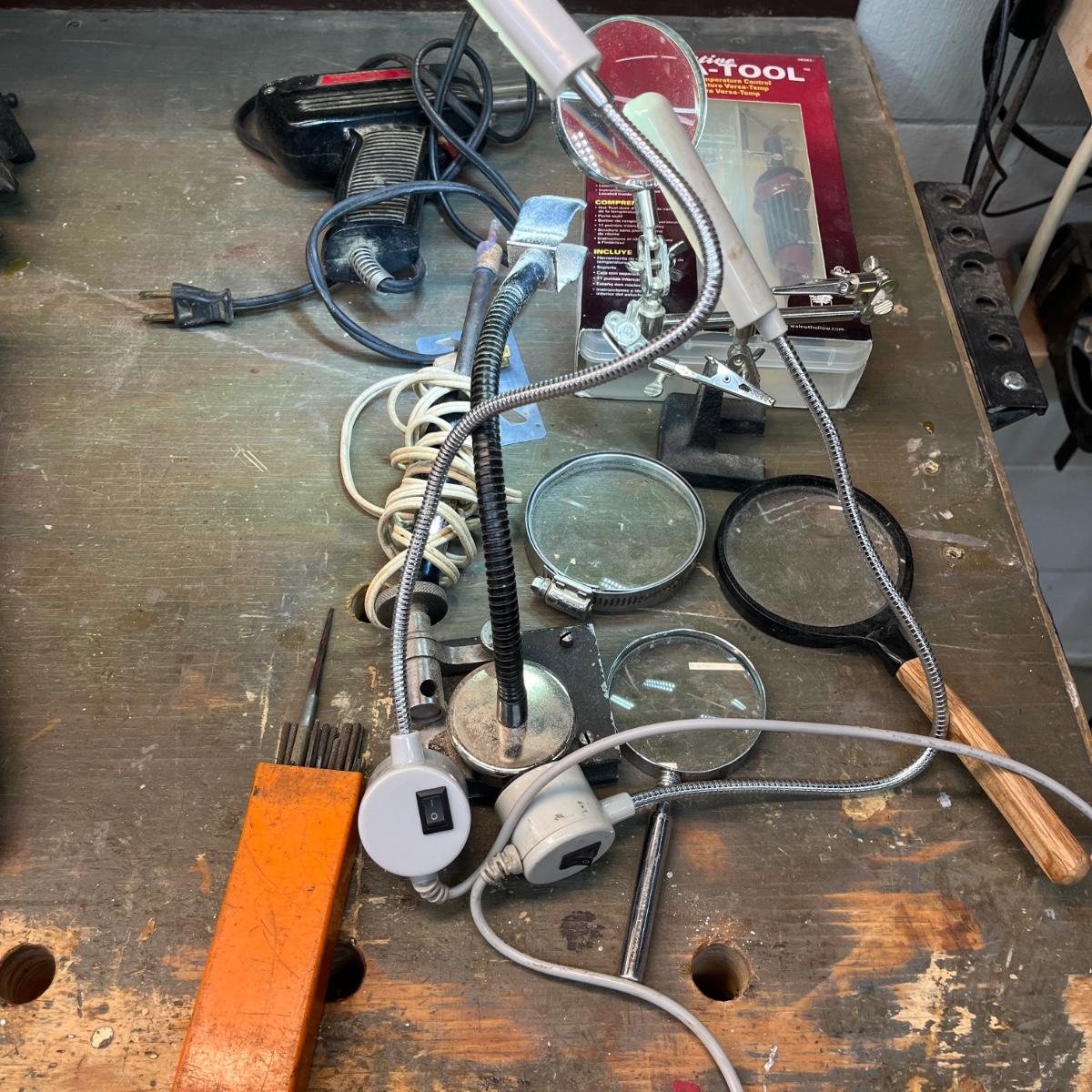 Lot includes Versa Tool, two soldering irons, two LED gooseneck lights with magnets for mounting, magnifying glasses, soldering station, files and a Brown & Sharpe surface gauge. Soldering irons and Versa tool powered on when plugged in.