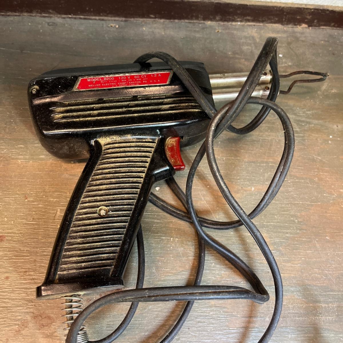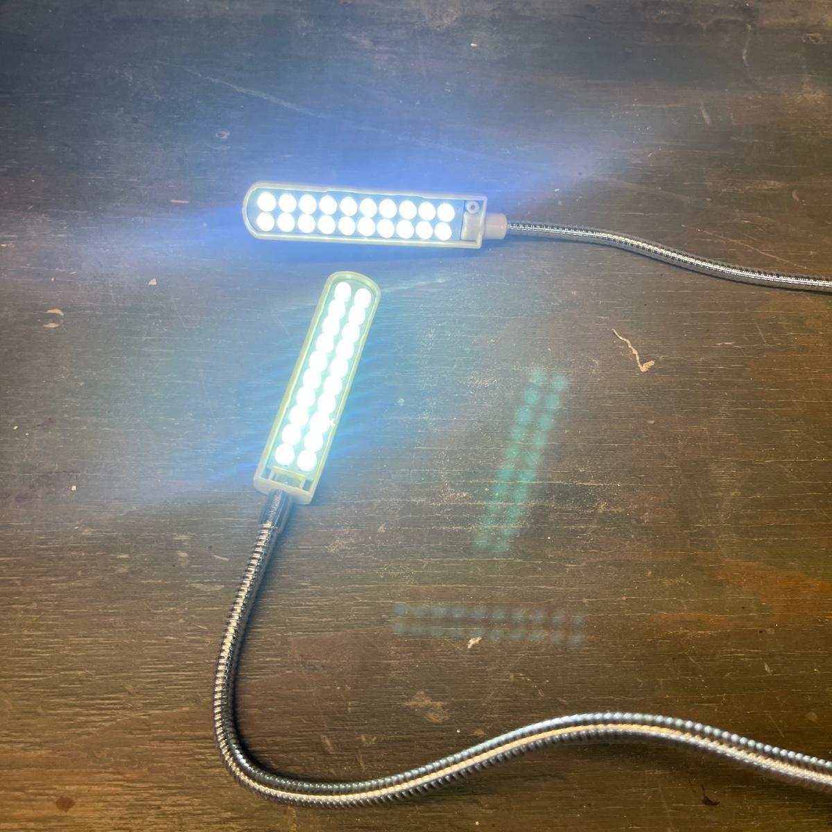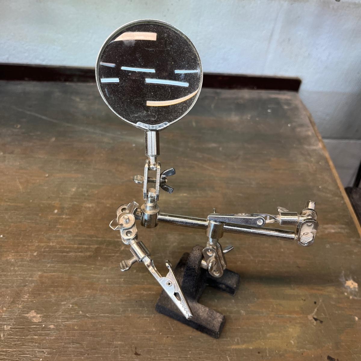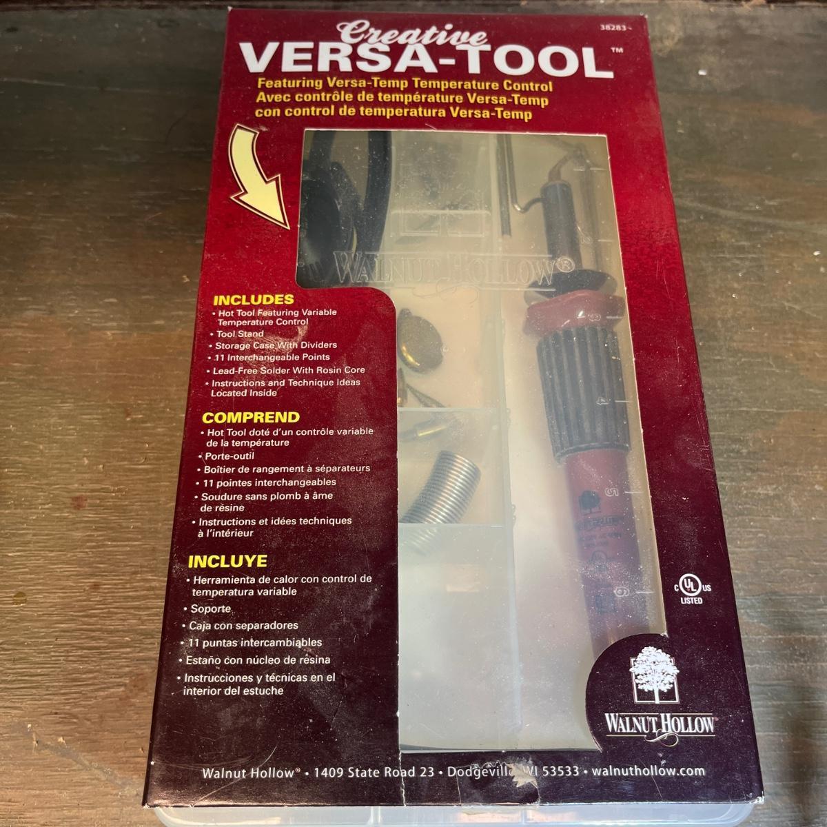 Lot includes Versa Tool, two soldering irons, two LED gooseneck lights with magnets for mounting, magnifying glasses, soldering station, files and a Brown & Sharpe surface gauge. Soldering irons and Versa tool powered on when plugged in.
