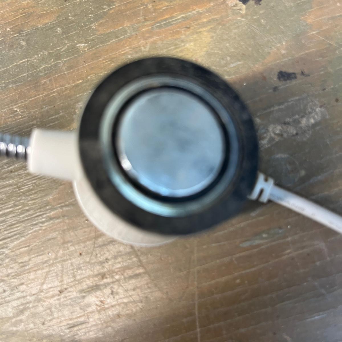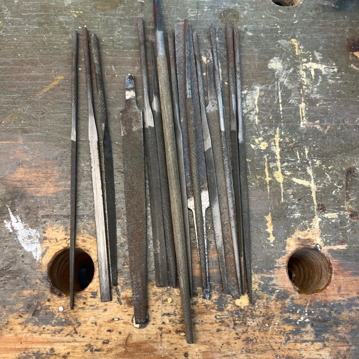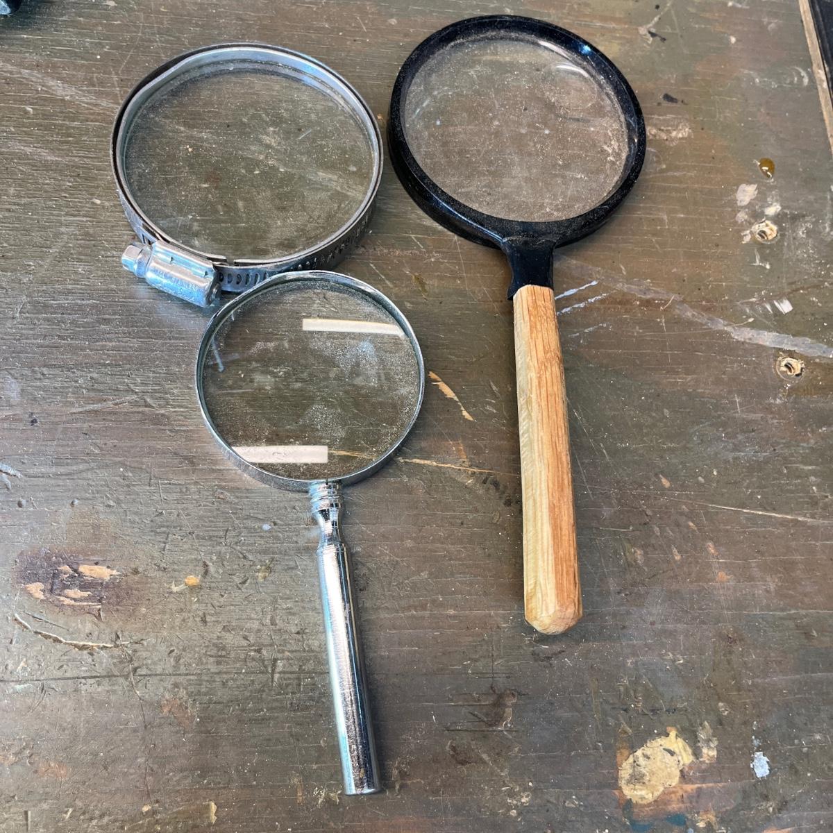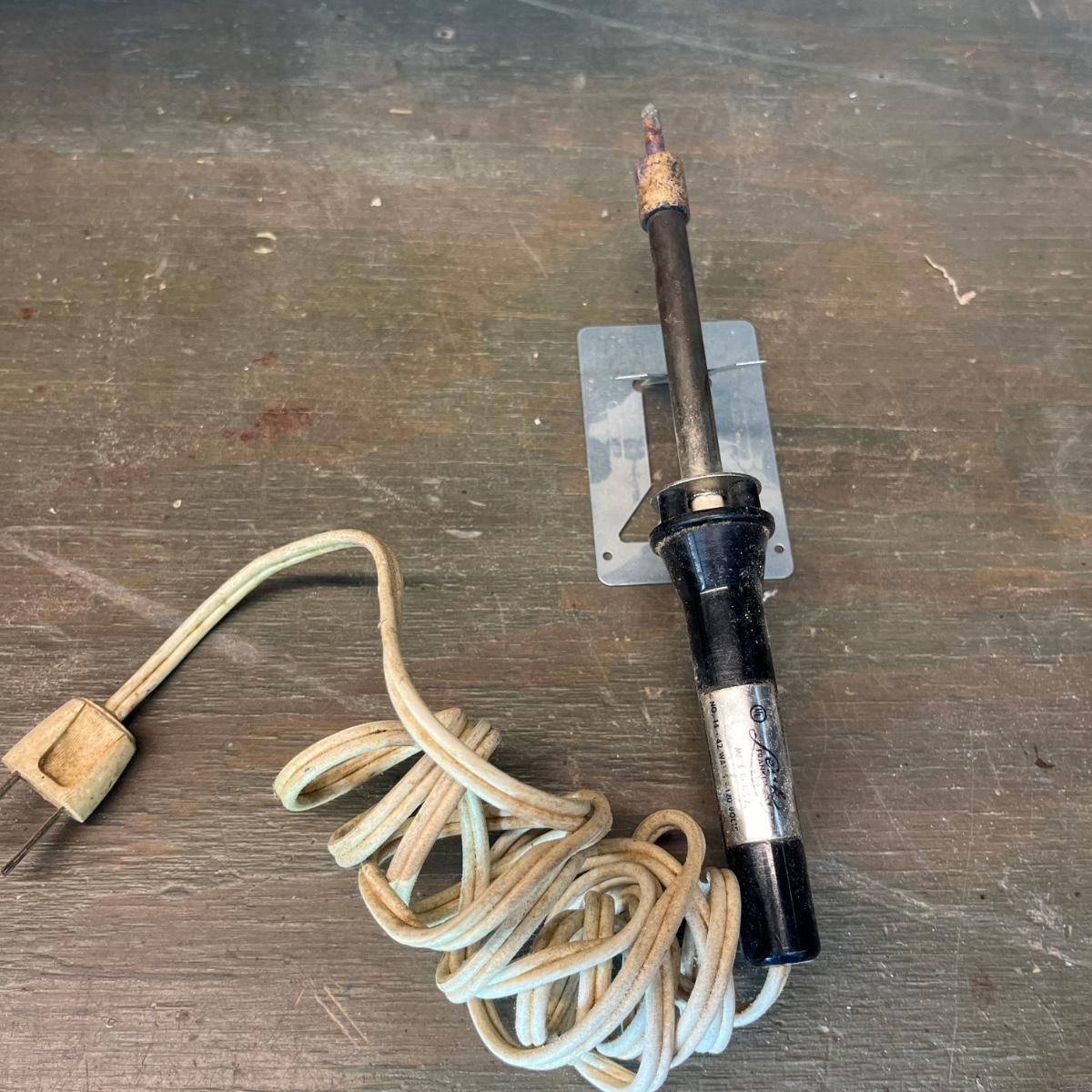 Lot includes Versa Tool, two soldering irons, two LED gooseneck lights with magnets for mounting, magnifying glasses, soldering station, files and a Brown & Sharpe surface gauge. Soldering irons and Versa tool powered on when plugged in.
