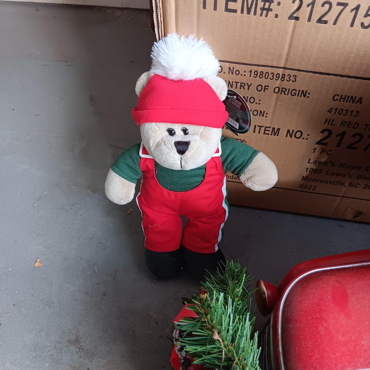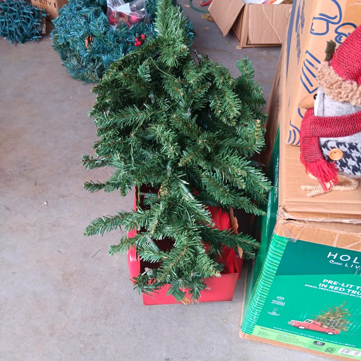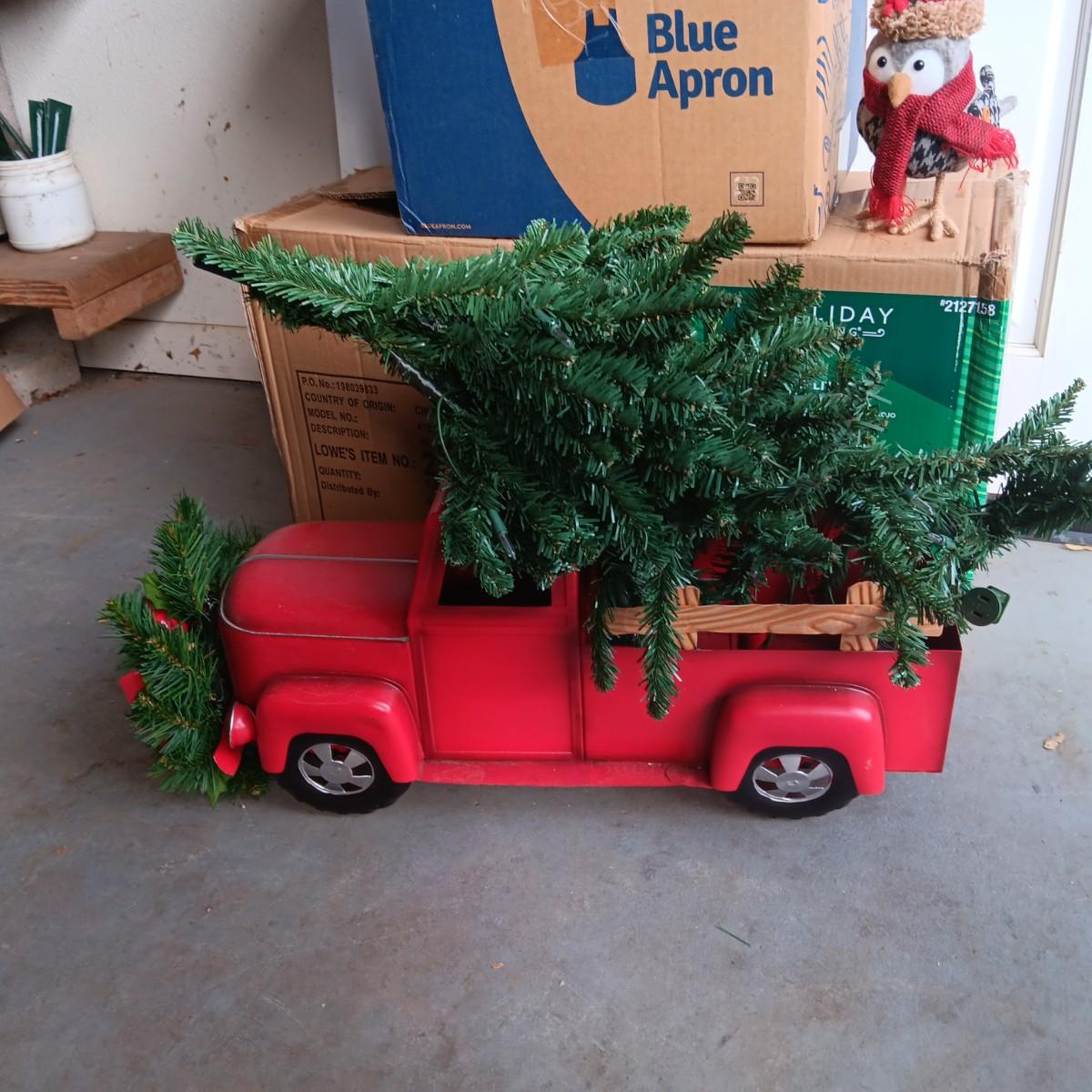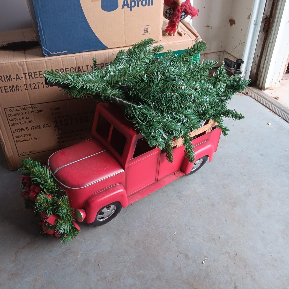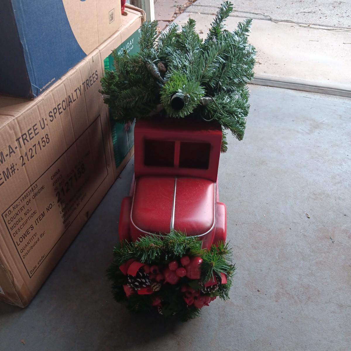 PRE-LIT TREE ON TOP OF RED TRUCK, WREATHS, FAUX FLOWERS AND SMALL PLUSH ANIMALS
