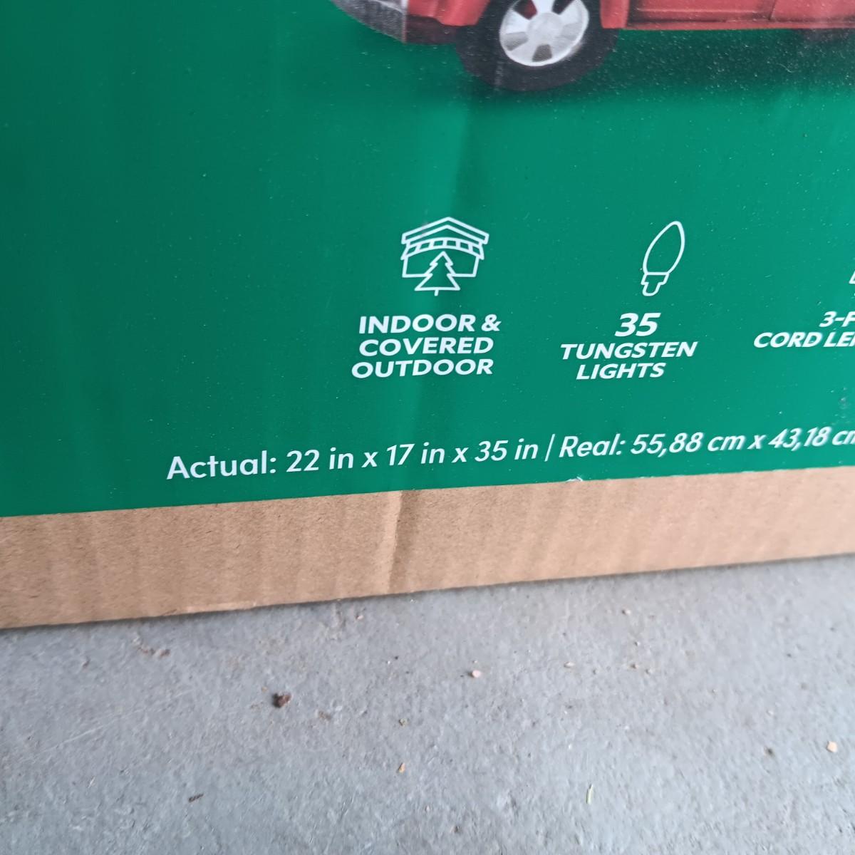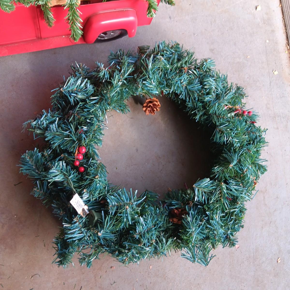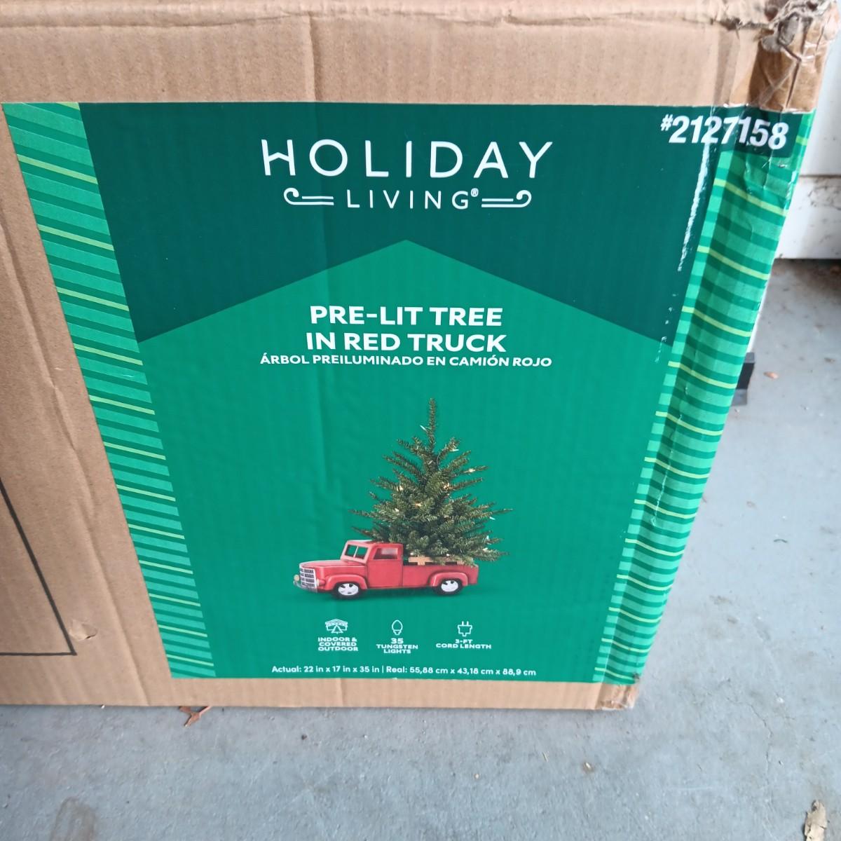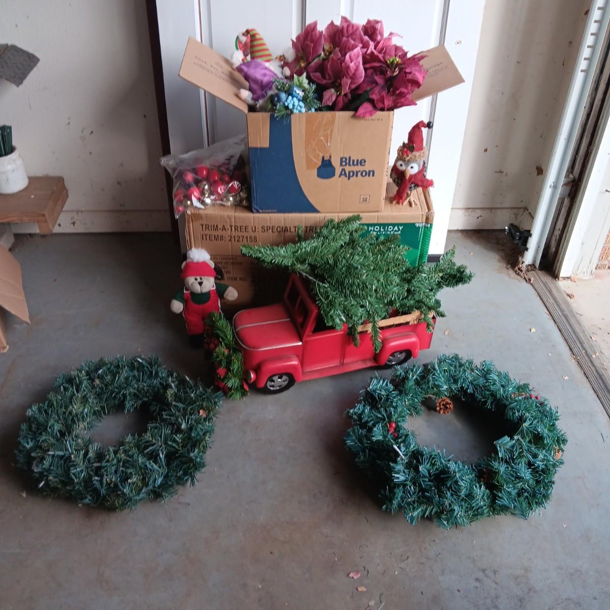 PRE-LIT TREE ON TOP OF RED TRUCK, WREATHS, FAUX FLOWERS AND SMALL PLUSH ANIMALS