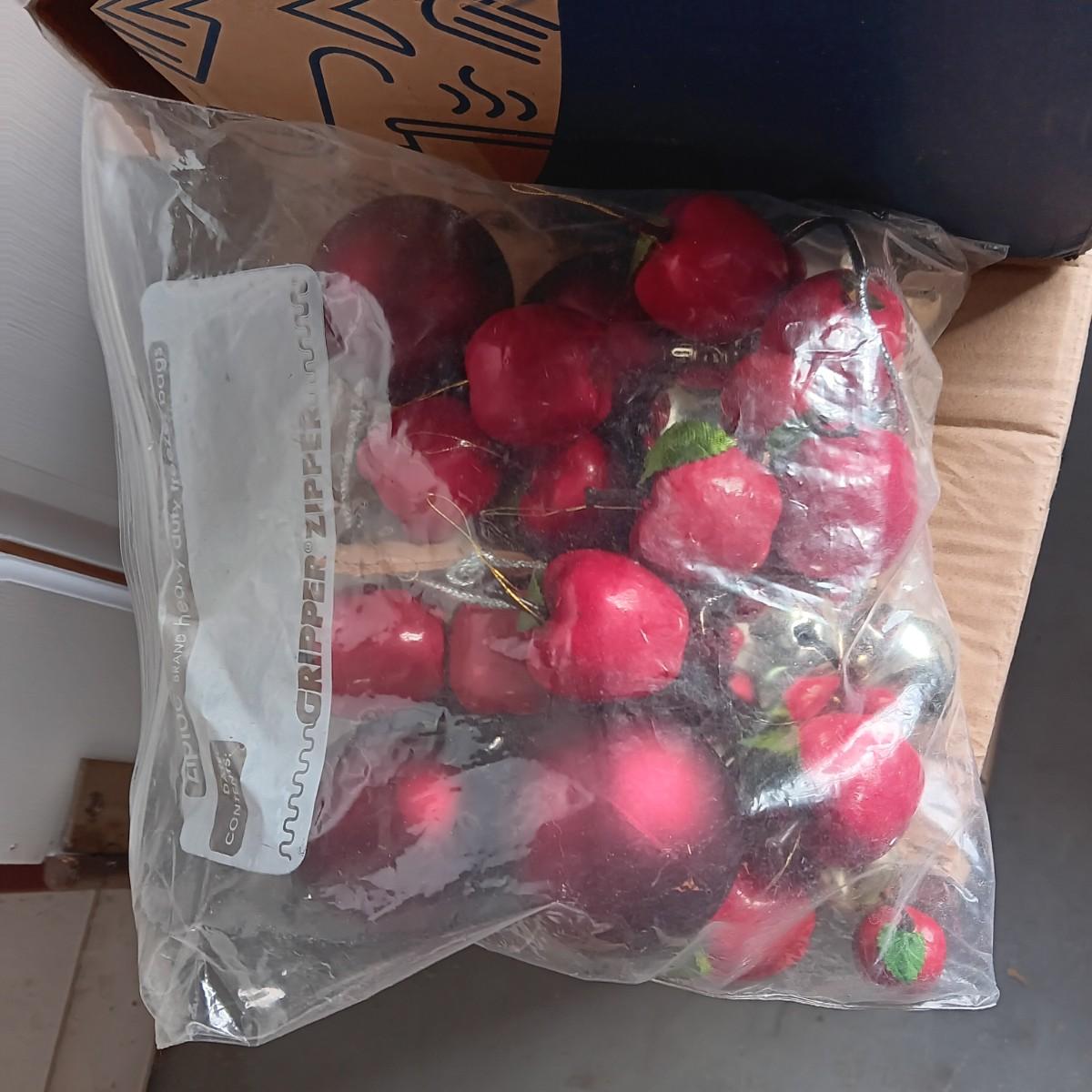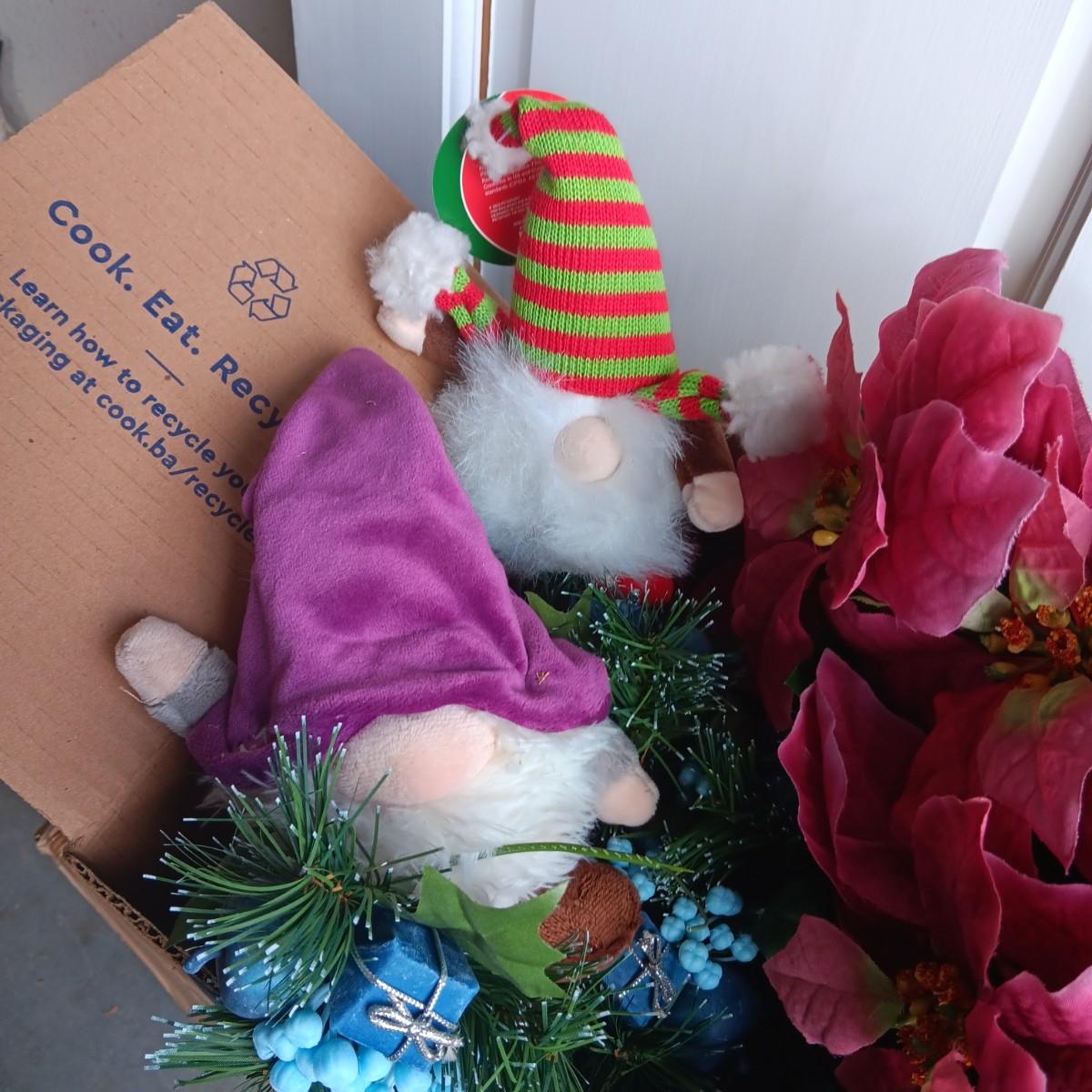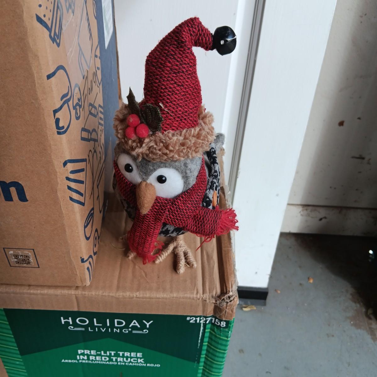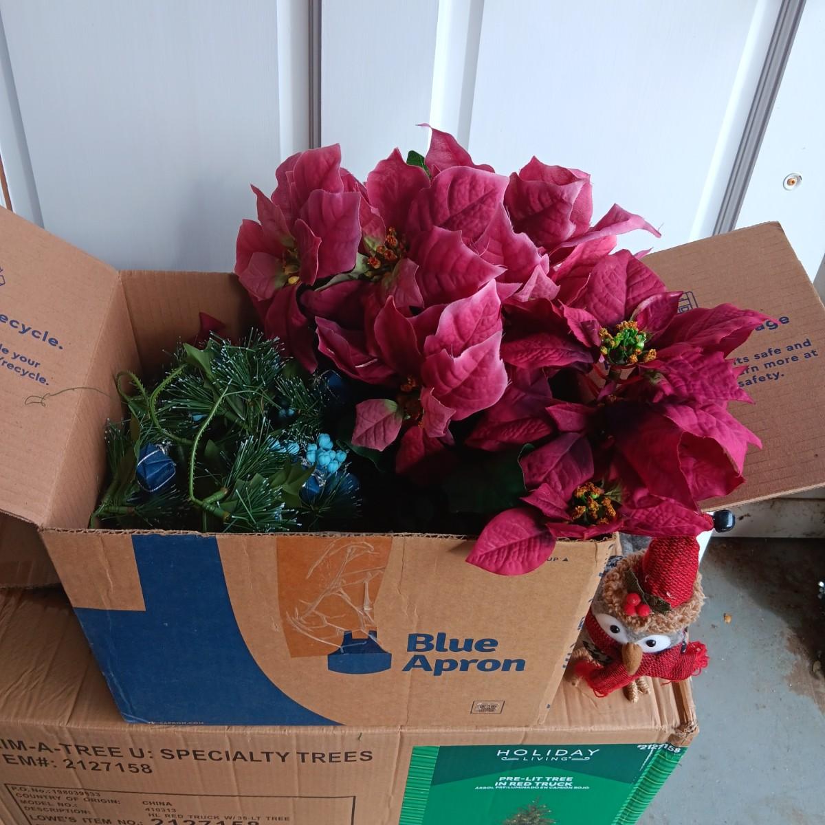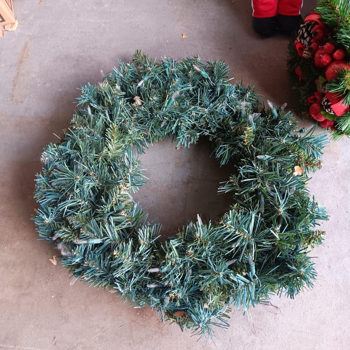 PRE-LIT TREE ON TOP OF RED TRUCK, WREATHS, FAUX FLOWERS AND SMALL PLUSH ANIMALS