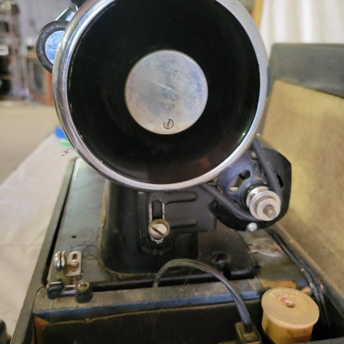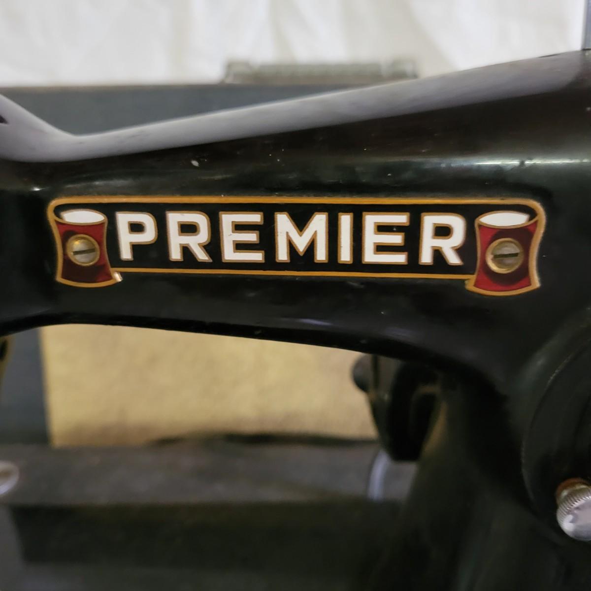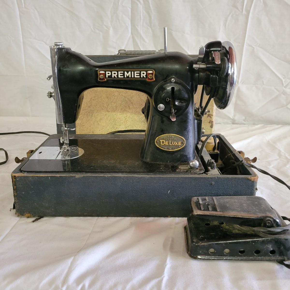 A vintage Premier sewing machine that powered on when plugged in. The wiring is a bit old and frayed, but could easily be refurbished. This sewing machine is in its original carrying case and turned over smoothly when turned on. It includes the original foot pedal and the case measures approximately 15.5" x 9.5" x 12"H. Local pickup only