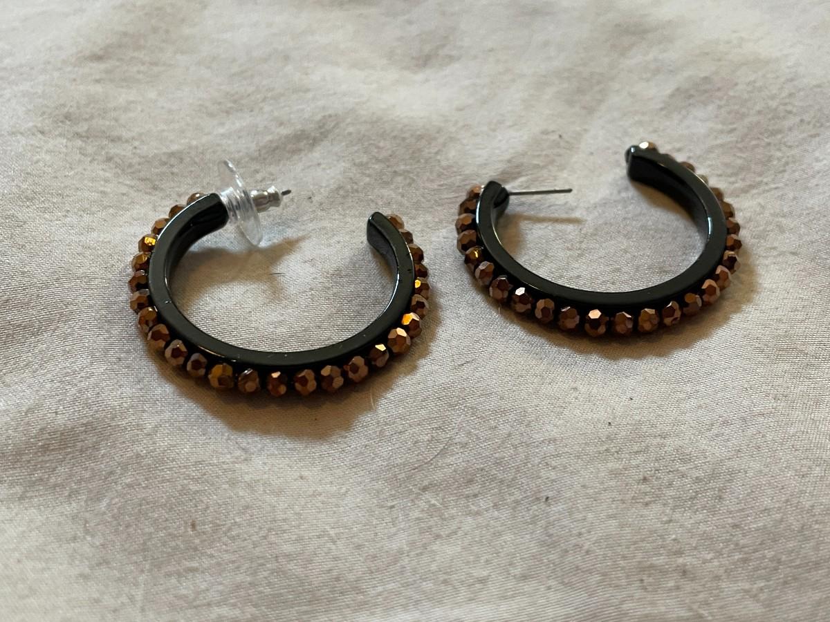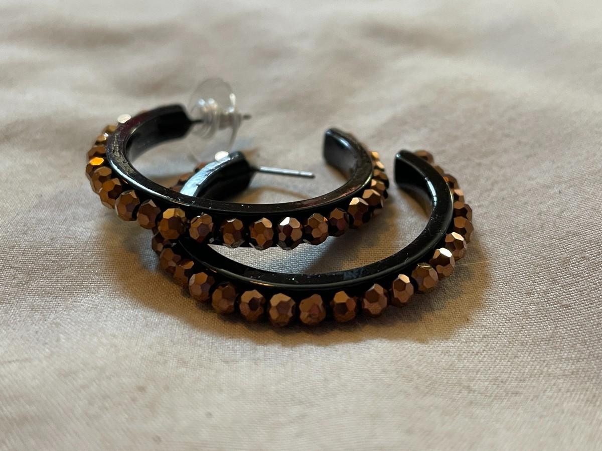 These earrings are made from open loop black enamel covered metal with copper colored glass beads. The earrings are just under 1.5 inches in diameter and the only issue is that they need new backs.