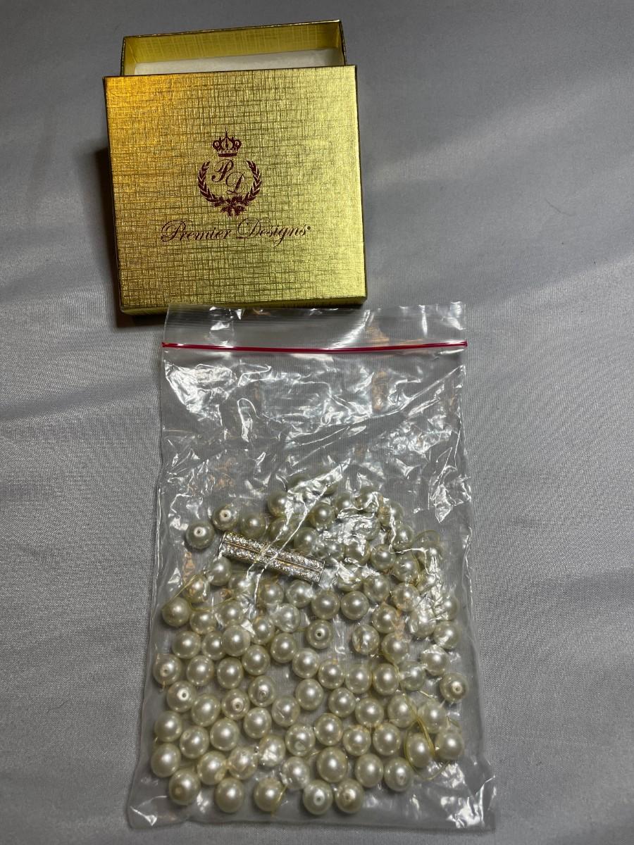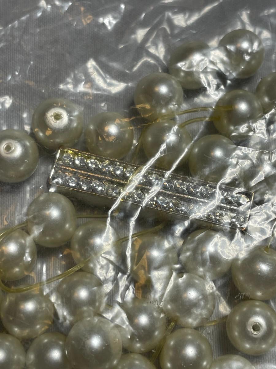 This bracelet does need to be re-strung, but appears to be quality, glass faux pearl beads with a rhinestone embellished clasp.