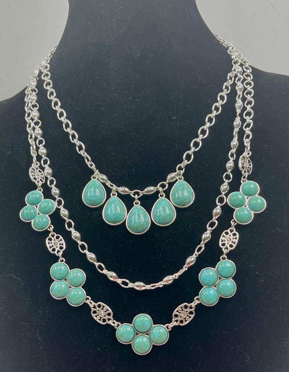 Premier, jewelry, necklace, tri strand turquoise, with silver tone chain