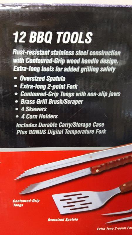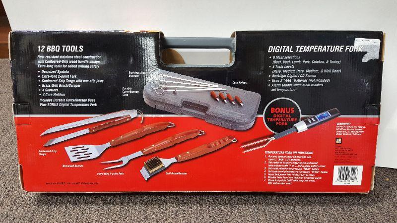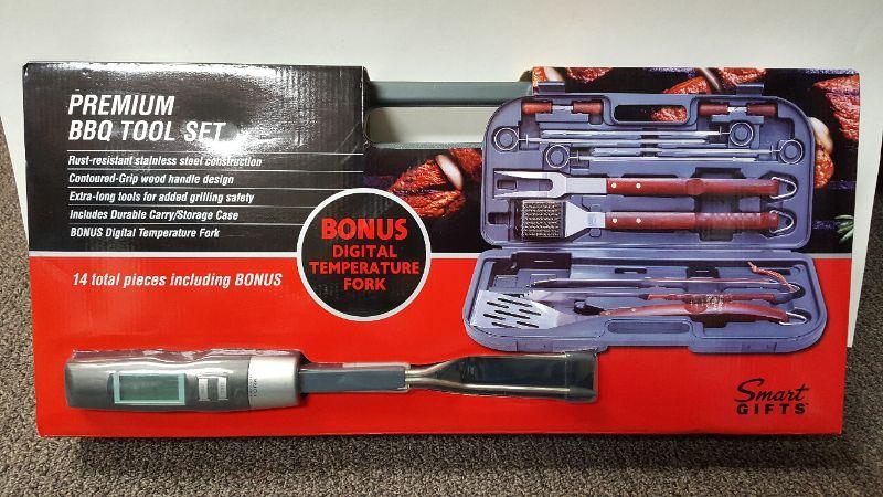 Premium BBQ tool set 14 total pieces, including a bonus digital temperature fork by Smart Gifts. Comes in a durable storage case. Never used.