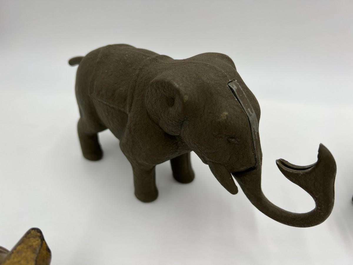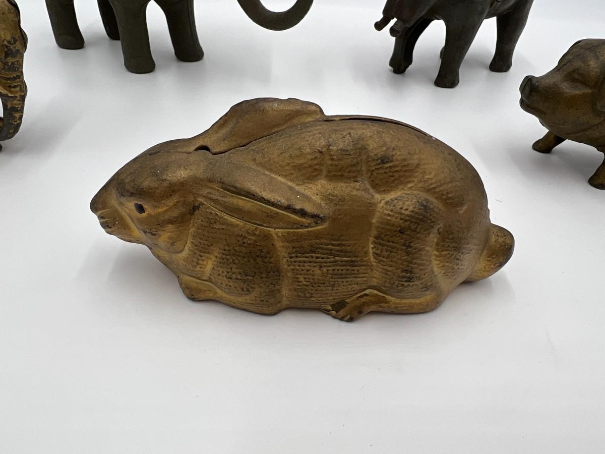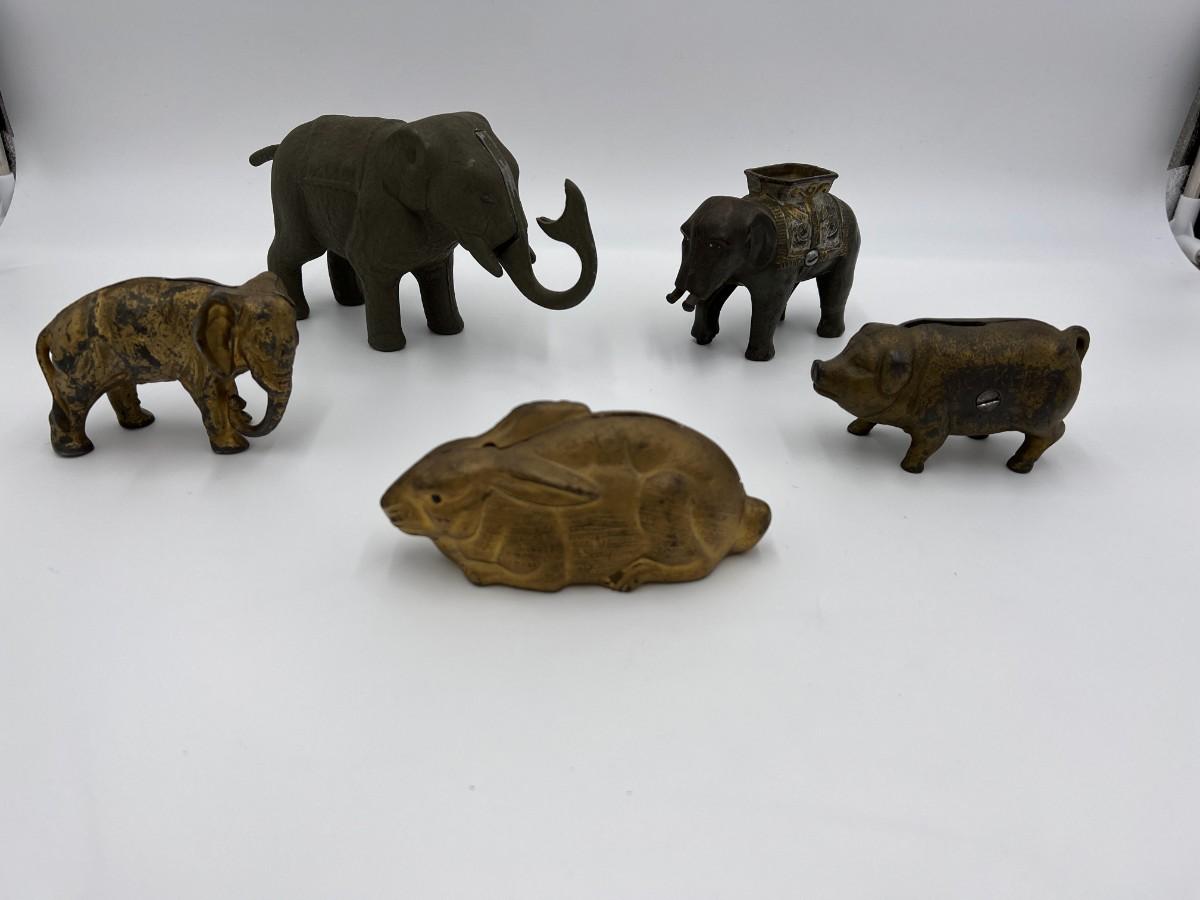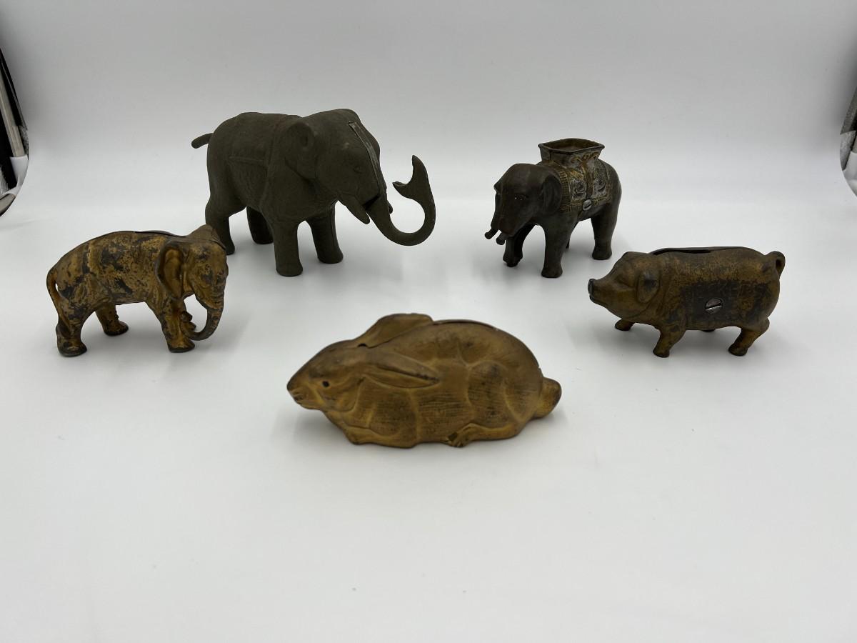 Premium Lot of 5 Antique Collector Metal or Cast Iron Animal Coin Banks. Includes 3 elephants (one is missing its trunk, as shown), a pig, and a rabbit (or hare). Conditions as shown.