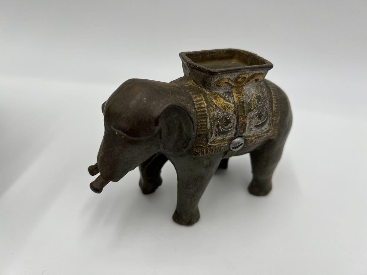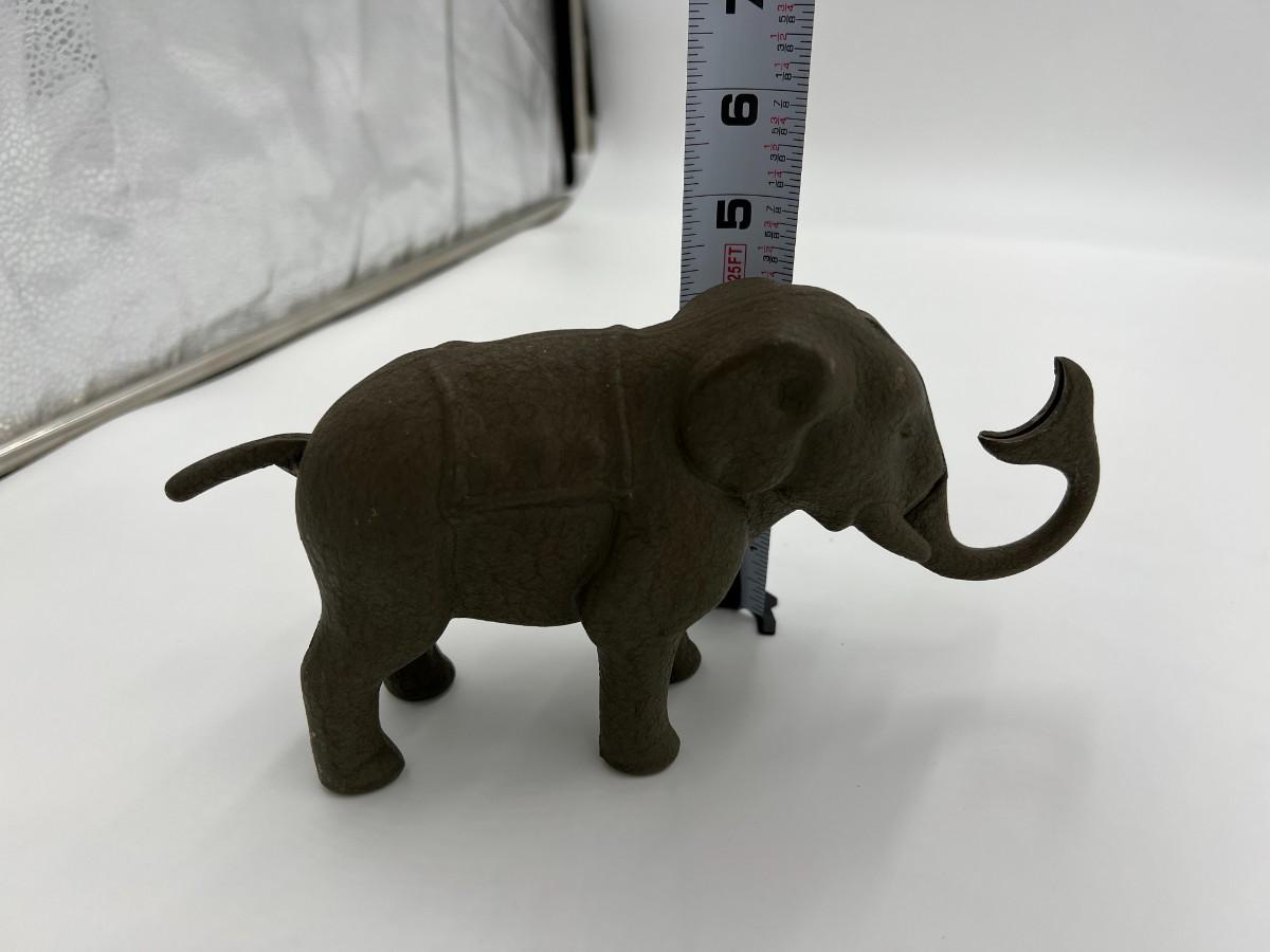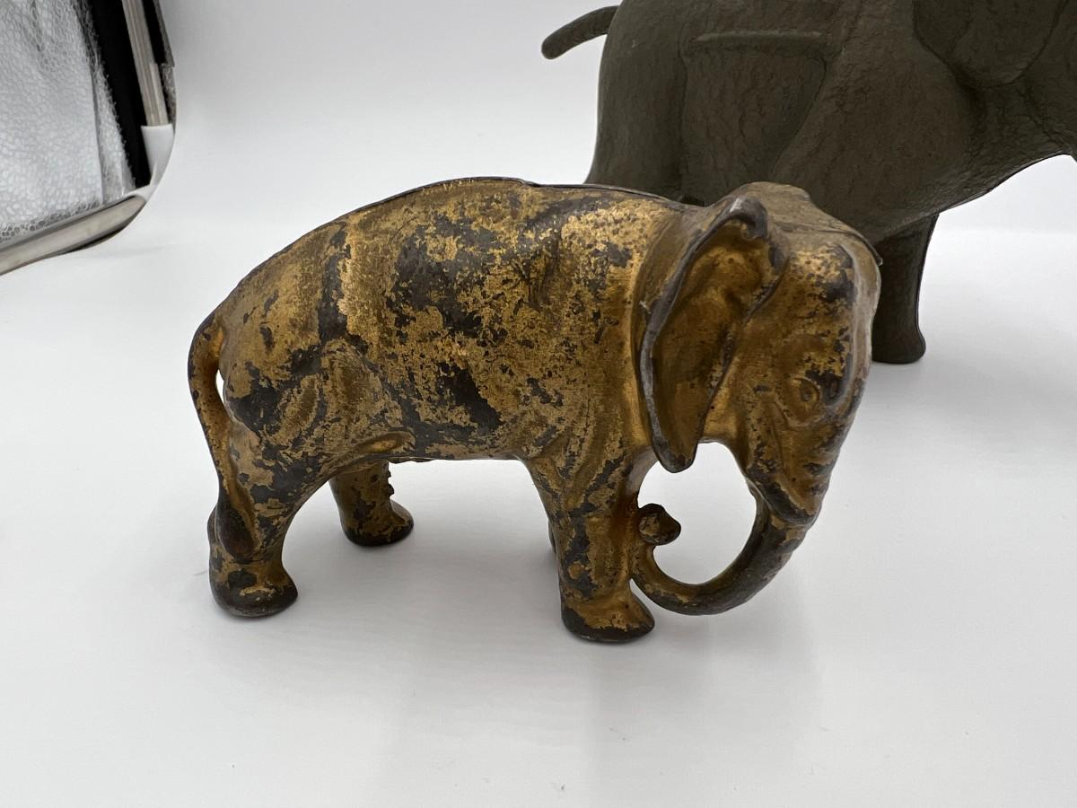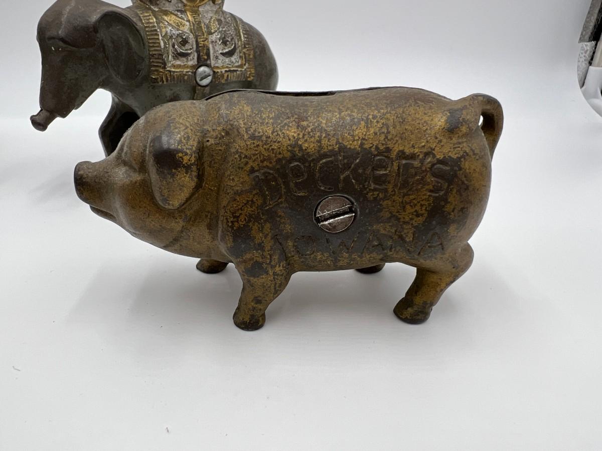 Premium Lot of 5 Antique Collector Metal or Cast Iron Animal Coin Banks. Includes 3 elephants (one is missing its trunk, as shown), a pig, and a rabbit (or hare). Conditions as shown.