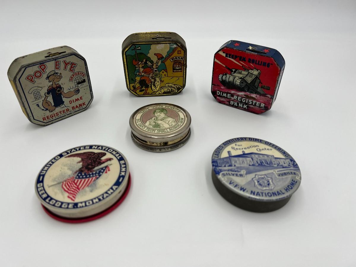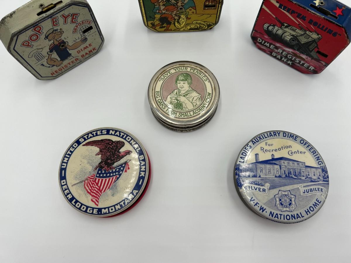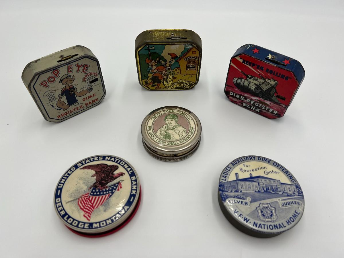 Premium Lot of 6 Dime Coin Banks. Banks include Pop Eye (Popeye), United States National Bank Deer Lodge Montana, V.F.W. National Home, Keem 'Em Rolling Dime Register Bank (featuring a US Army Tank), Girl Scouts Save Your Acorns, and Ladies Aux. Conditions as shown.