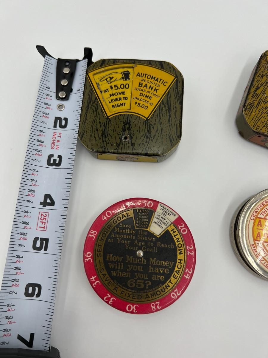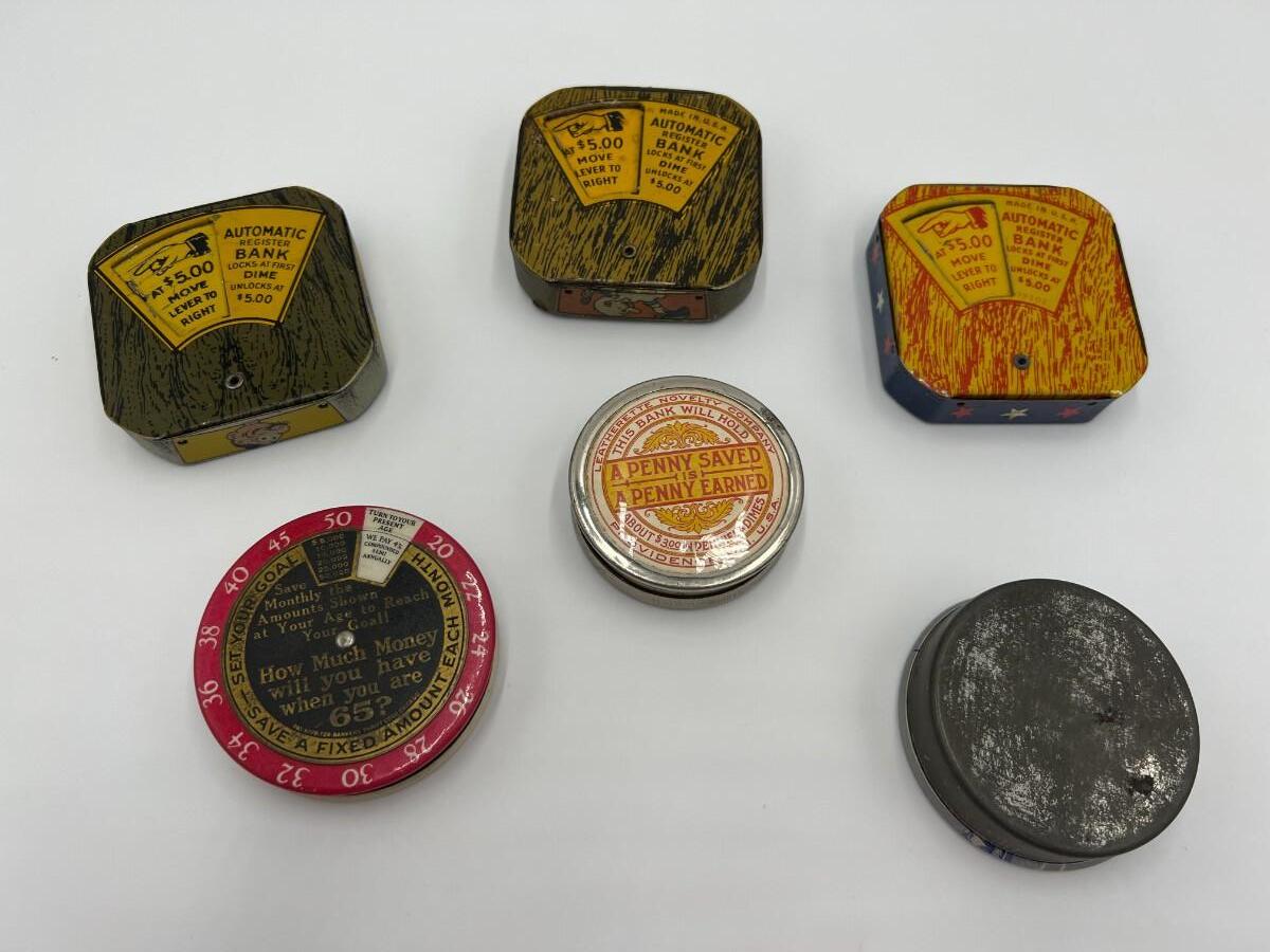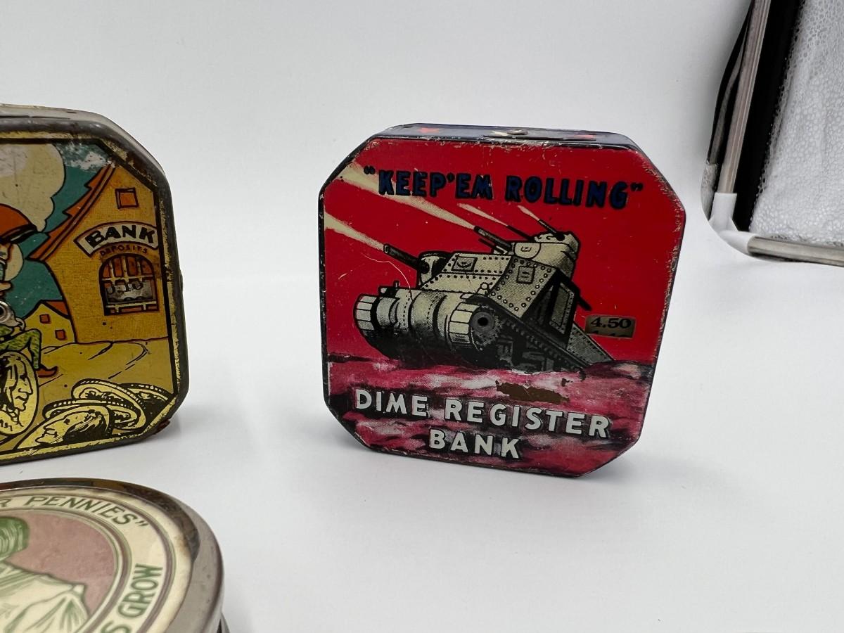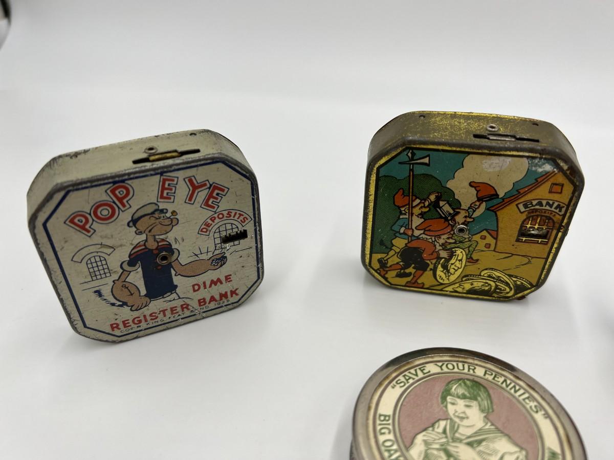 Premium Lot of 6 Dime Coin Banks. Banks include Pop Eye (Popeye), United States National Bank Deer Lodge Montana, V.F.W. National Home, Keem 'Em Rolling Dime Register Bank (featuring a US Army Tank), Girl Scouts Save Your Acorns, and Ladies Aux. Conditions as shown.