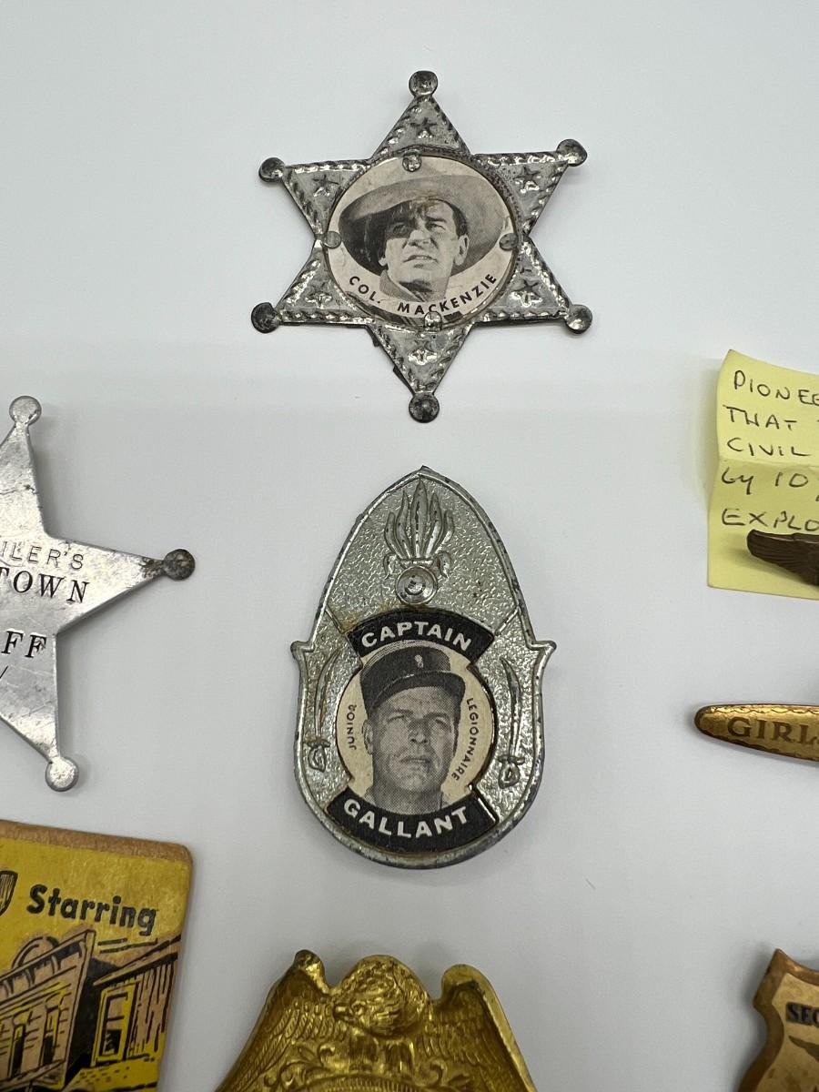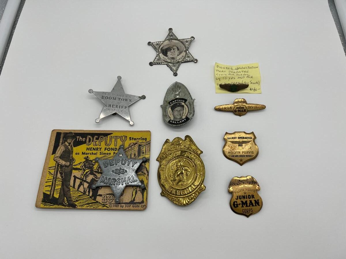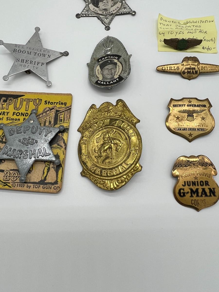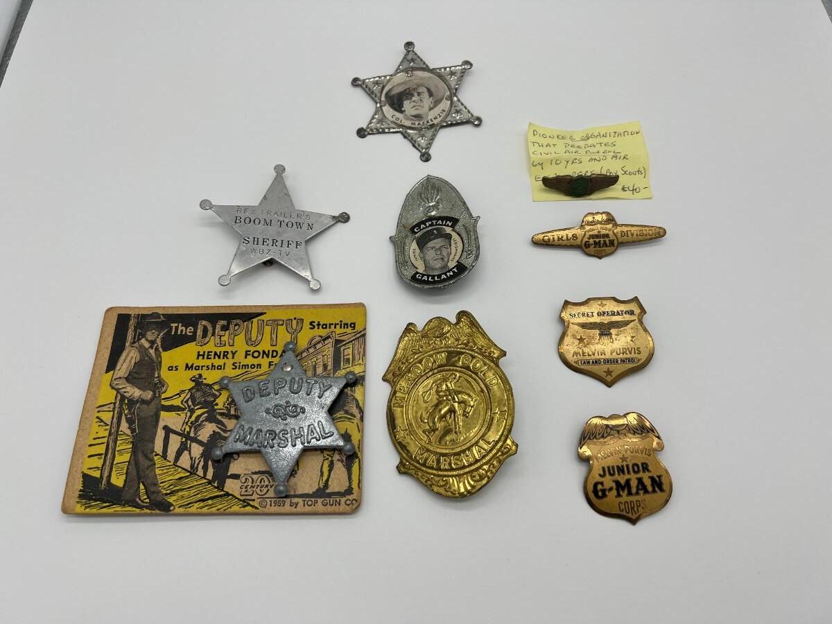 Premium Lot of 9 Antique Badges and Pins. Lot includes Henry Fonda Badge on Original paper packaging, Pin-Up TV Heroes Badge Col. Mackenzie, Melvin Purvis G-Man Badge, Melvin Purvis Girls Division pin and pin back, Secret Operator, Captain Gallant Badge, Sherrif Rex Trailer Boomtown Badge, and 1940s Lightning Jim Tin Toy Marshal Badge of Meadow Gold Dairy. Condition as shown.