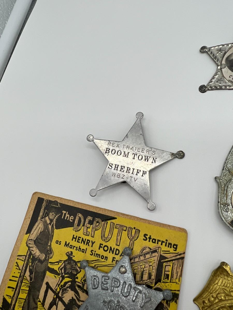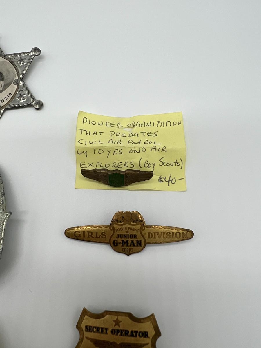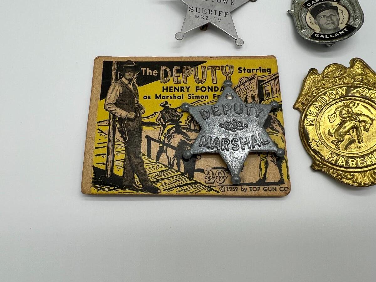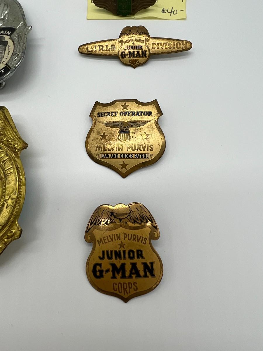 Premium Lot of 9 Antique Badges and Pins. Lot includes Henry Fonda Badge on Original paper packaging, Pin-Up TV Heroes Badge Col. Mackenzie, Melvin Purvis G-Man Badge, Melvin Purvis Girls Division pin and pin back, Secret Operator, Captain Gallant Badge, Sherrif Rex Trailer Boomtown Badge, and 1940s Lightning Jim Tin Toy Marshal Badge of Meadow Gold Dairy. Condition as shown.