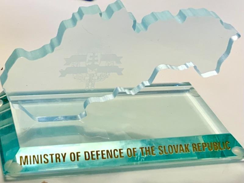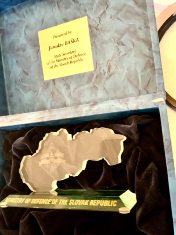 A boxed diplomatic gift from the Ministry of Defence of the Slovak Republic from Jaroslav Baska, this is mounted crystal in shape of country of Slovakia with Slovak cross etched upon it and gilt lettering on base. In blue velvet lined box