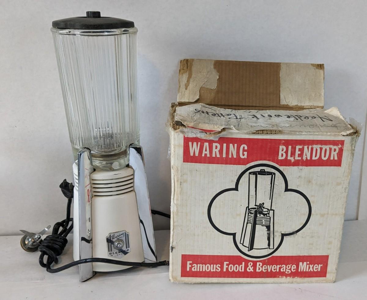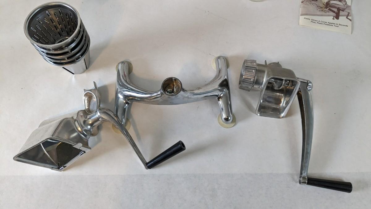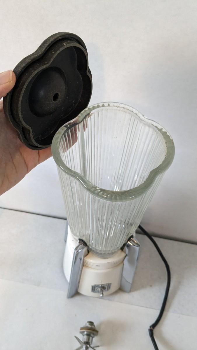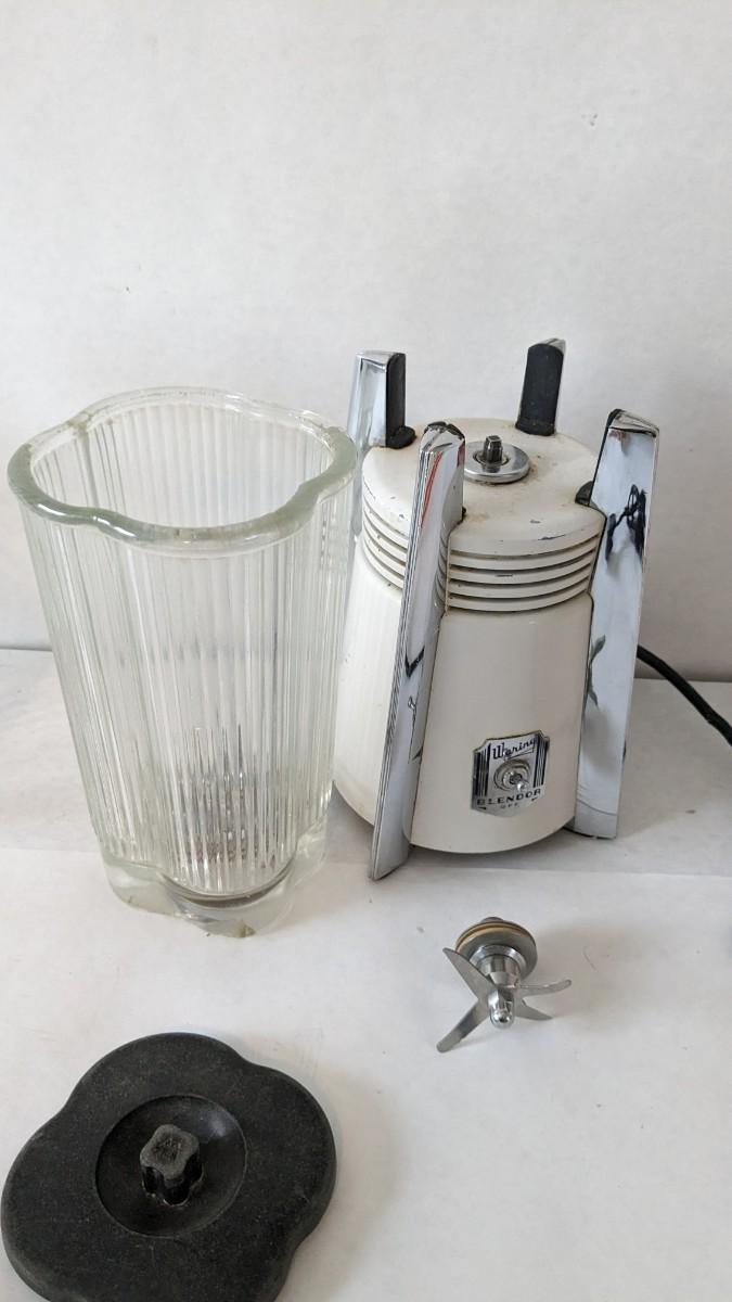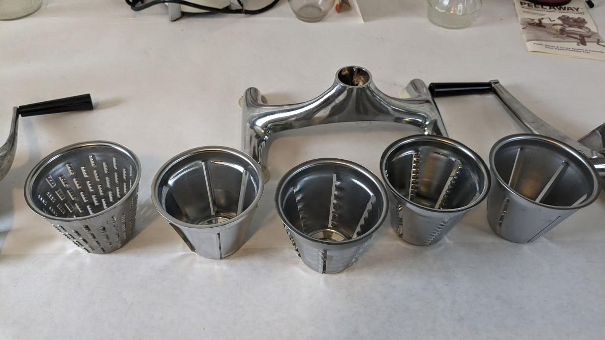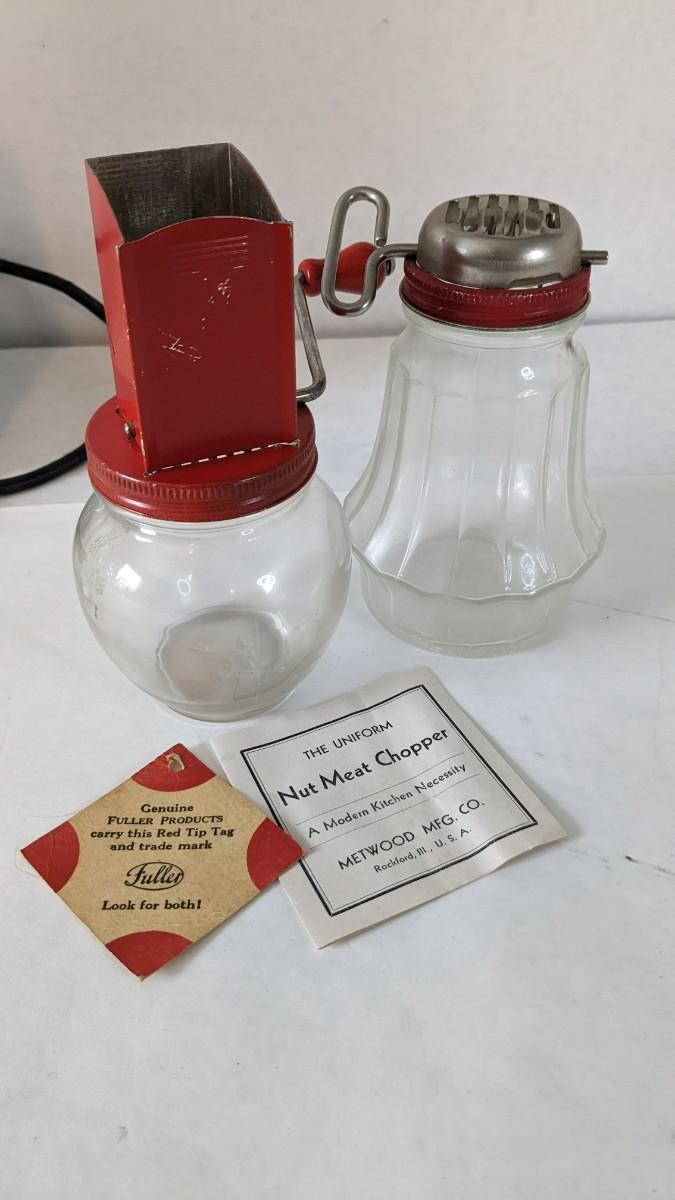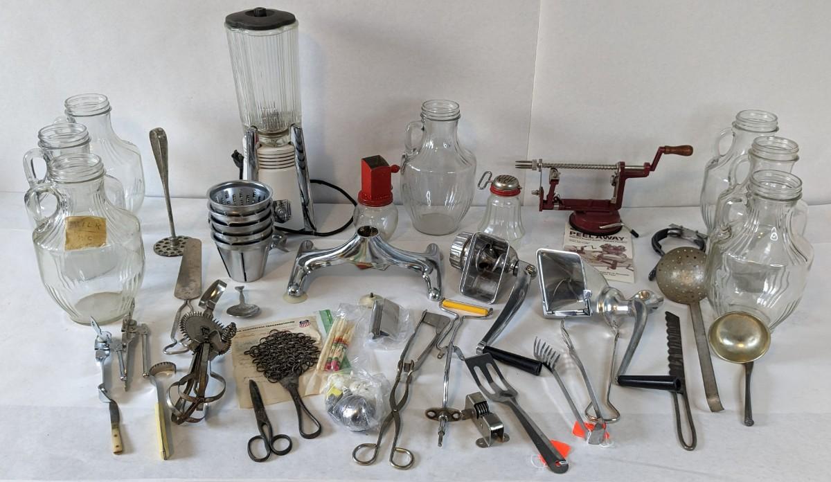 Another great little assortment of kitchen essentials for life on the farm. Includes 7 Speas Co U-Save It glass pitchers with 2.5" threaded openings, apple peeler/corer/slicer with manual, 2 countertop grinders with attachments and stand, various utensils, and beautiful early blender in original box not damage on bottom of glass base that is easily hidden with display. No shipping