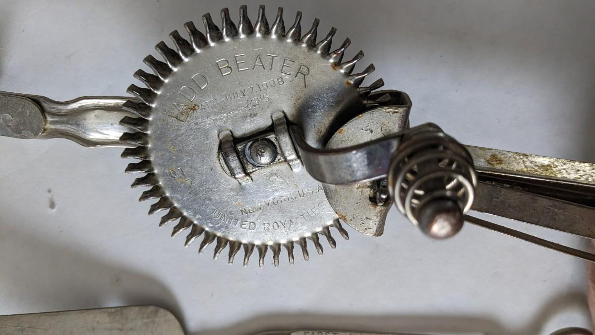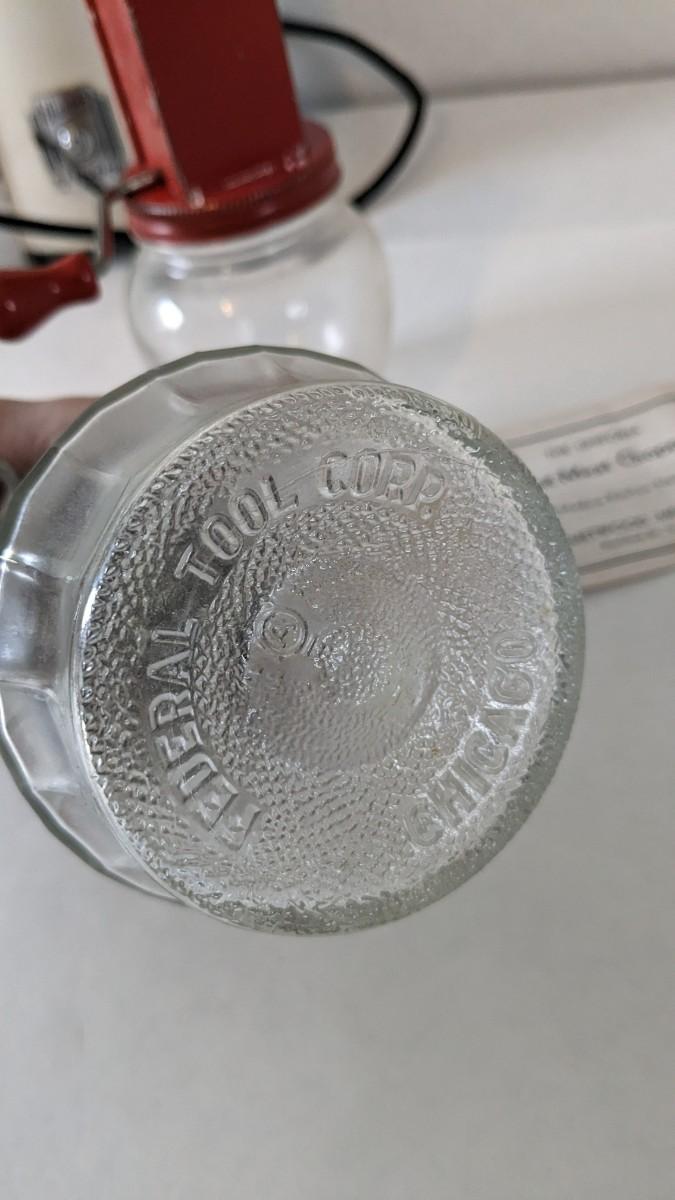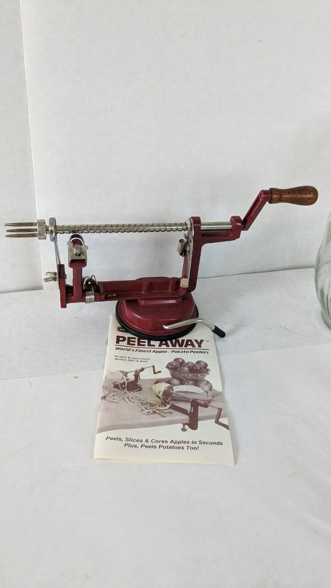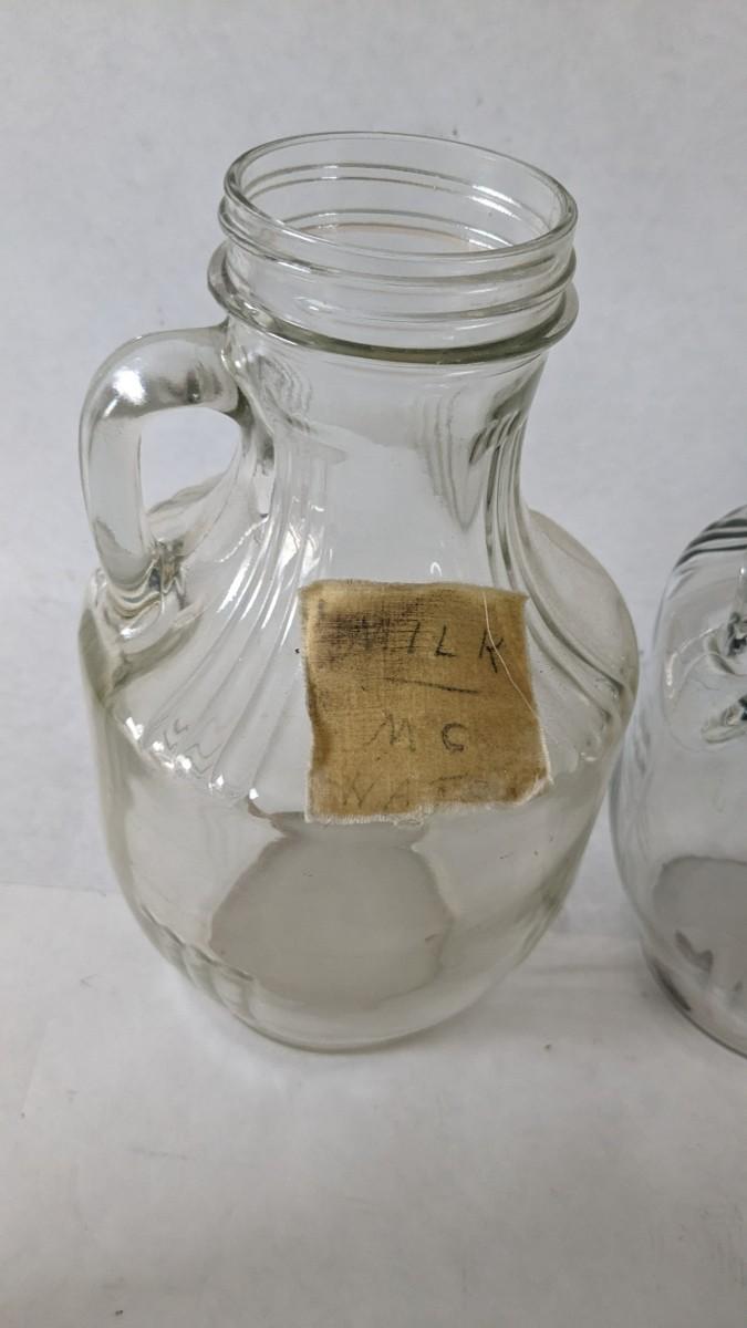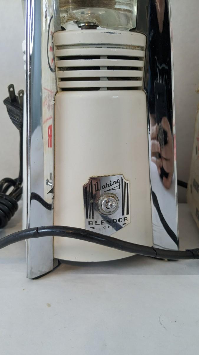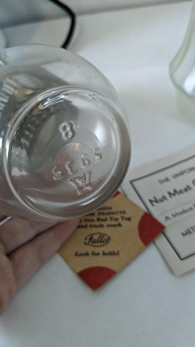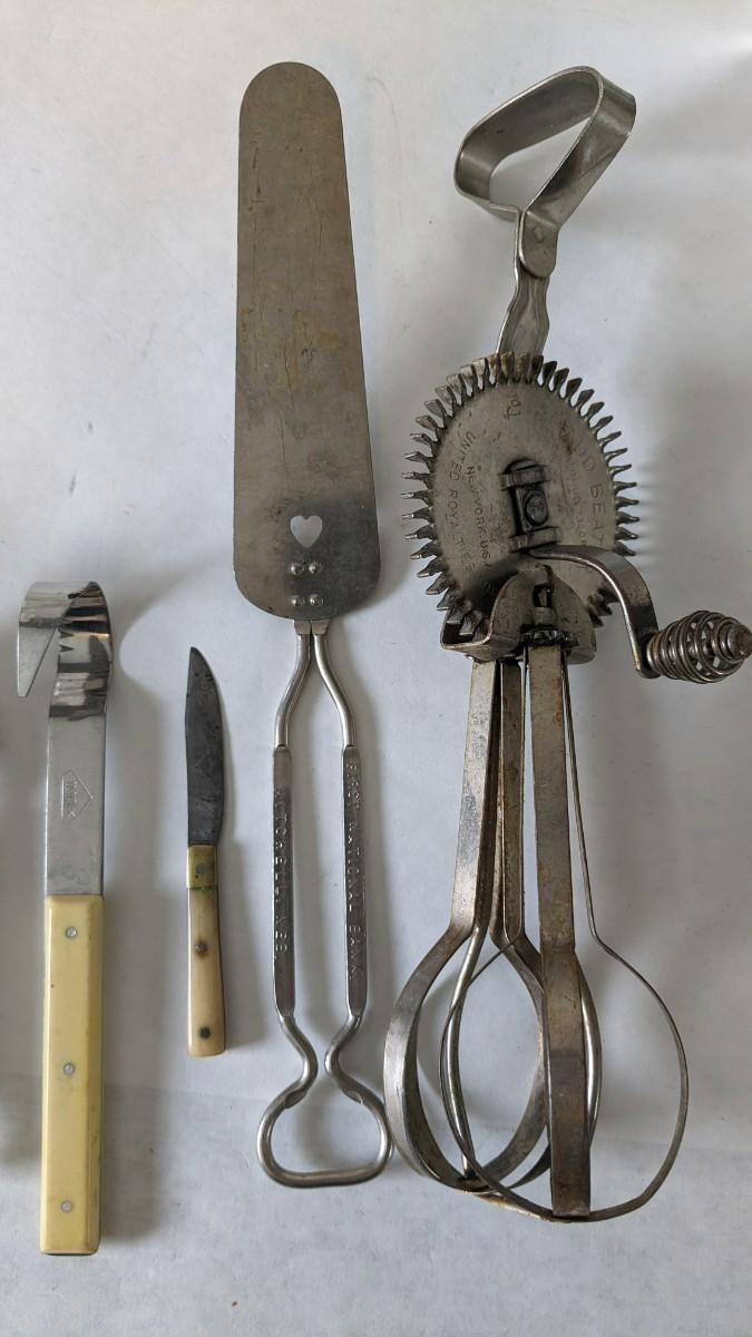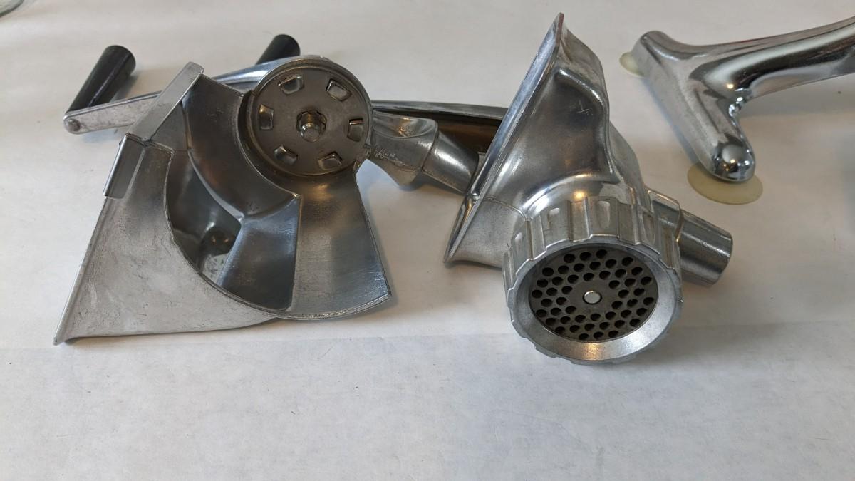 Another great little assortment of kitchen essentials for life on the farm. Includes 7 Speas Co U-Save It glass pitchers with 2.5" threaded openings, apple peeler/corer/slicer with manual, 2 countertop grinders with attachments and stand, various utensils, and beautiful early blender in original box not damage on bottom of glass base that is easily hidden with display. No shipping