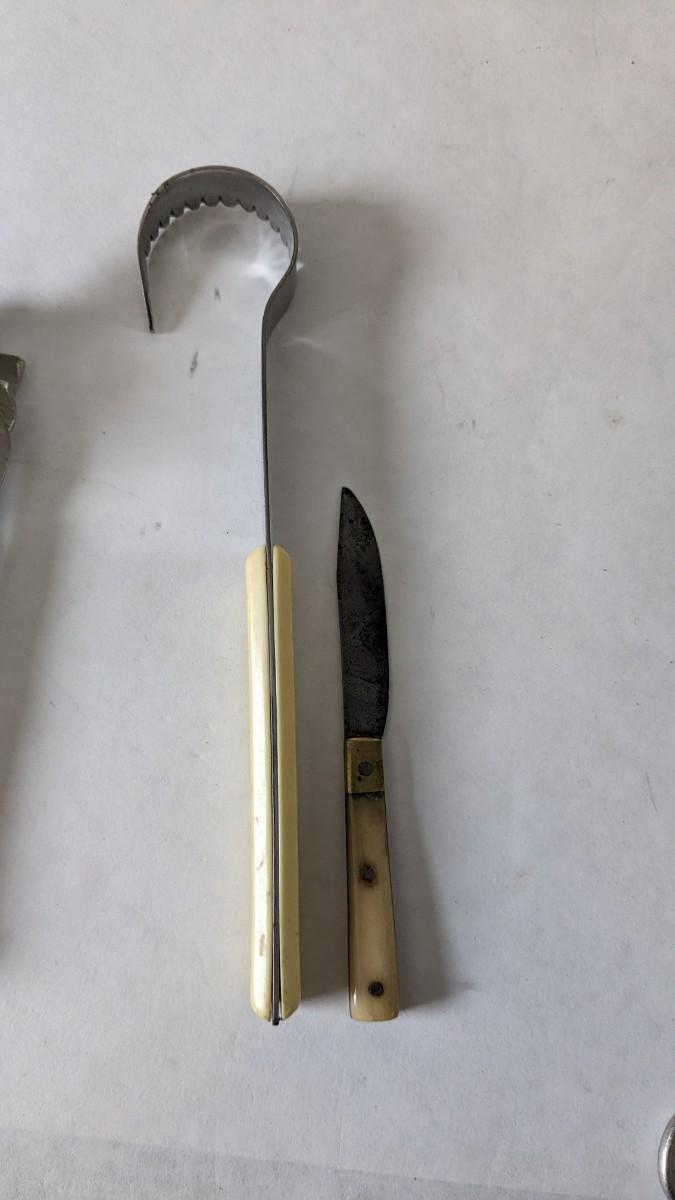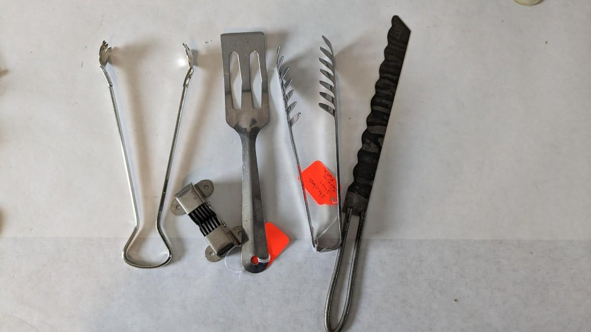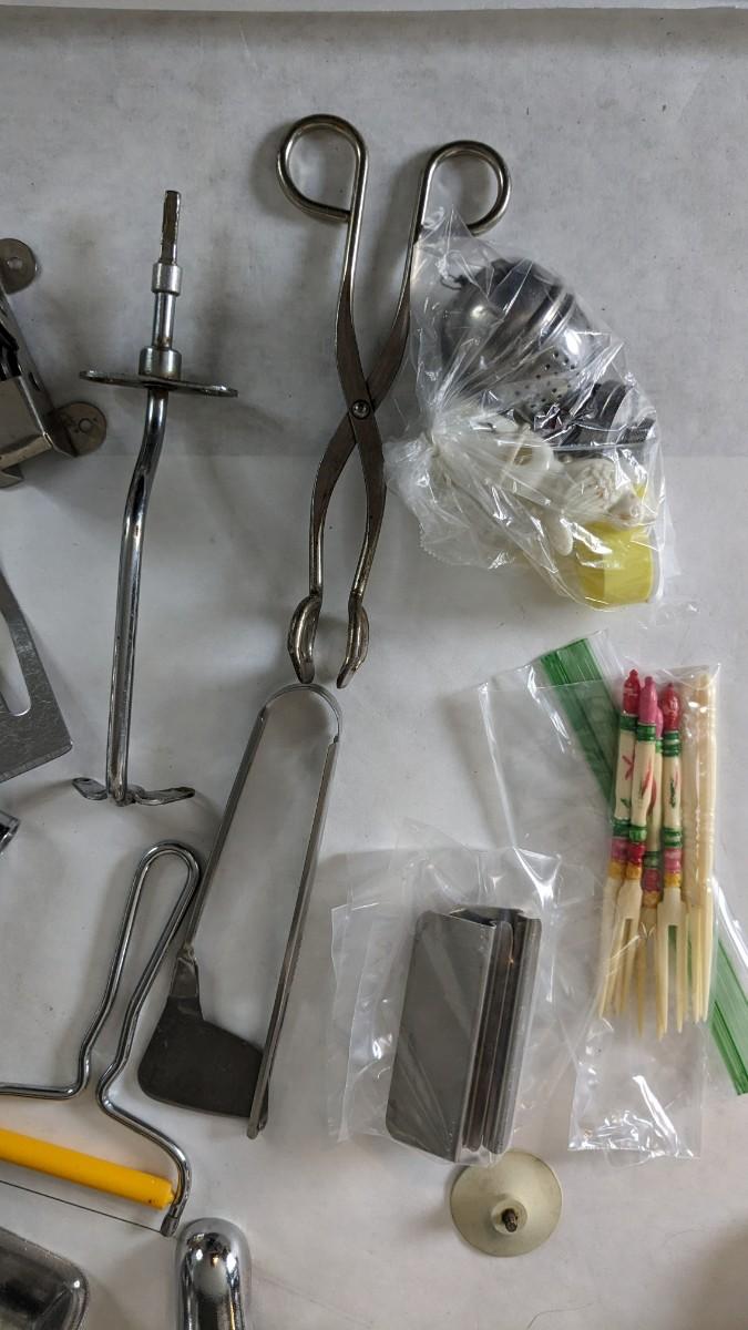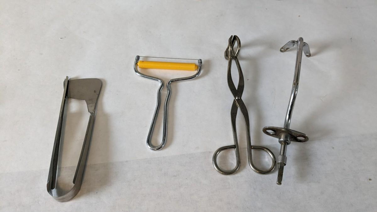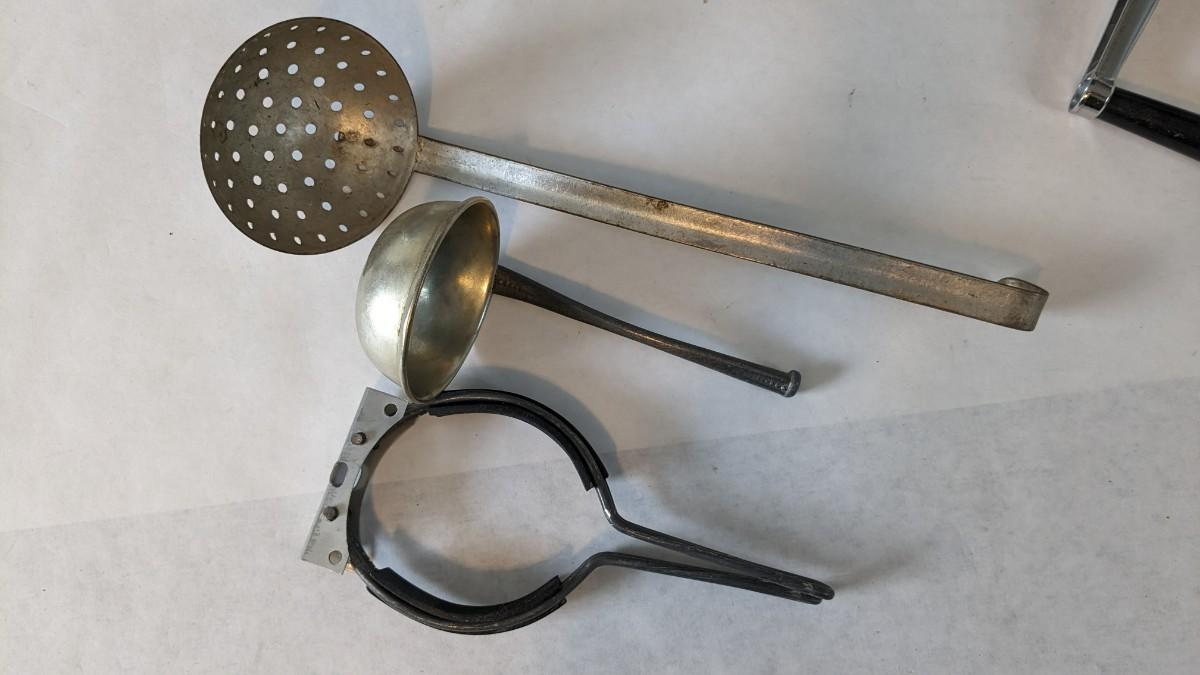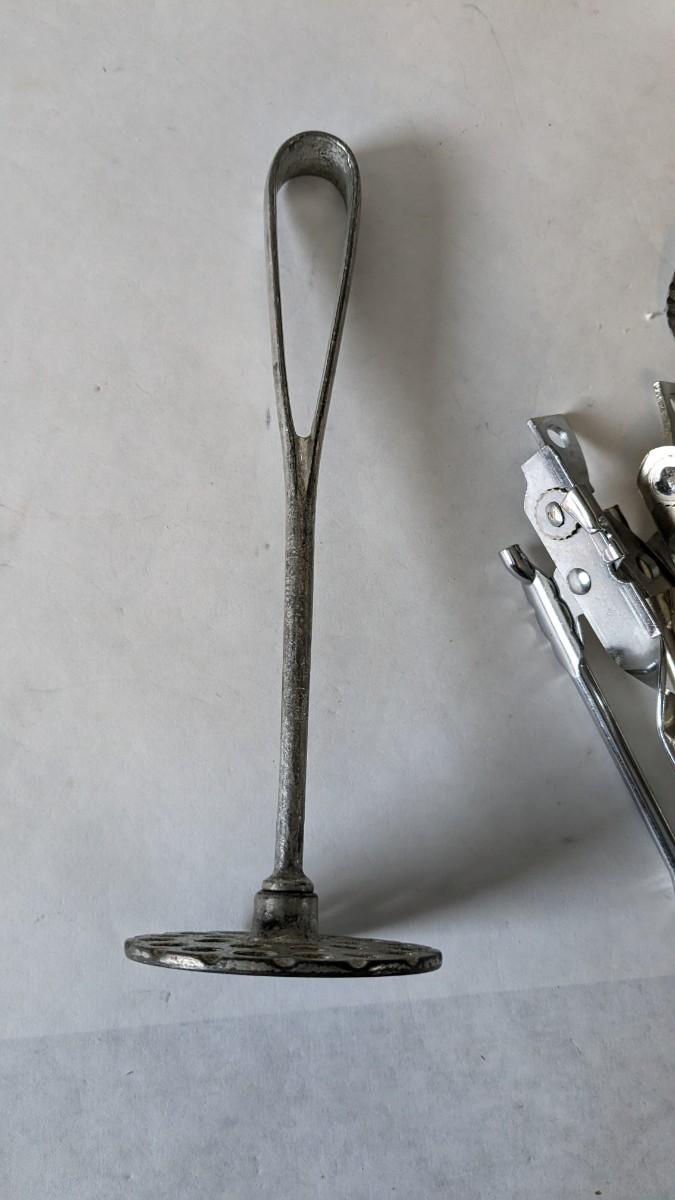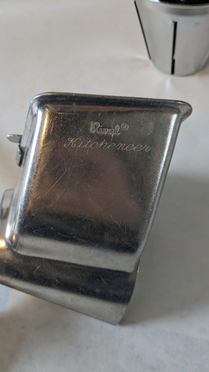 Another great little assortment of kitchen essentials for life on the farm. Includes 7 Speas Co U-Save It glass pitchers with 2.5" threaded openings, apple peeler/corer/slicer with manual, 2 countertop grinders with attachments and stand, various utensils, and beautiful early blender in original box not damage on bottom of glass base that is easily hidden with display. No shipping