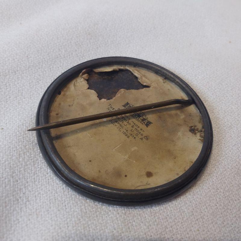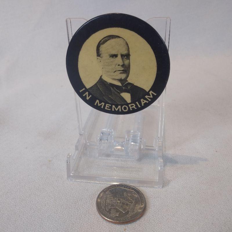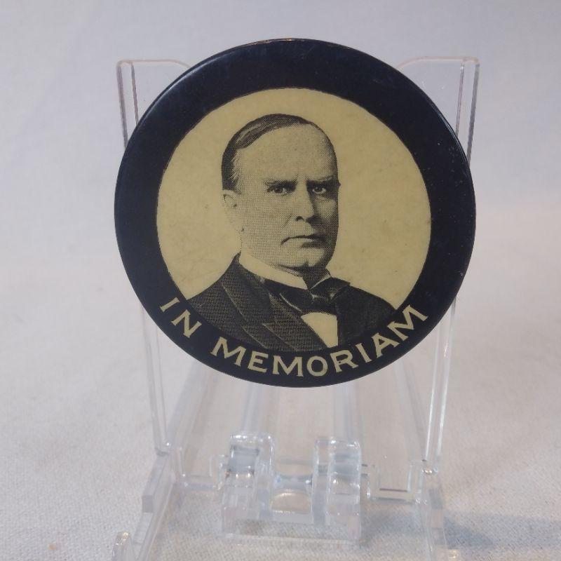 President McKinley In Memoriam Pin. This is an original button made in honor of President McKinley, our 25th President who was assassinated on September 14, 1901 . Marked on back Patent Pending April 2, 1896 and dated July 21, 1896. It is in very good condition. Large pin - 2-inches in diameter.