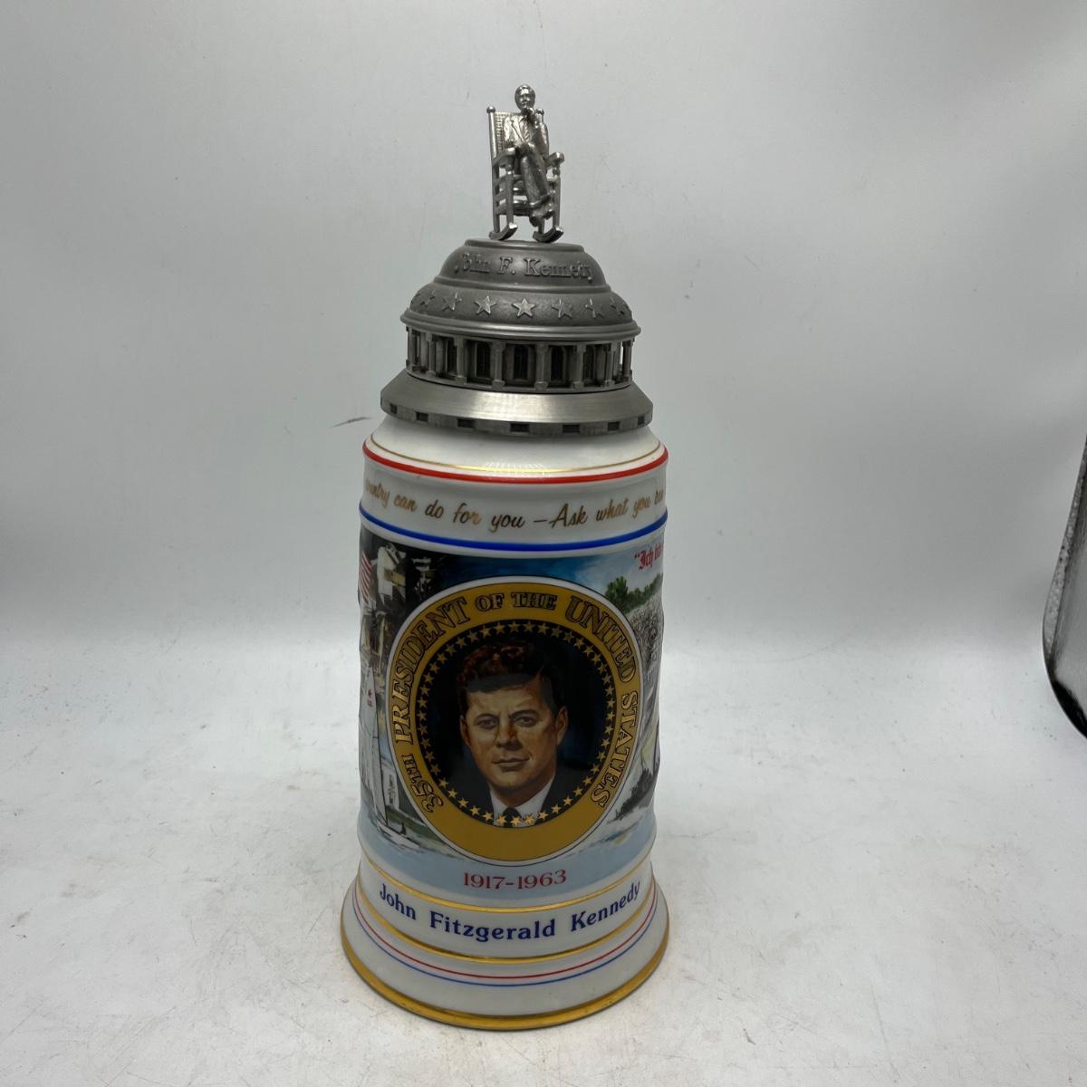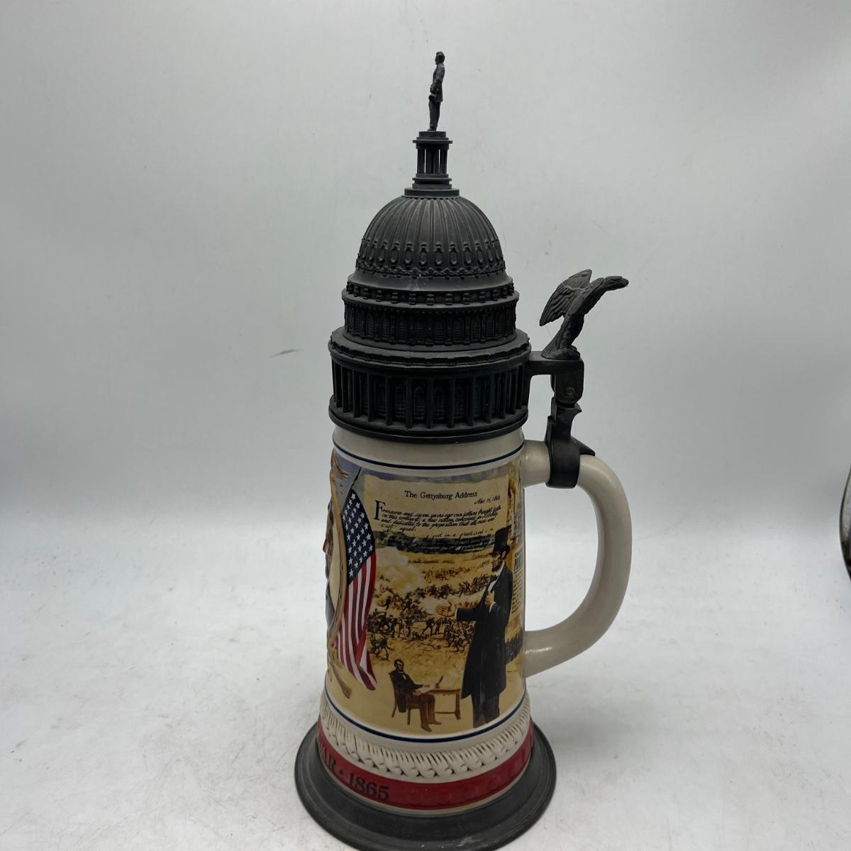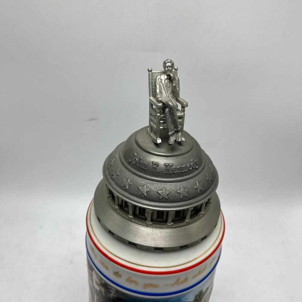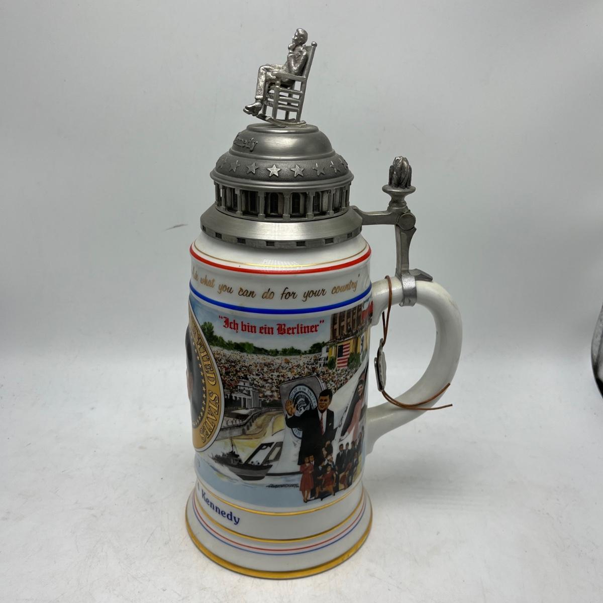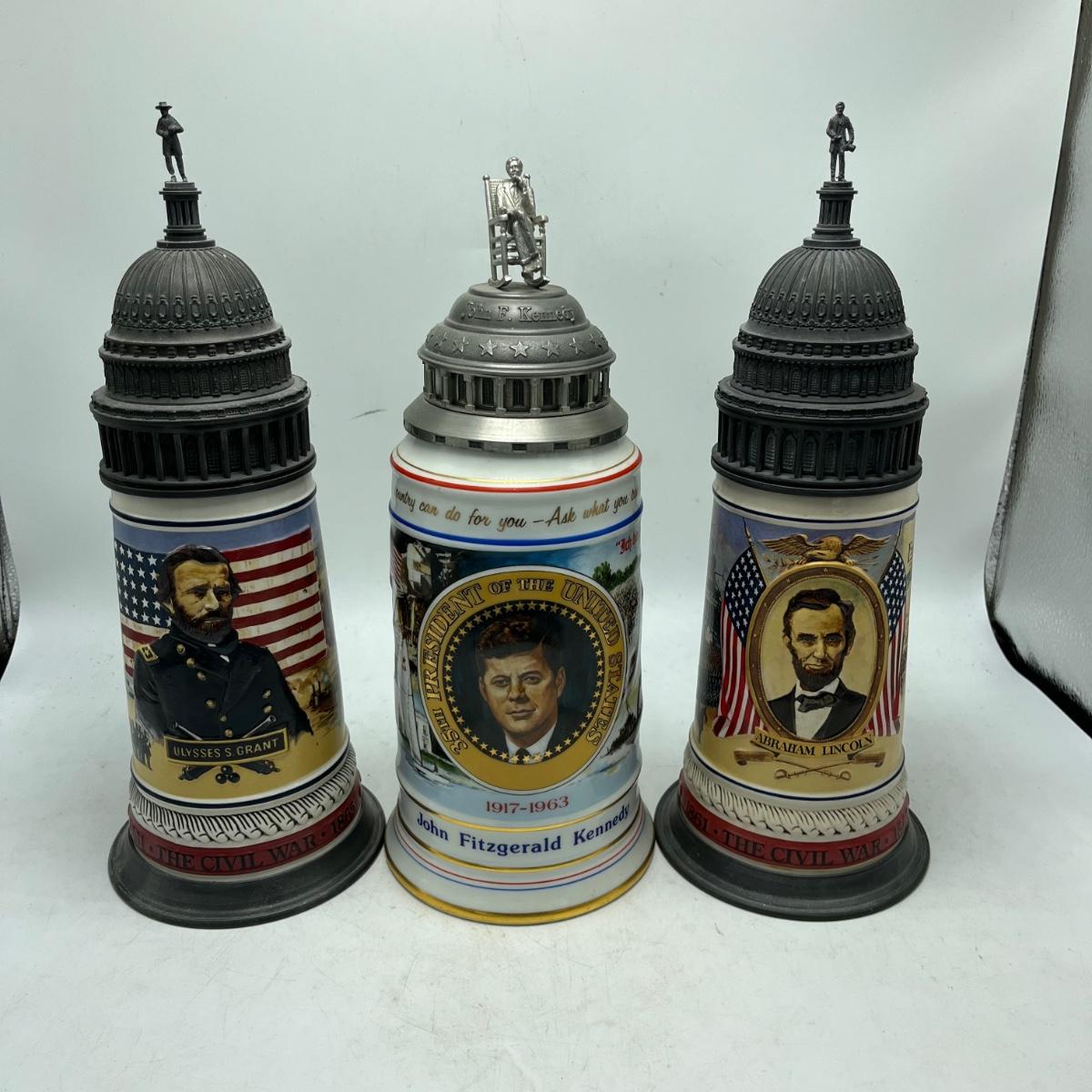 Lot includes two Anheuser Busch steins featuring Ulysses S Grant and Abraham Lincoln and a American Heritage stein featuring John F Kennedy. Tallest stein measures 5” x 5.5” x 13”.