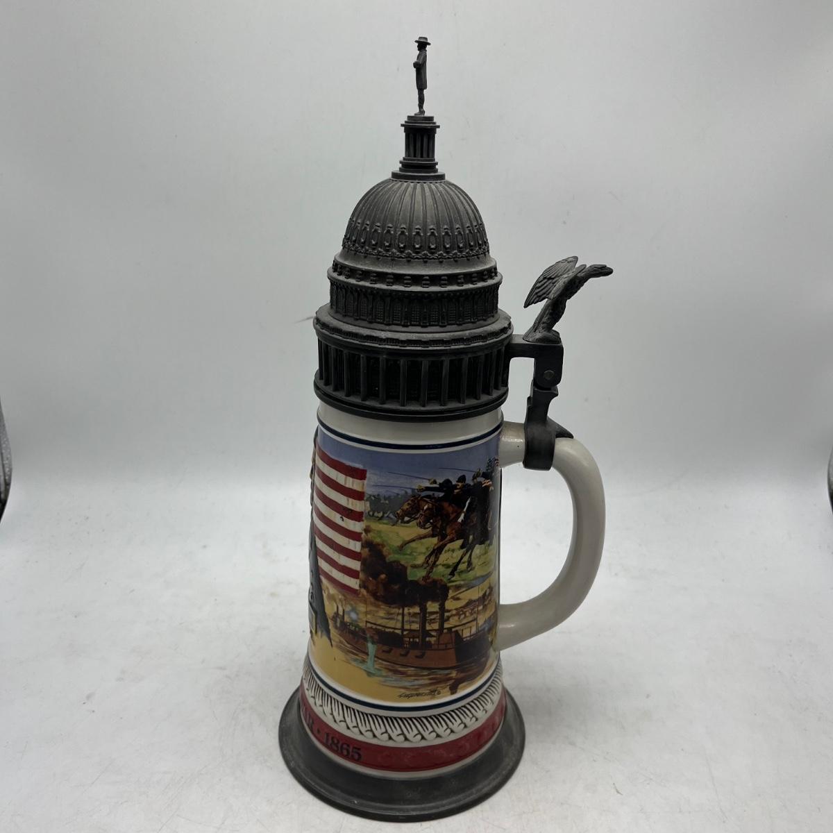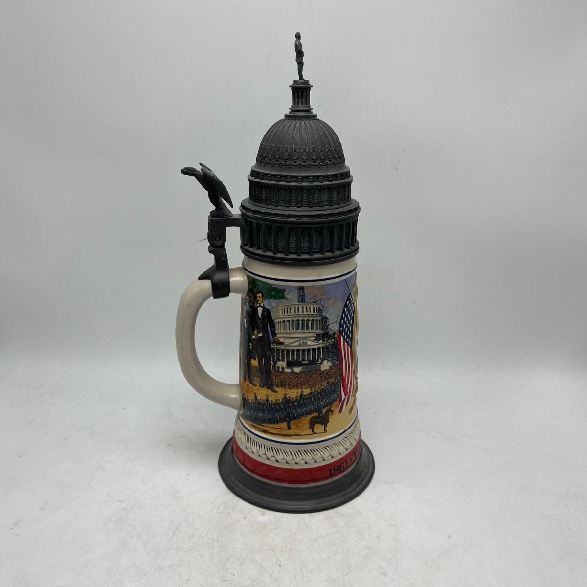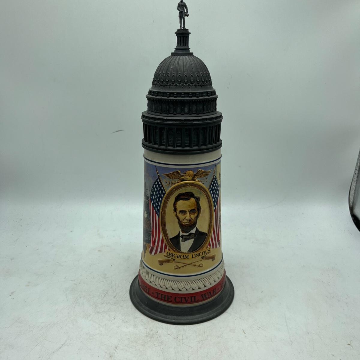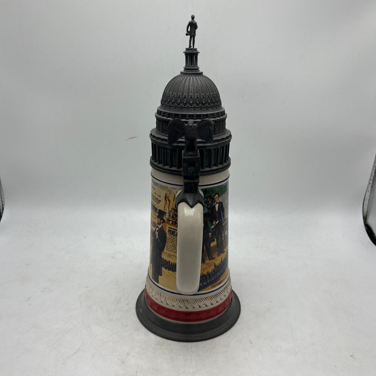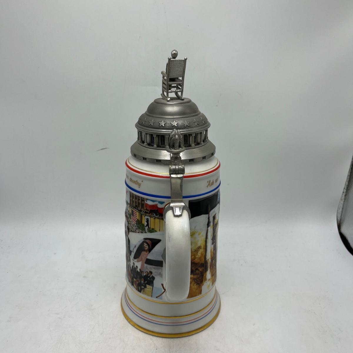 Lot includes two Anheuser Busch steins featuring Ulysses S Grant and Abraham Lincoln and a American Heritage stein featuring John F Kennedy. Tallest stein measures 5” x 5.5” x 13”.