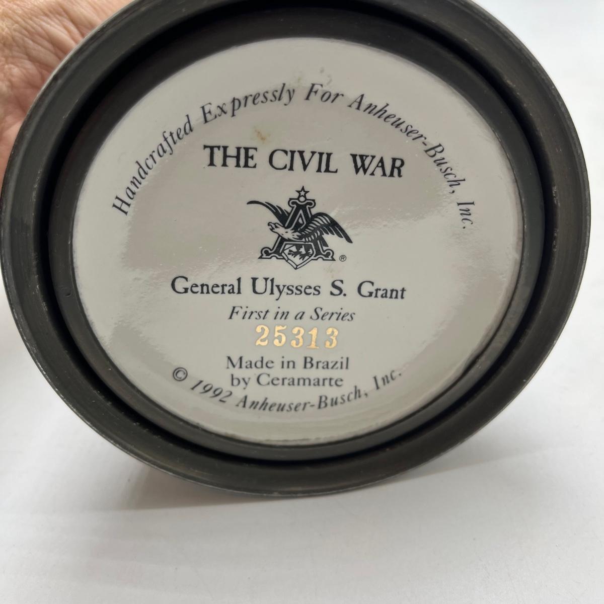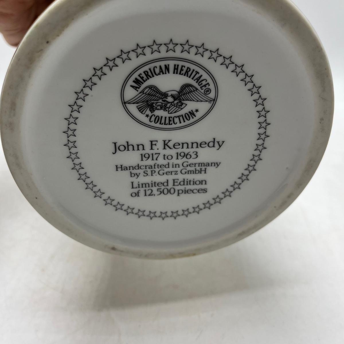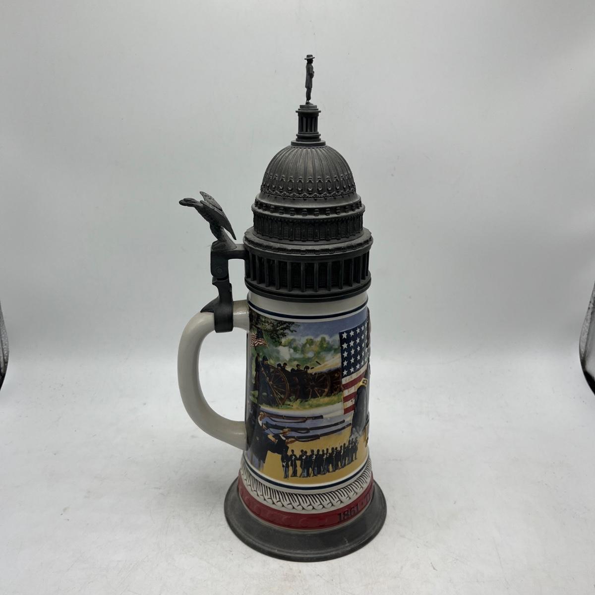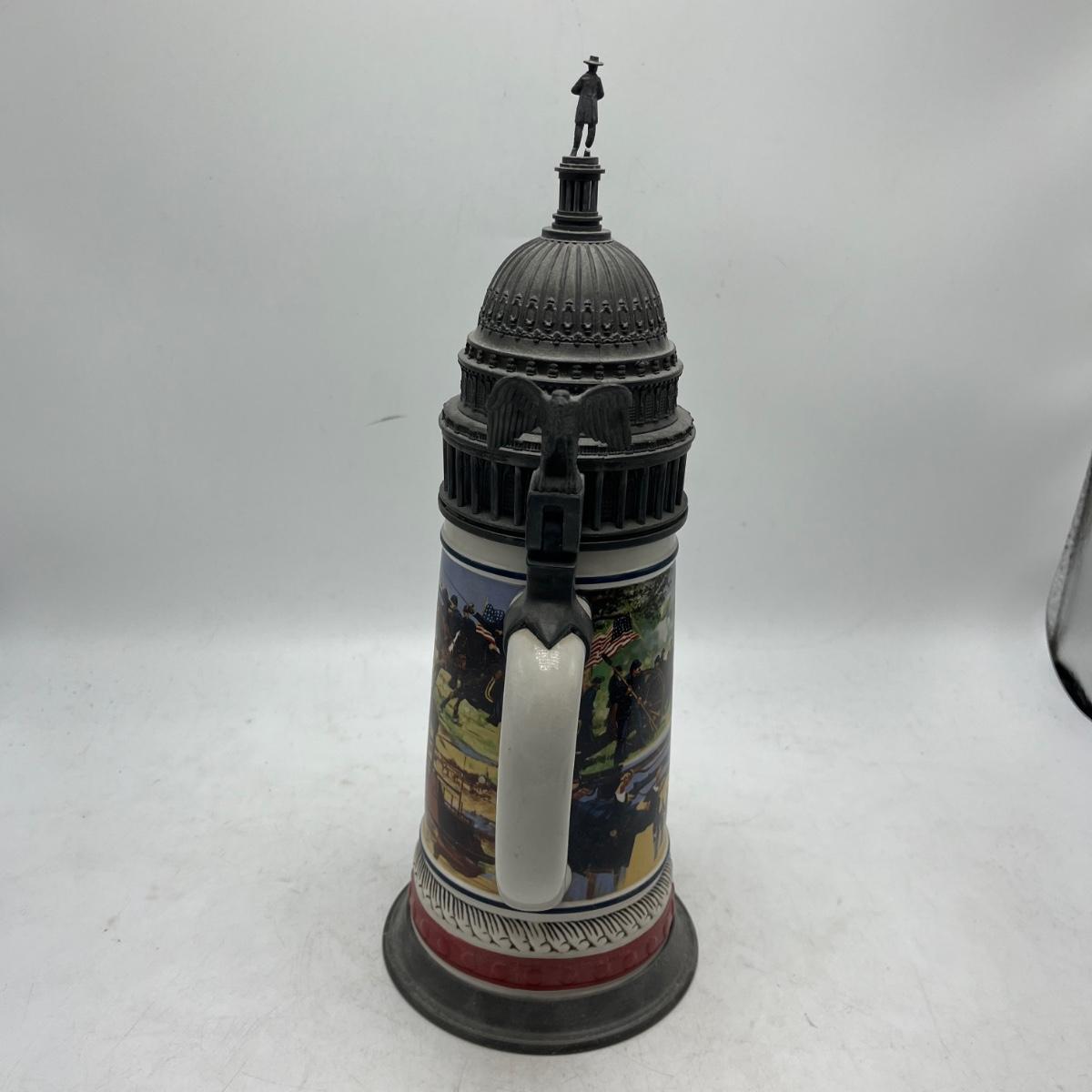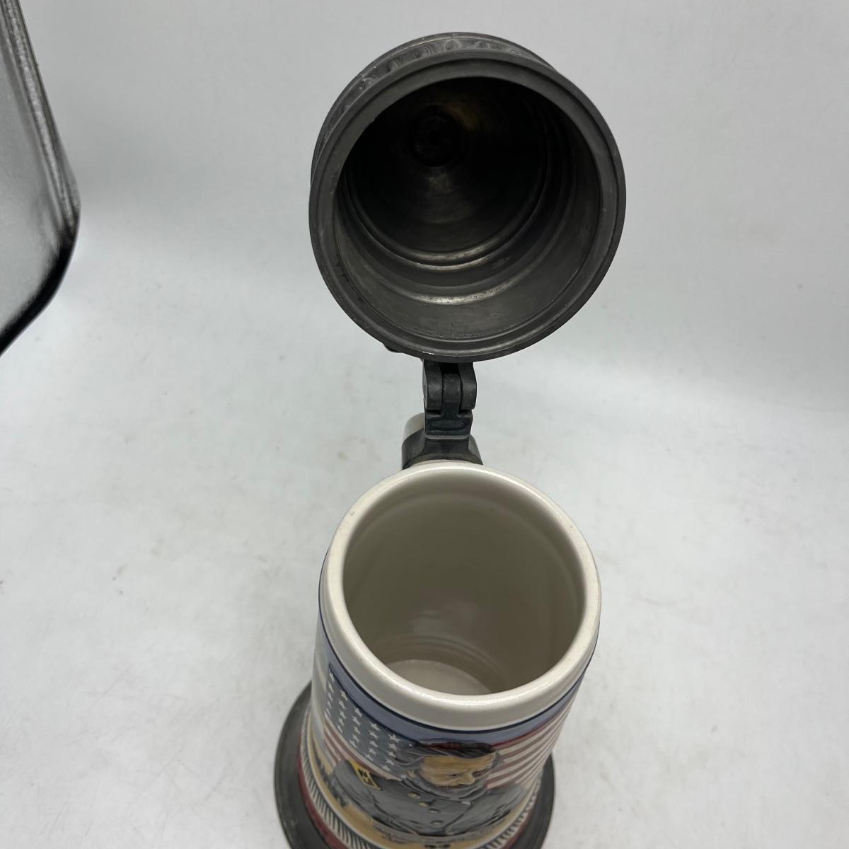 Lot includes two Anheuser Busch steins featuring Ulysses S Grant and Abraham Lincoln and a American Heritage stein featuring John F Kennedy. Tallest stein measures 5” x 5.5” x 13”.