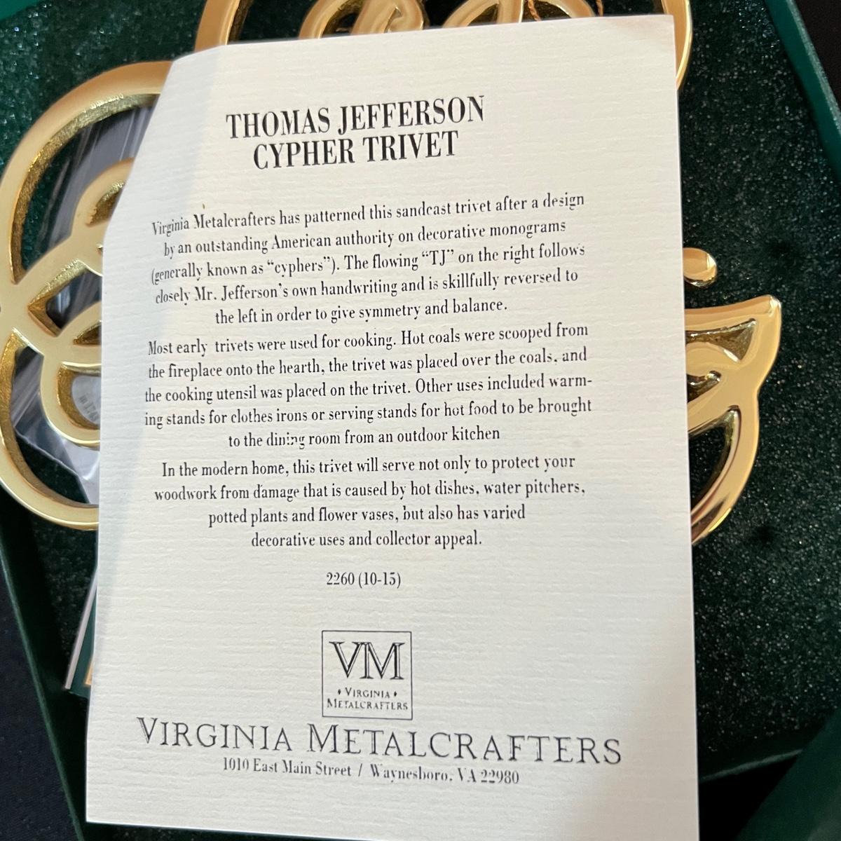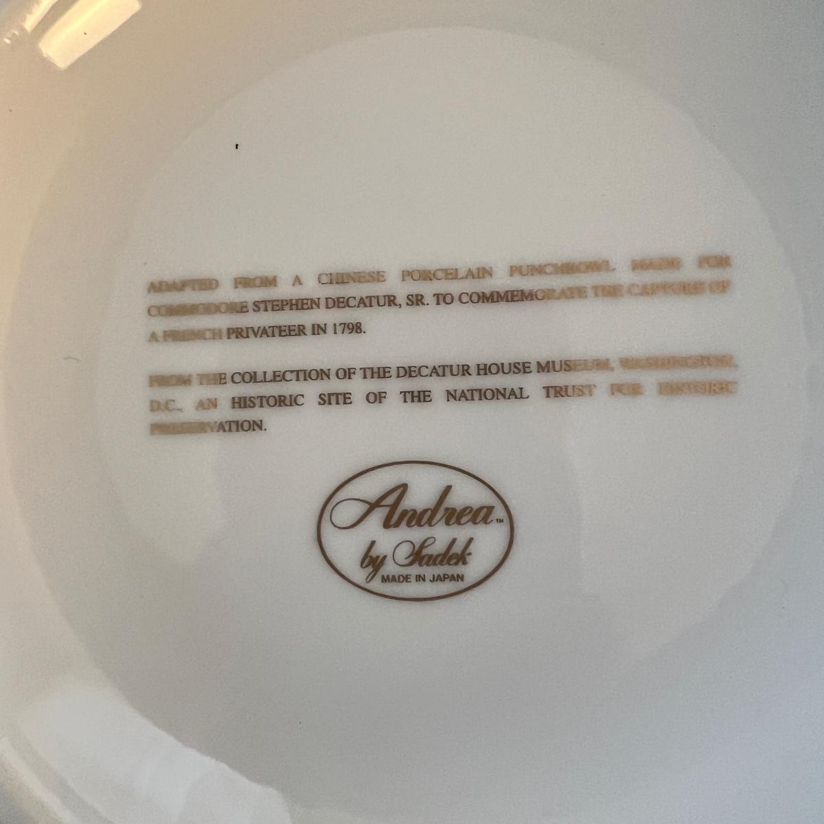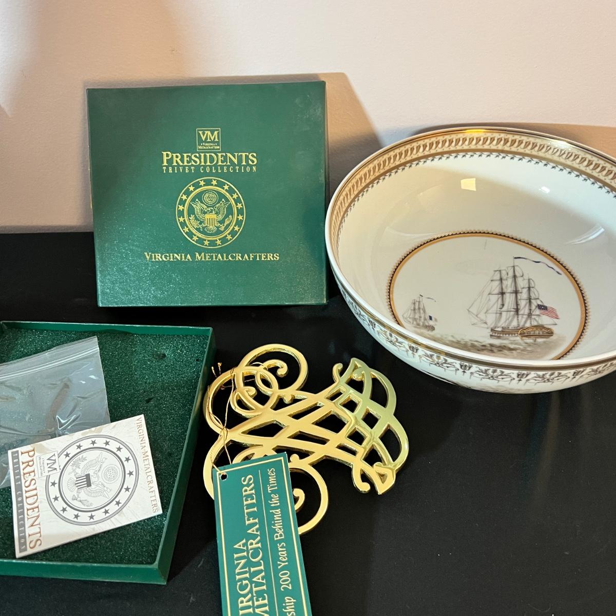 Andrea By Sadek Porcelain Punch Bowl, replica to commemorate a pirate capture. Beautiful gold accents, excellent condition. New in box vintage Virginia Metalcrafters brass trivet honoring President Thomas Jefferson. NOTE: PICK UP ONLY IN DUNKIRK MD.
