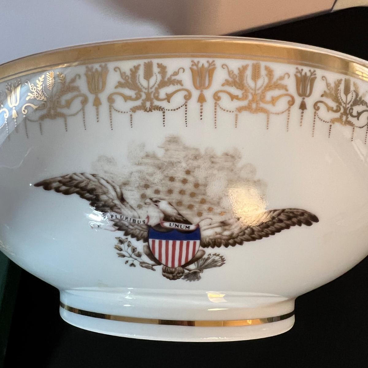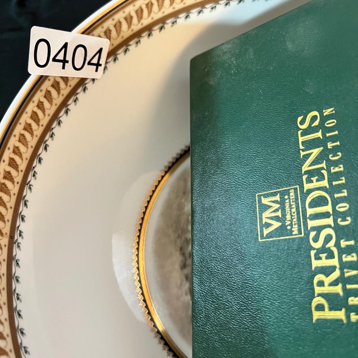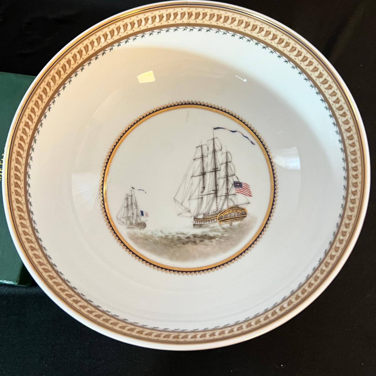 Andrea By Sadek Porcelain Punch Bowl, replica to commemorate a pirate capture. Beautiful gold accents, excellent condition. New in box vintage Virginia Metalcrafters brass trivet honoring President Thomas Jefferson. NOTE: PICK UP ONLY IN DUNKIRK MD.